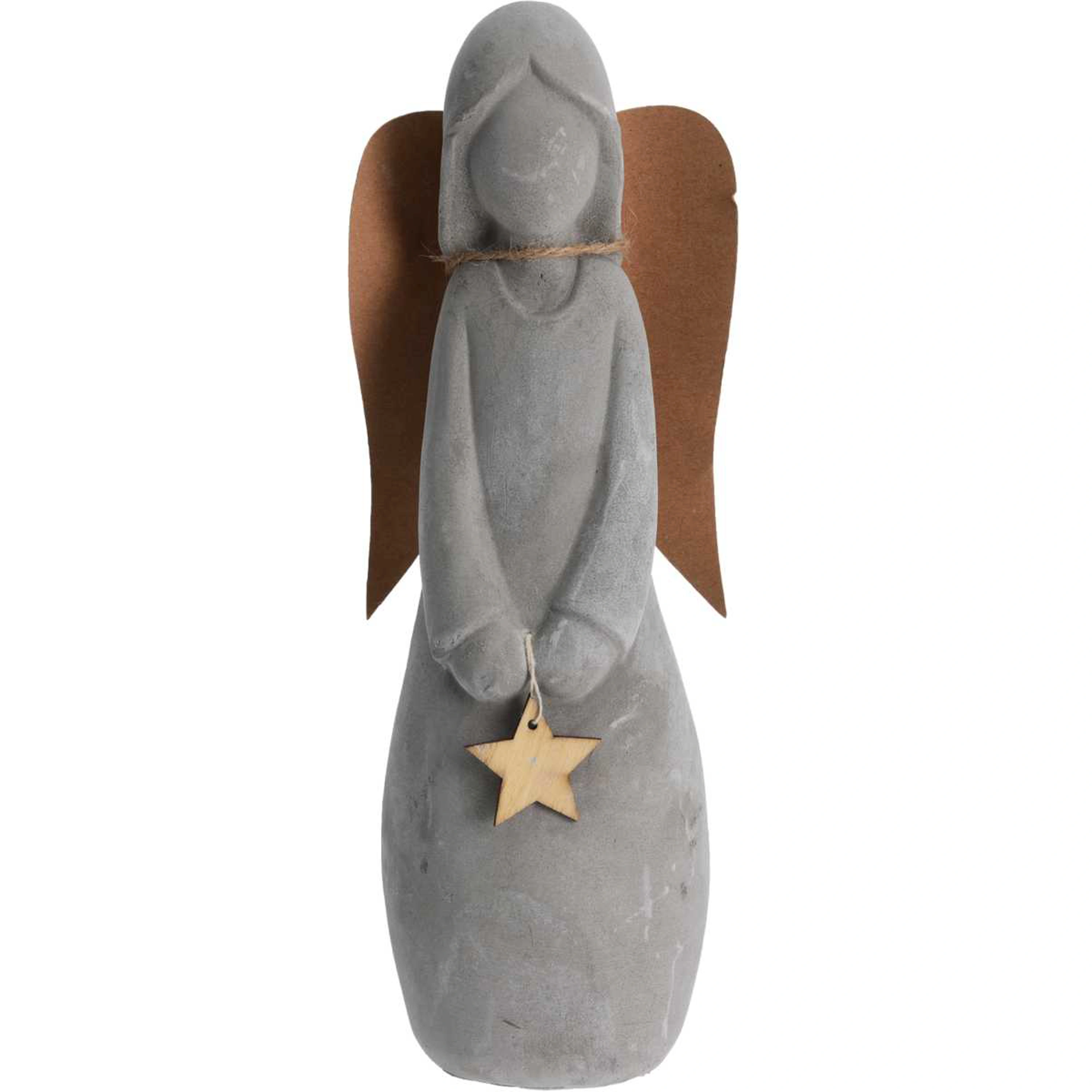 Figúrka anjela je svetlo šedej farby s hnedými krídlami a pôsobí veľmi jemne.