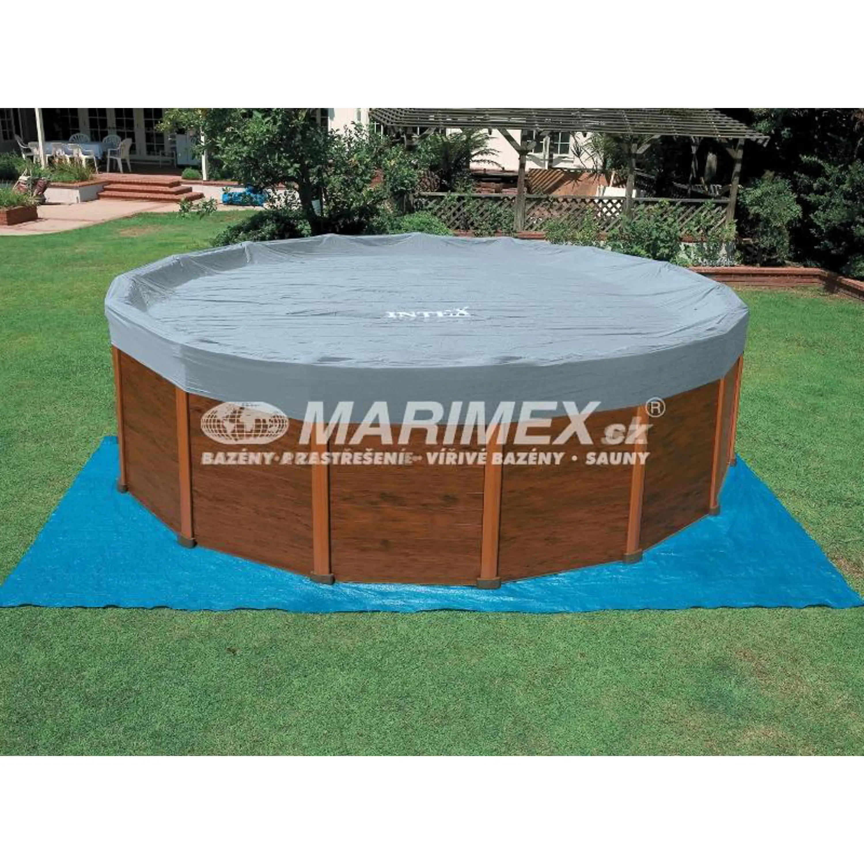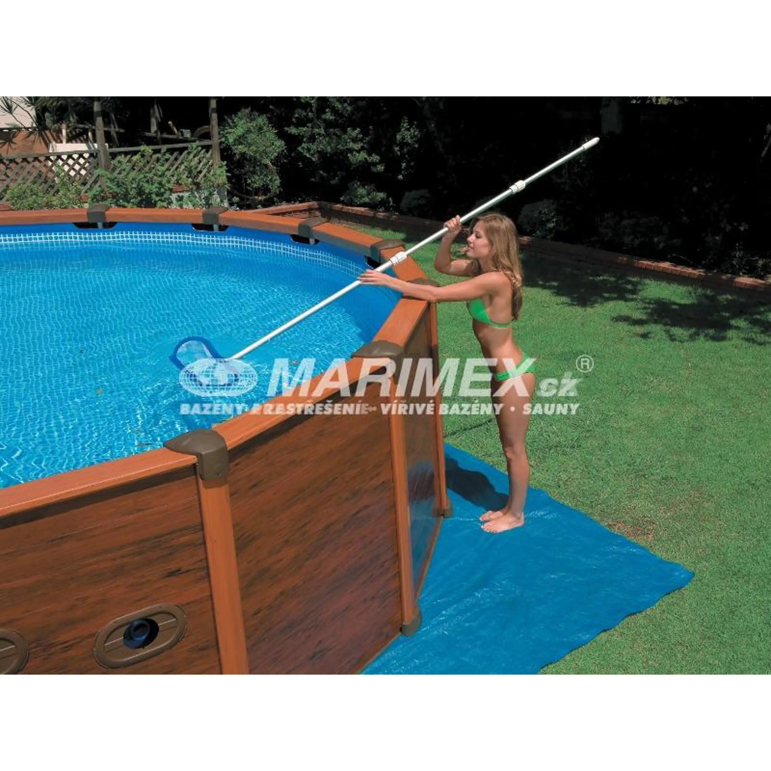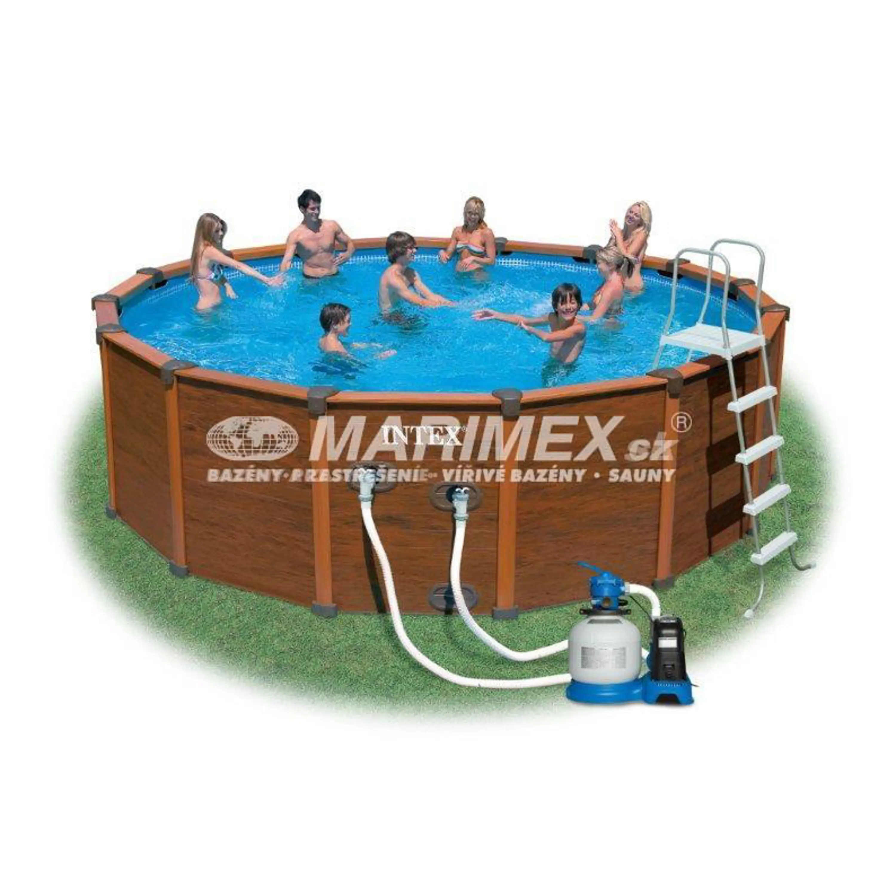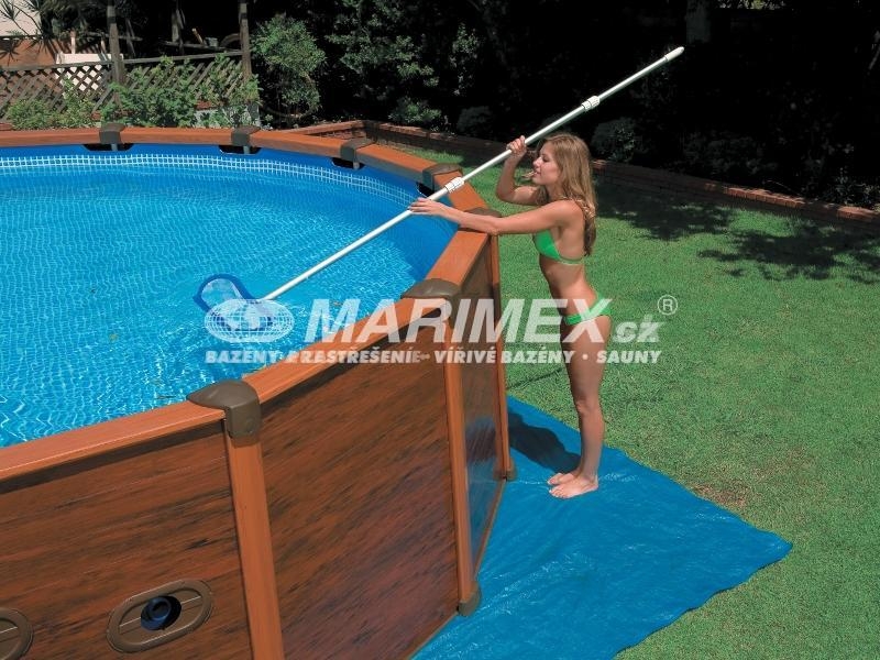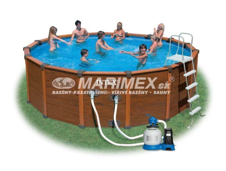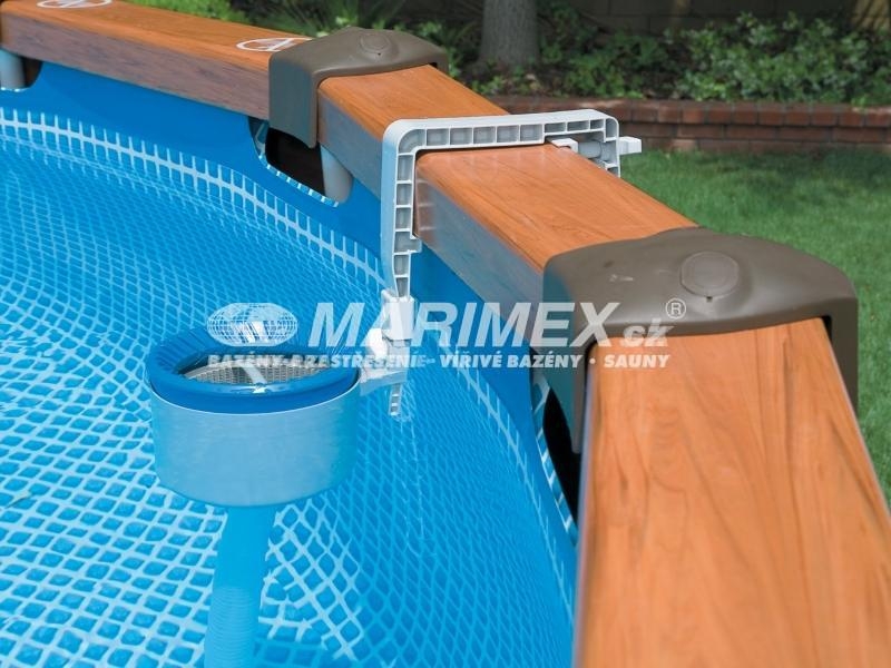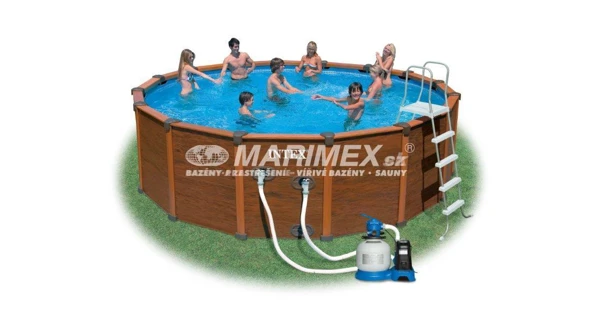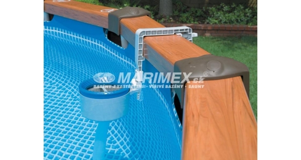 Bazén s kovovou konštrukciou a obkladom s imitáciou dreva. Tento rám je silnejší ako tradičné okrúhle kovové rámy, rovnako tak jeho dizajnovo pekne riešená imitácia dreveného obkladu. Je jednoducho zostaviteľný a jednotlivé kusy lepšie zapadnúť do seba. Nie sú potrebné žiadne ďalšie upínacie kolíky.