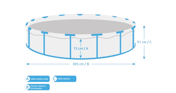 Uvedené rozmery bazéna sú iba orientačné a ovplyvniť ich môže rovnosť podkladu či objem napustenej vody. Povolená výrobná tolerancia je 5%.