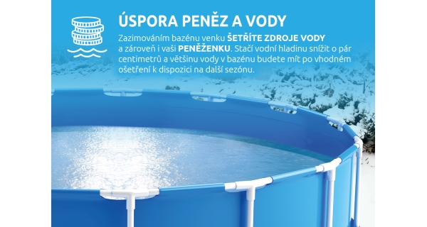 Úspora peňazí a vodyZimovanie bazéna vonku šetrí vodné zdroje a znižuje náklady na vodné a stočné. Správne upravená voda v bazéne vydrží až do ďalšej kúpacej sezóny a bazén nie je potrebné úplne dopĺňať. |