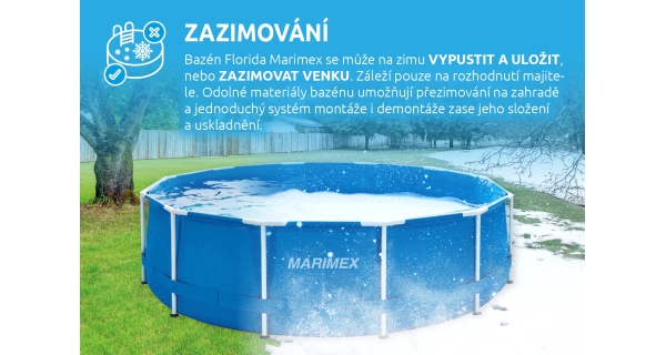 Bazén Florida Marimex môžete zazimovať a ponechať vonku, alebo ho vypustiť a zložiť. Pokiaľ sa rozhodnete uložiť ho, bazén je potrebné vypustiť, umyť od nečistôt, osušiť a uložiť na suché miesto, kde nemrzne. Je vhodné ho v priebehu zimy občas preskladať, aby vo fólii nevznikali prehyby. Pokiaľ sa bazén rozhodnete ponechať na záhrade, je potrebné upustiť vodu, odpojiť filtráciu a ďalšie príslušenstvo a do bazéna aplikovať chemické prípravky na zazimovanie bazéna.