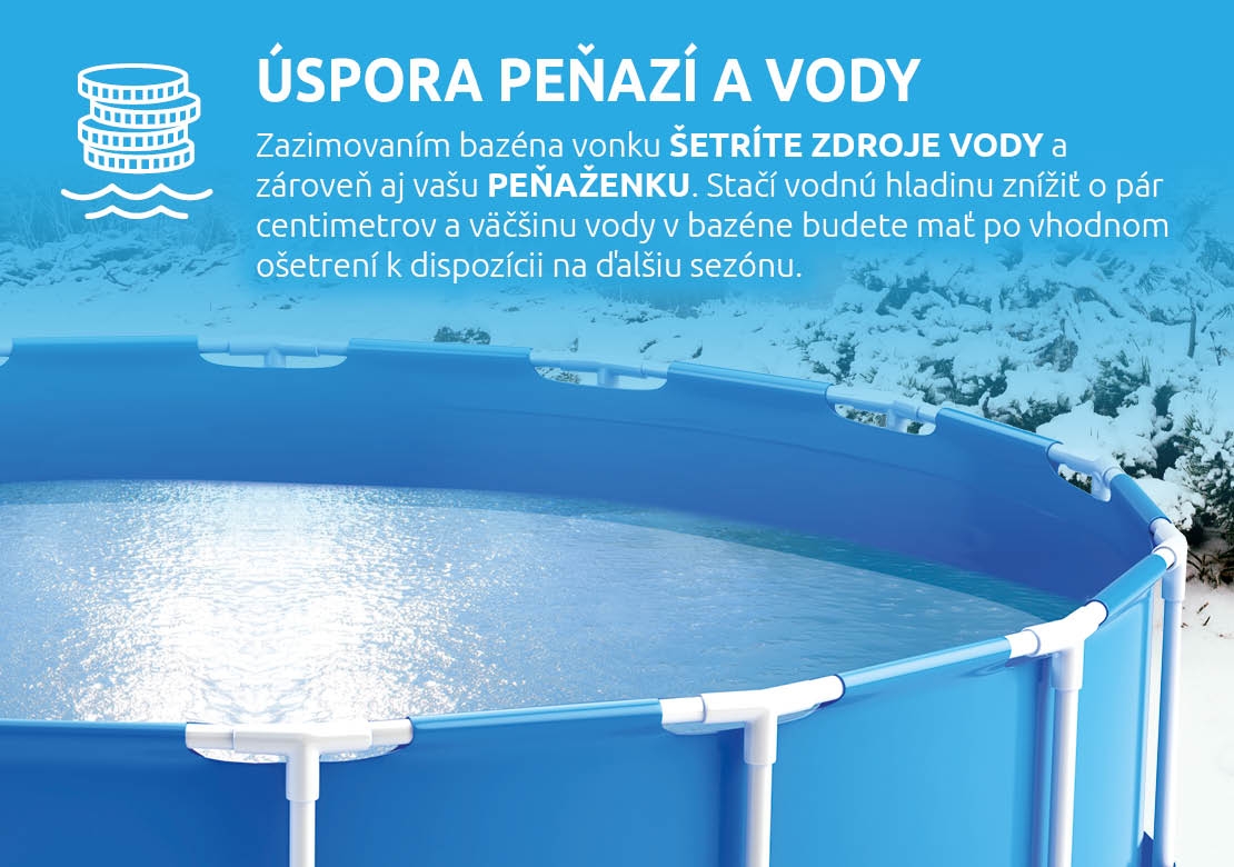 Úspora peňazí a vodyZimovanie bazéna vonku šetrí vodné zdroje a znižuje náklady na vodné a stočné. Správne upravená voda v bazéne vydrží až do ďalšej kúpacej sezóny a bazén nie je potrebné úplne dopĺňať. |