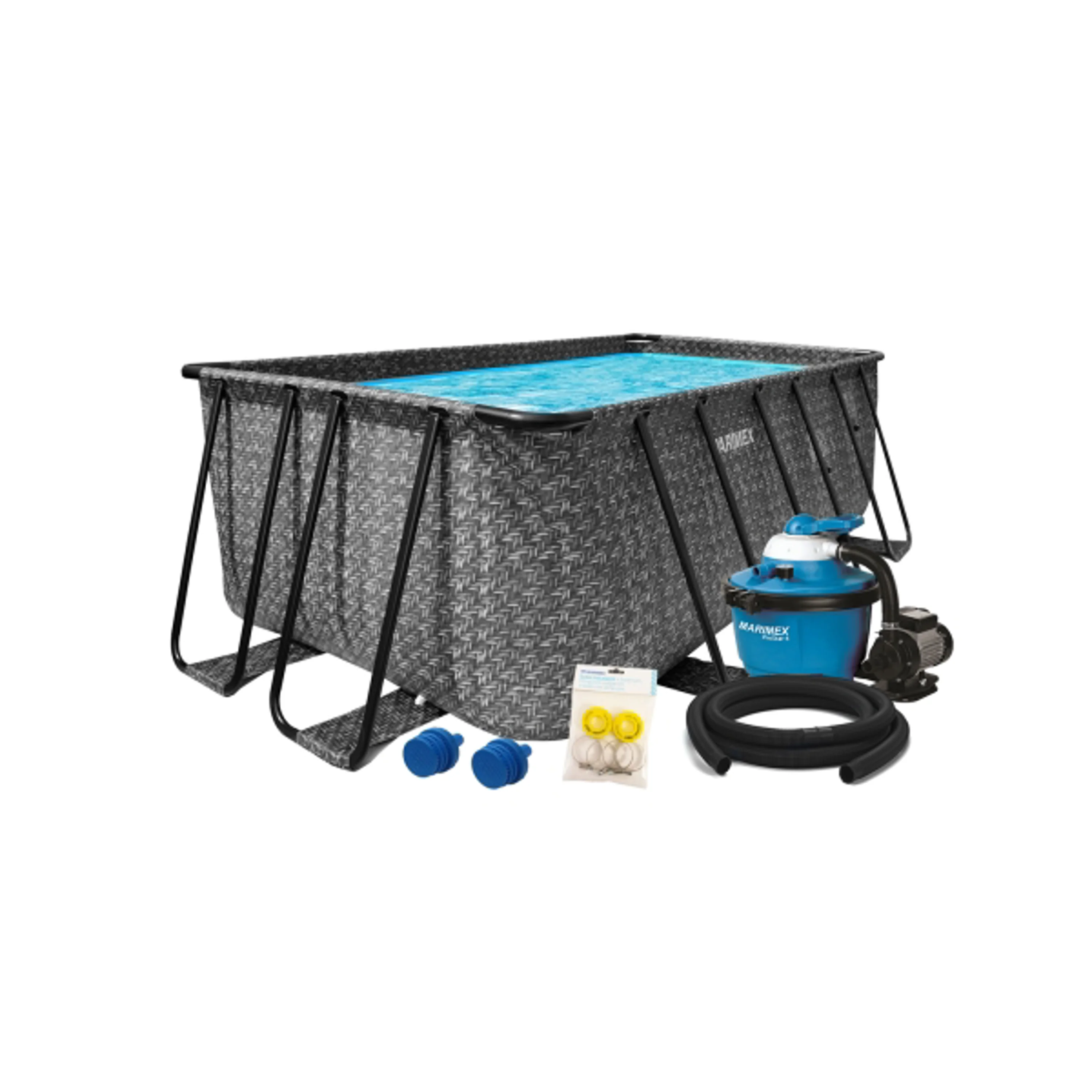 Bazénový set obsahuje všetky potrebné diely na prepojenie bazéna a filtrácie (napr. hadice, pásky na upevnenie hadíc, apod.).