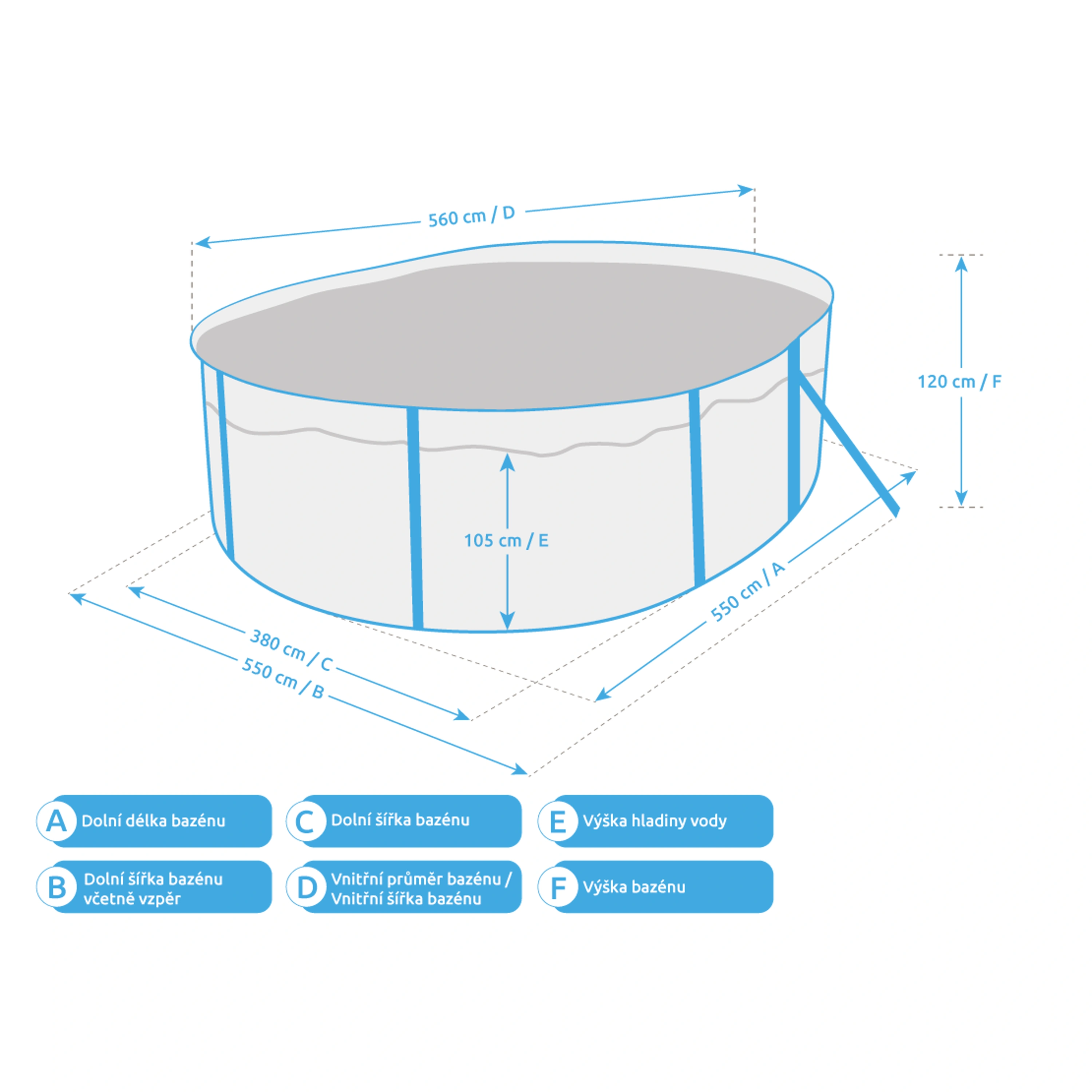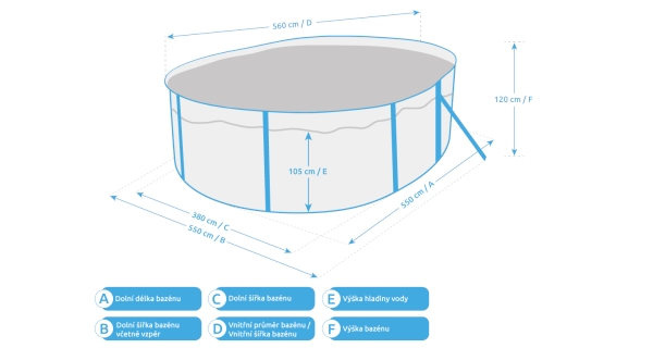 Uvedené rozmery bazéna sú iba orientačné a ovplyvniť ich môže rovnosť podkladu či objem napustenej vody. Povolená výrobná odchýlka je 5 %.