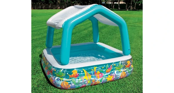 Detský nafukovací bazénik so strieškou, ktorá chráni pred slnkom, pripevňuje sa pomocou suchého zipsu. Nafukovacie hračky a potreby Intex spĺňajú najprísnejšie bezpečnostné normy na spracovanie a použité materiály. Vyrobené z testovaného masívneho vinylu. Proti poškodeniu odporúčame dokúpiť podložku.