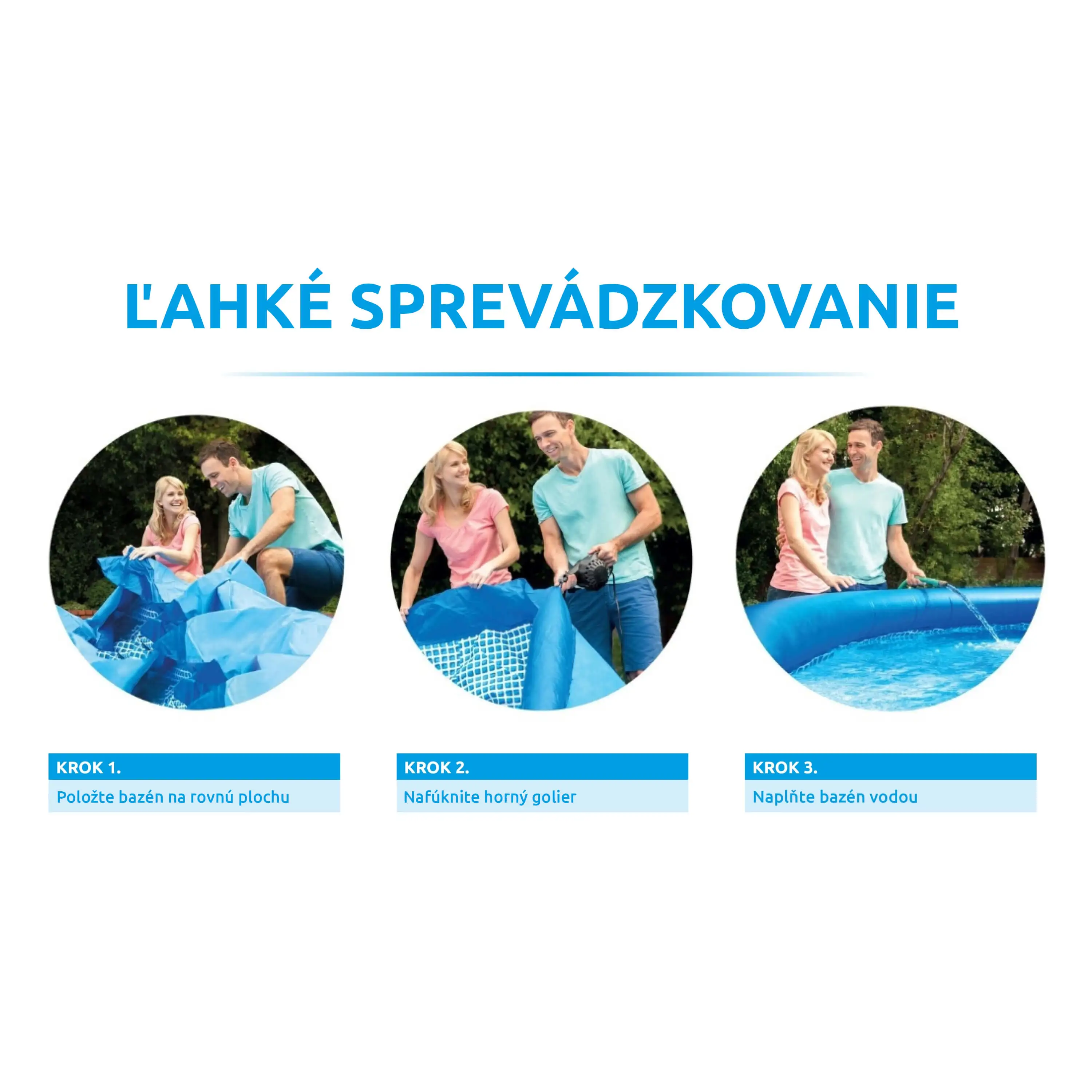 Ďalšou výhodou je ľahká údržba a rýchle sprevádzkovanie. Stačí len pripraviť miesto na bazén, rozvinúť bazénovú podložku, bazén rozbaliť, nafúknuť horný golier a začať púšťať vodu. Stúpajúca voda sama bazén postaví. Od vybalenia bazéna môžete do 10 minút napúšťať vodu. Bazén je nutné po skončení bazénovej sezóny vyčistiť, vypustiť a upratať na suché, nemrznúce miesto. Správnou údržbou predĺžite životnosť bazéna.