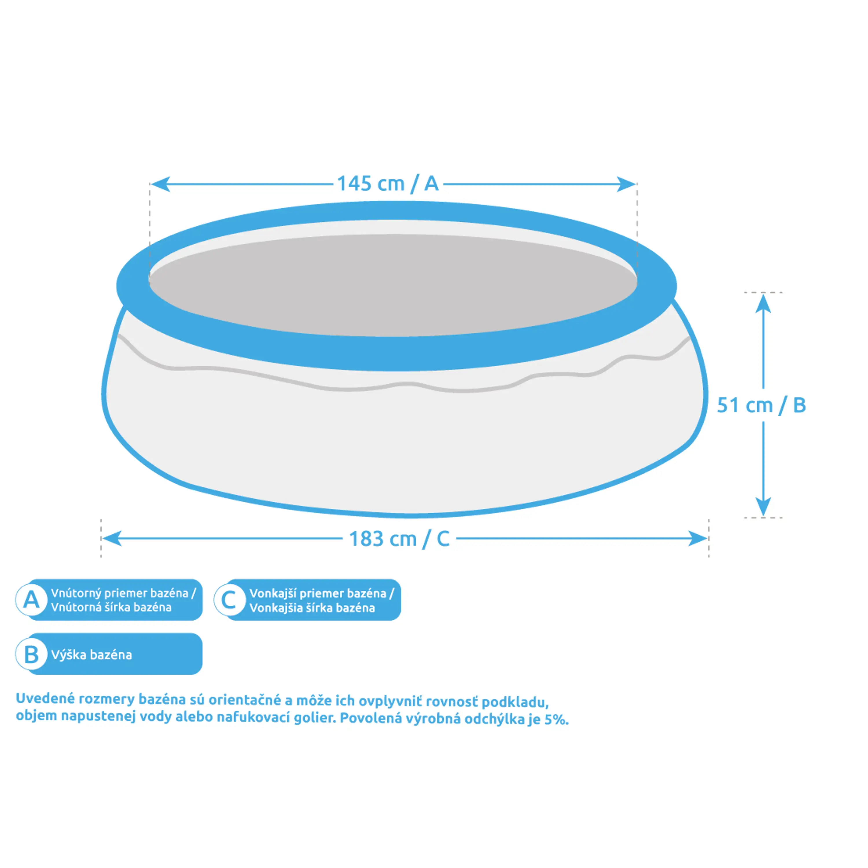 Uvedené rozmery bazéna sú len orientačné a ovplyvniť ich môže rovnosť podkladu, objem napustenej vody alebo nafúknutie goliera. Povolená výrobná odchýlka je 5%.