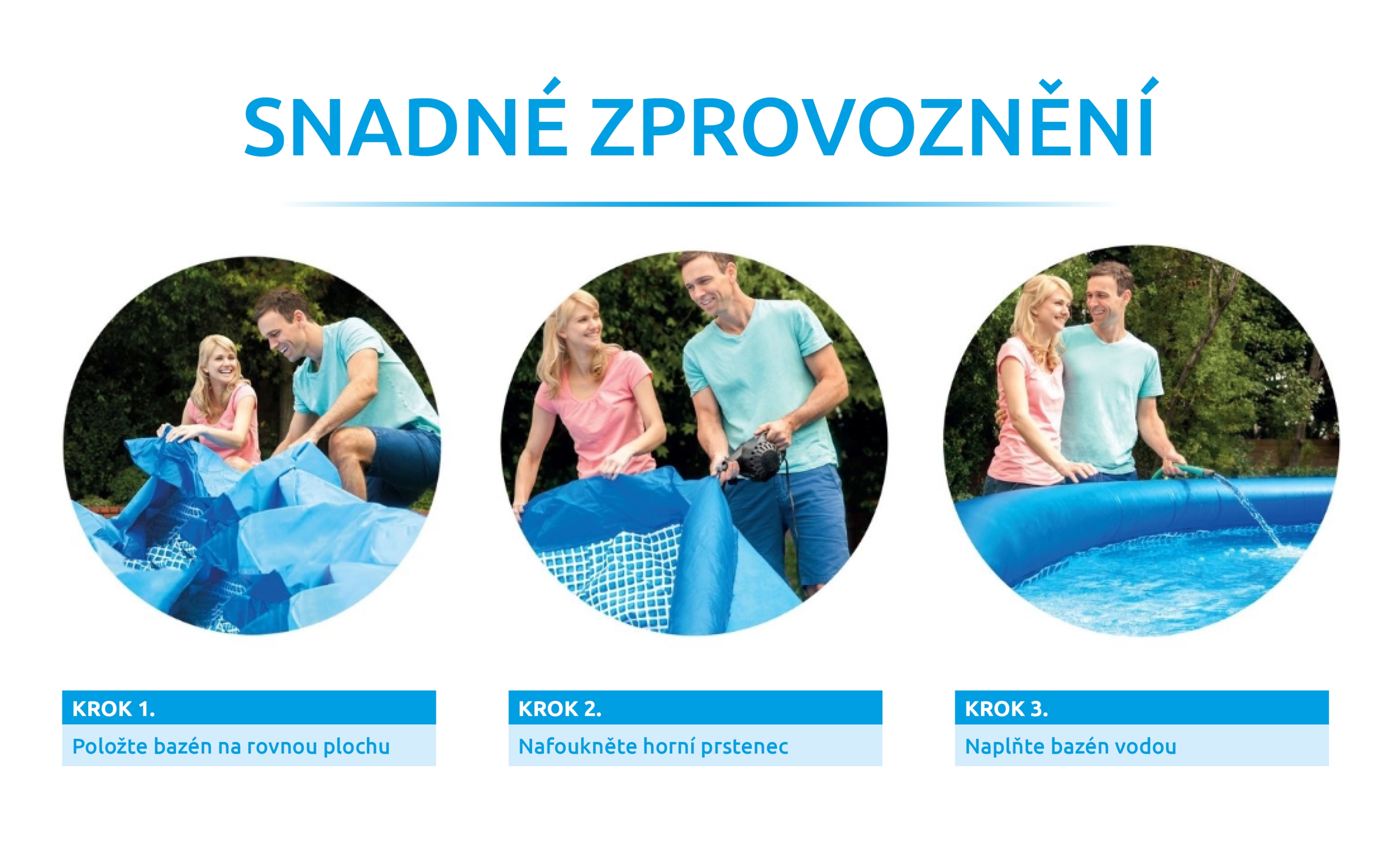 Jednoduchá montážBazén Tampa je možné postaviť bez stavebných úprav pozemku. Stačí len nafúknuť horný prstenec a začať napúšťať vodu. Stúpajúca vodná hladina sama postaví steny bazéna. |