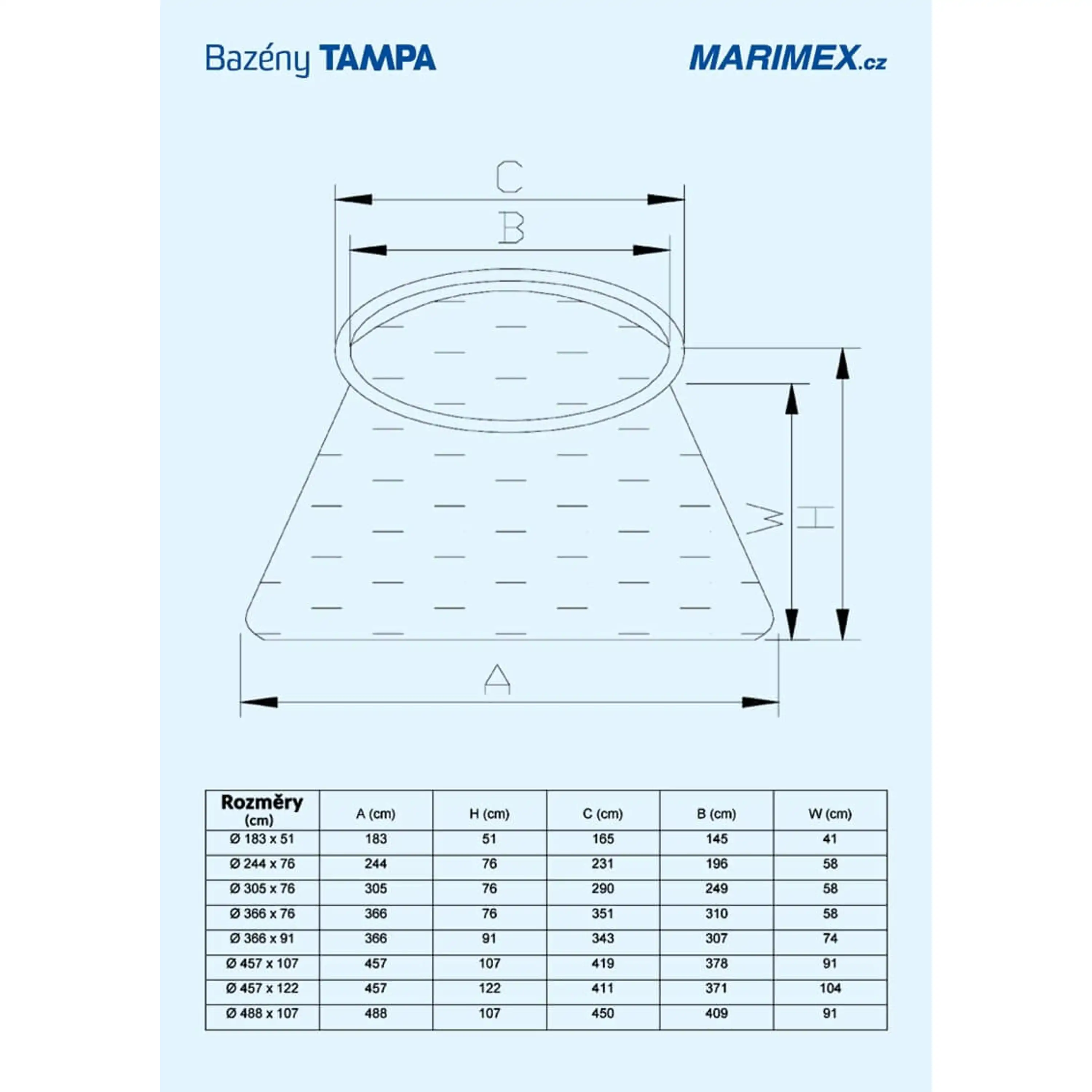 Tolerancia rozmerov bazéna:Uvedené rozmery bazéna sú iba orientačné a ovplyvniť ich môže rovnosť podkladu, objem napustenej vody alebo nafúknutie goliera. Povolená výrobná tolerancia je 5%.