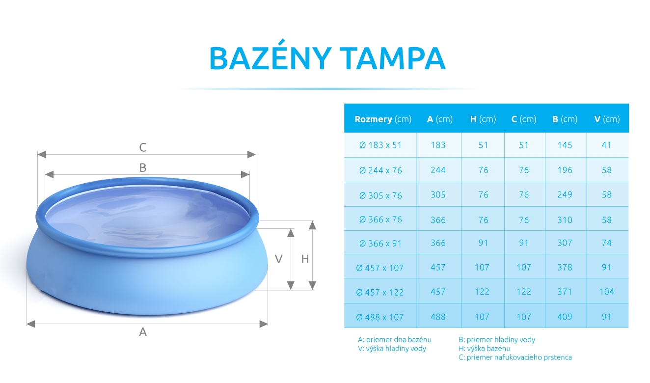 Bazén Tampa sa radí medzi najpredávanejšou a najobľúbenejšie bazény v Slovenskej republike. Kúpanie vo vlastnom bazéne si môže dopriať naozaj každý. Prednosťou bazéna Tampa je nízka cena, ľahká údržba i rýchle sprevádzkovanie. Stačí len pripraviť miesto na bazén, rozvinúť bazénovú podložku, bazén rozbaliť, nafúknuť hornú golier a začať napúšťať vodu. Stúpajúci voda sama bazén postaví. Od vybalení bazéna môžete do 10 minút napúšťať vodu. Bazén je nutné po skončení bazénovej sezóny vyčistiť, vypustiť a upratať na suché, nemrznúca miesto.