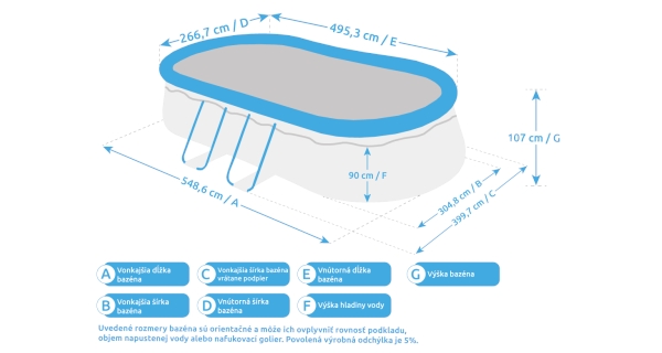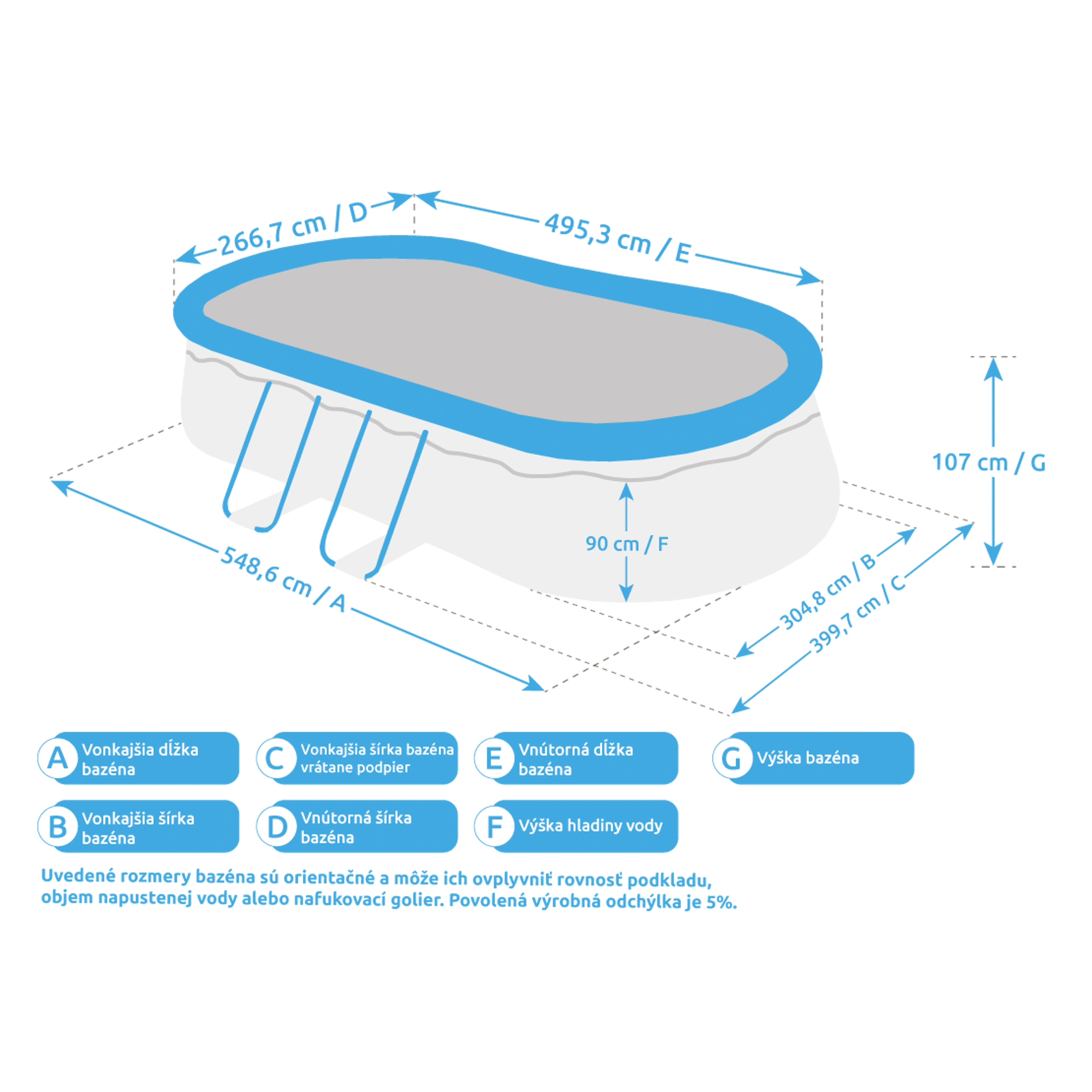 Uvedené rozmery bazéna sú len orientačné a ovplyvniť ich môže rovnosť podkladu, objem napustenej vody alebo nafúknutý golier. Povolená výrobná odchylka je 5 %.