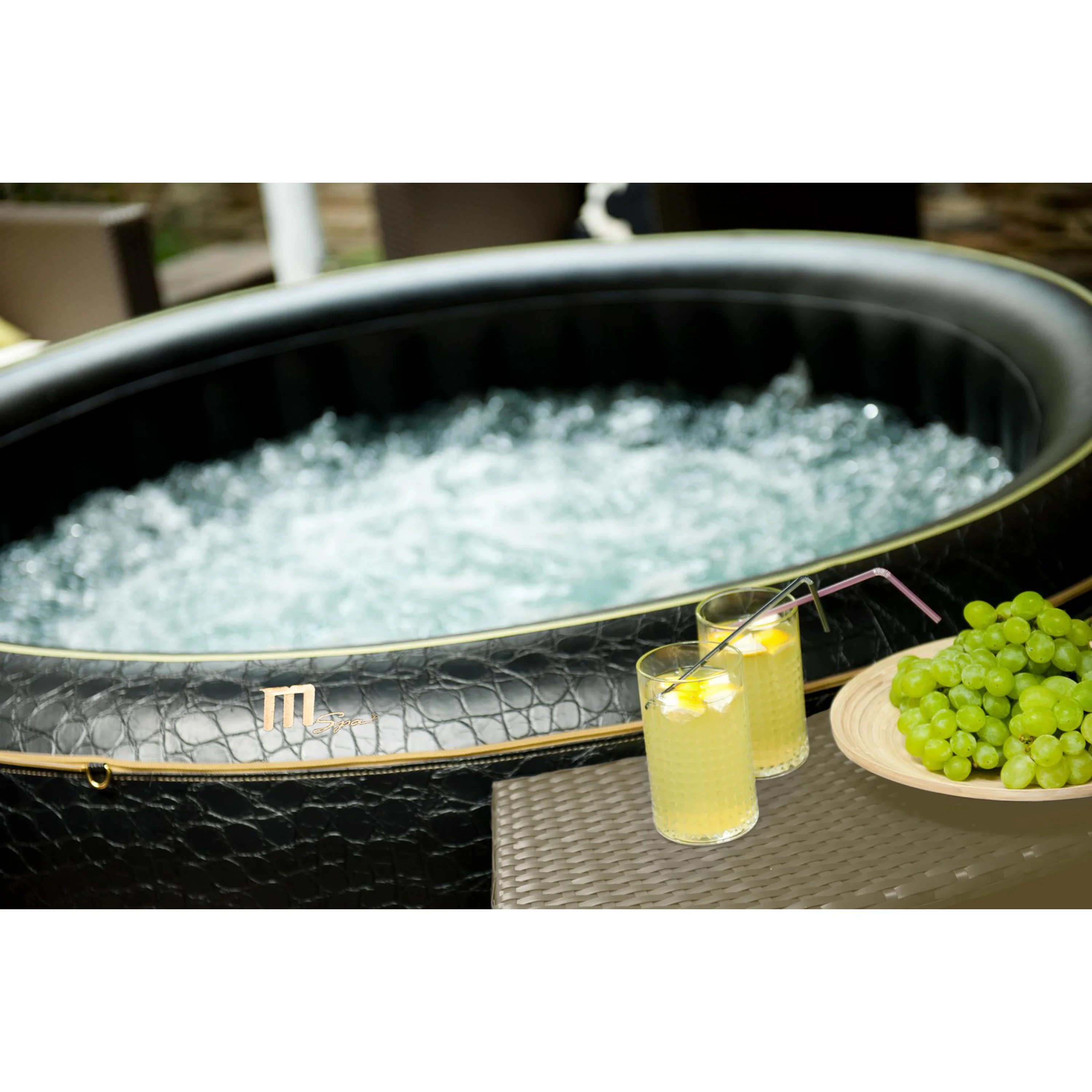 Mobilná vírivka Luxury Exotic P-EX06 až pre 6 osôb je skutočný skvost, a to nie len čo sa týka dokonalej funkcie odstupňovanej masáže. Elegantný zlatý lem s embosovaným logom MSpa označuje tú najvyššiu radu mobilných víriviek. Súčasťou balenia vírivky je aj rozkladacia penová termopodložka, ktorá Vám ušetrí náklady na vytápanie. Oproti klasickej bublinkovej fólií u štandardných modelov má tiež praktickú funkciu pri inštalácii vírivej vane - dokonale prekryje i nerovný hrboľatý terén. Stavebnú prípravu vírivky preto obmedzíte na úplné minimum. Nafukovacia vírivka MSpa Luxury Exotic je vybavená vstavanou dezinfekciou vody, čím zmiernite náklady za zakúpenú bazénovú chémiu. Rovnako je vybavená odstupňovanou úrovňou intenzity masáže. Môžete zvoliť z troch úrovní podľa ľubovoľnosti. Prvý stupeň intenzity je ideálny pre jemný a pohodový relax. Druhý a tretí stupeň je vhodný pre intenzívnejšiu masáž pri bolestiach chrbtice alebo po náročnom dni či športovom výkone. Rovnako tak sa použitie vírivky doporučuje pri prevencii aj liečbe artritídy.