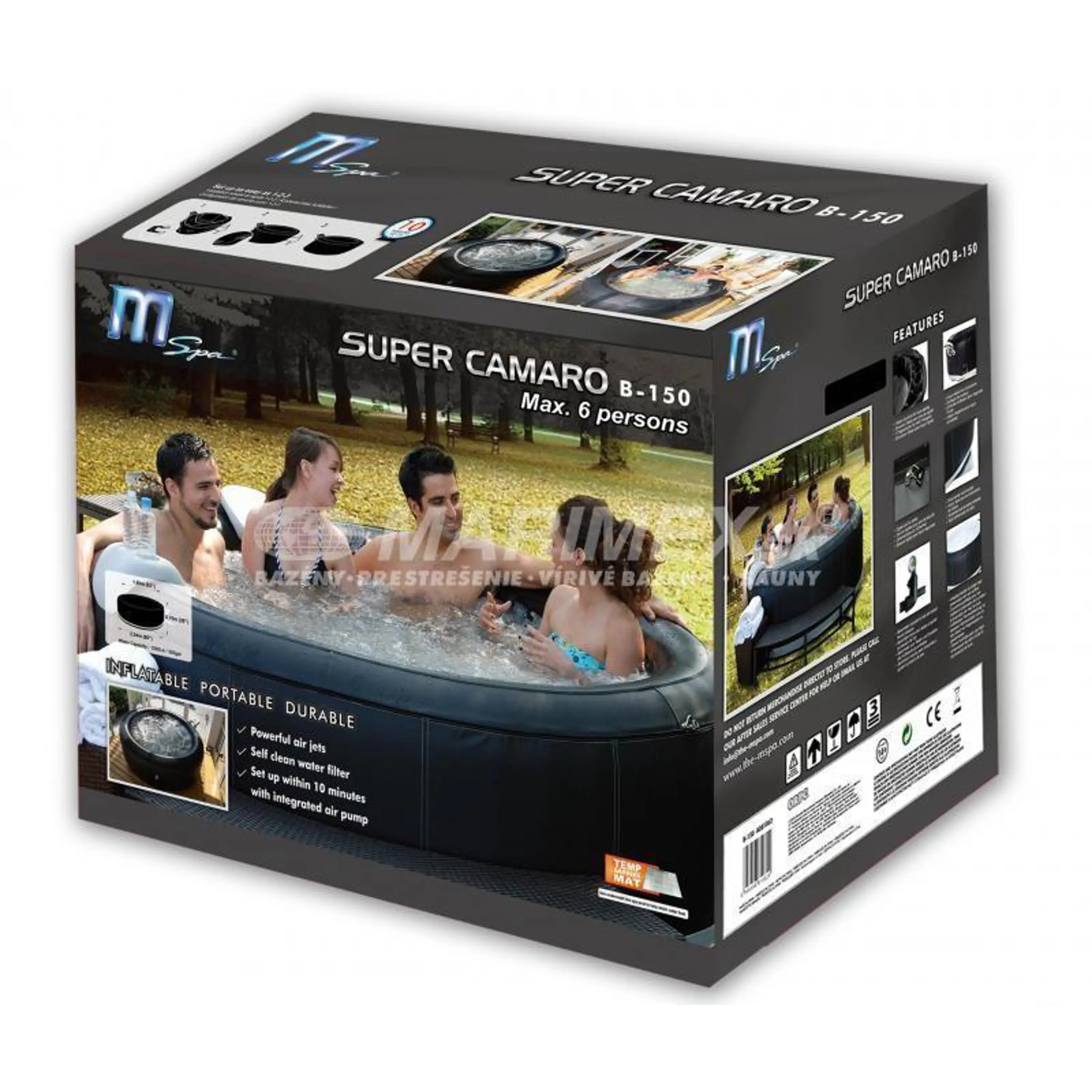 Mobilná vírivá vaňa MSpa SUPER CAMARO B-150 nastavila štandard mobilných víriviek naozaj vysoko. Ťažko nájdete lepšiu voľbu v oblasti nafukovacích víriviek až pre 6 osôb. Vírivka SUPER CAMARO B-150 poskytuje osobné wellness a spa centrum priamo u Vás doma alebo kdekoľvek ju budete využívať. Relaxáciu si môžete užívať nielen s Vašou rodinou, ale aj s priateľmi, keďže je táto vírivka určená až pre 6 osôb. Môžete si vychutnať masáž 135 vzduchovými tryskami, ktoré blahodárne pôsobia na omladenie tela a proti každodennému stresu, čo skutočne oceníte.