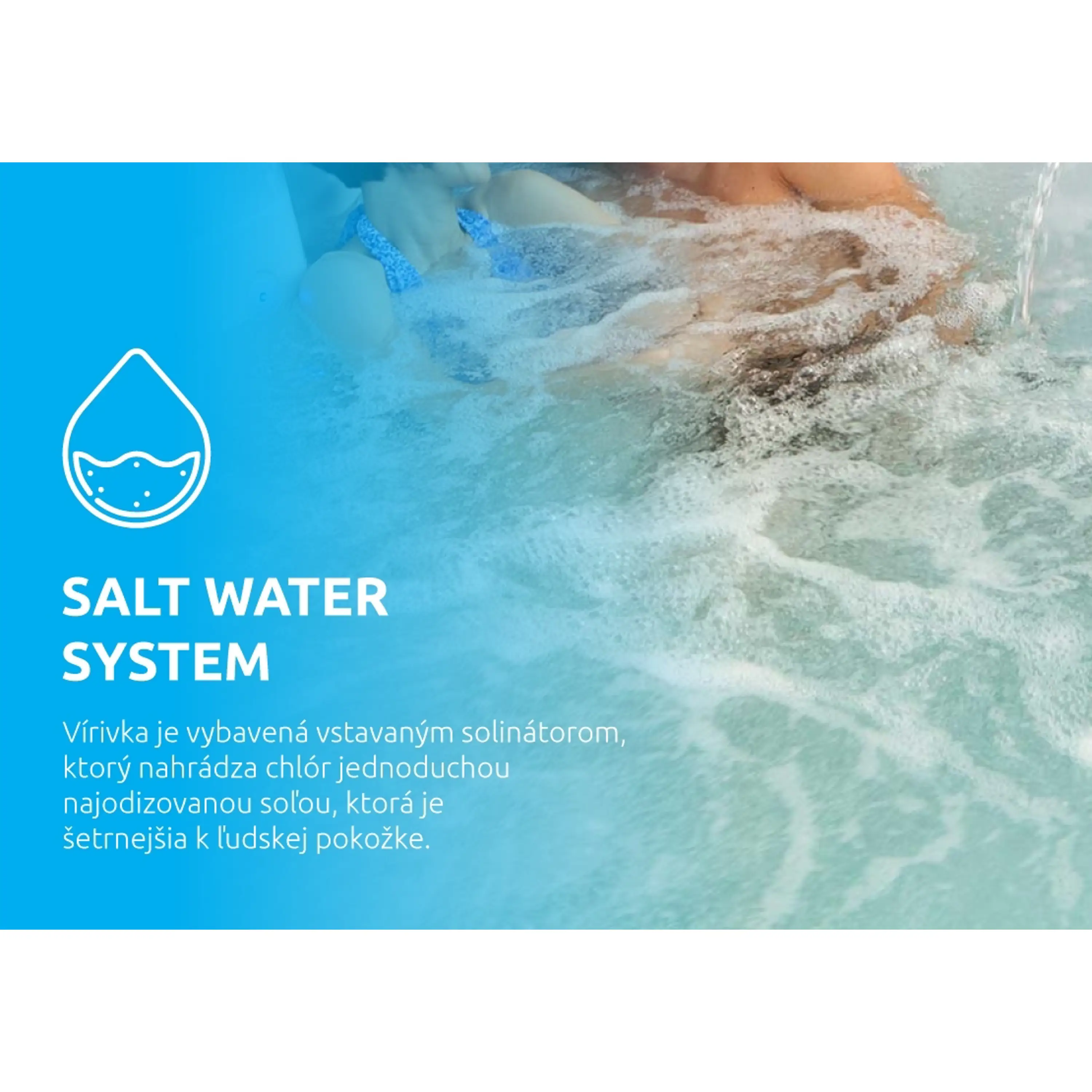 Vírivka je vybavená vstavaným solinátorom, ktorý nahrádza chlór jednoduchou najodizovanou soľou, ktorá je šetrnejšia k ľudskej pokožke.