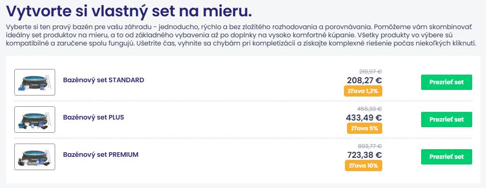 - Práve tu čaká Bazénový radca s pripravenými setmi, ktoré sú múdro rozdelené do troch úrovní: Standard, Plus a Premium. Platí tu jednoduché a výhodné pravidlo: čím vybavenejší set si poskladáte, tým výraznejšiu zľavu získate. Najvyššia úroveň tak prináša nielen maximálny komfort na kúpanie, ale zároveň zaručuje tú najväčšiu možnú úsporu.