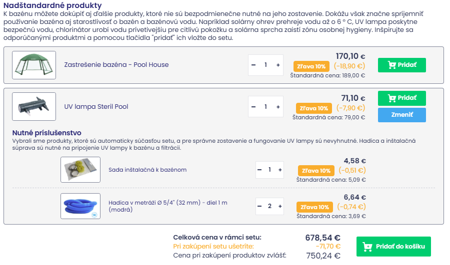 - Doplnkové produkty: K bazénu môžete dokúpiť aj ďalšie produkty, ktoré nie sú bezpodmienečne nutné na jeho zostavenie. Dokážu však uľahčiť a spríjemniť používanie bazéna aj starostlivosť o bazén a bazénovú vodu. Napríklad krycia plachta zabráni spadu nečistôt, solárna plachta prehreje vodu, plavák bezpečne rozpustí bazénovú chémiu a vysávač pomôže s precíznym upratovaním. Inšpirujte sa odporúčanými produktmi a pomocou tlačidla "pridať" ich vložte do setu.