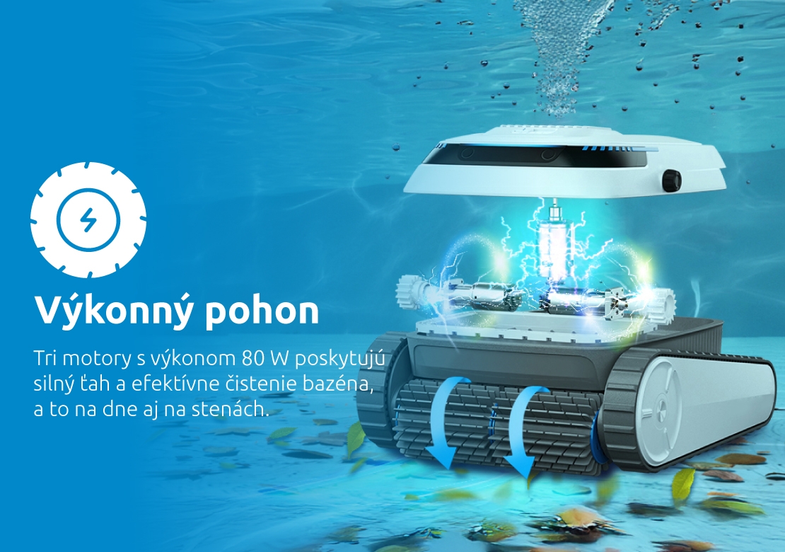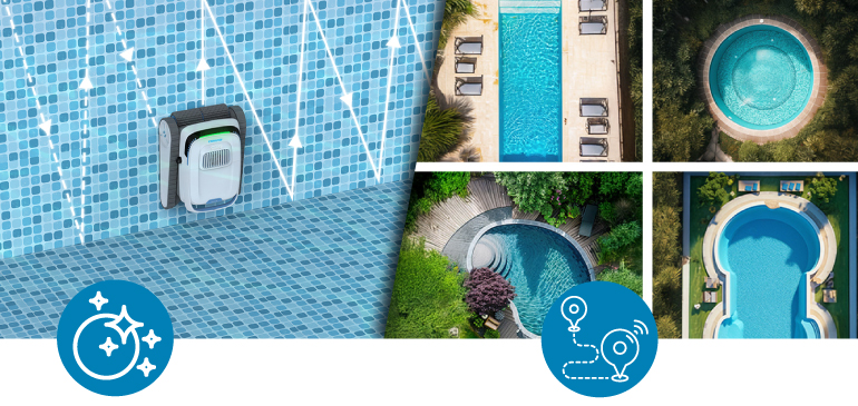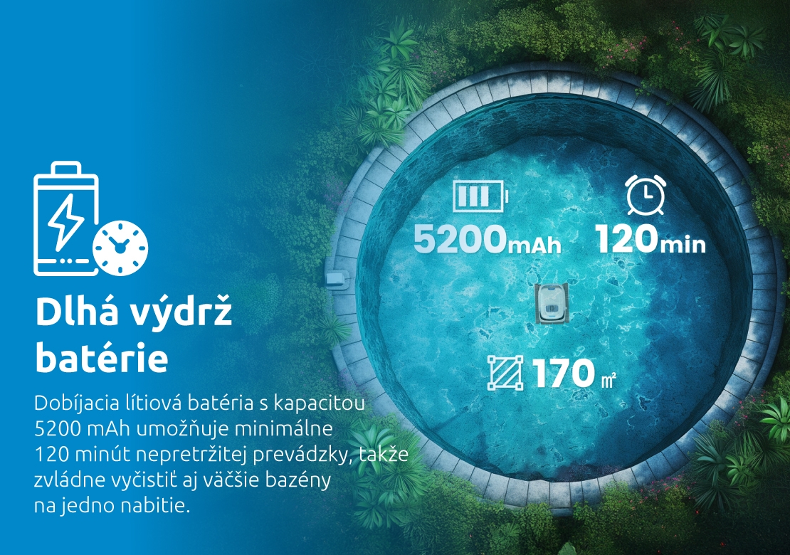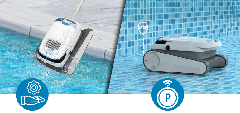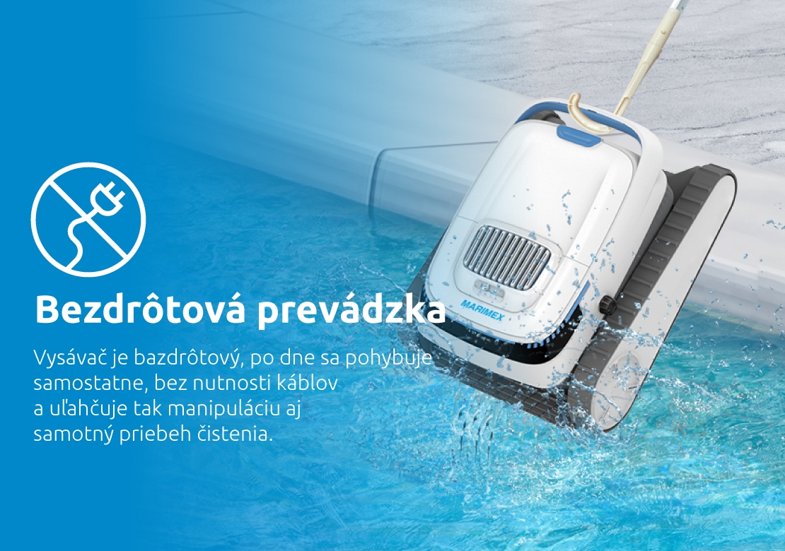 Bezdrôtové prevedenie, kompaktný dizajn a automatické parkovanie pri stene bazéna po dokončení čistenia, zvyšujú komfort užívateľa a uľahčujú manipuláciu s vysávačom. Krytie IP68 poskytuje vysokú odolnosť voči vode. Vysávač je vhodný pre bazény do hĺbky 2,5 metra a je možné ho používať v teplotnom rozmedzí vody od 5 °C do 35 °C, čo z neho robí univerzálneho pomocníka pre každý bazén. Je ideálnym riešením pre tých, ktorí hľadajú výkonný, spoľahlivý a ľahko ovládateľný vysávač pre svoj bazén.