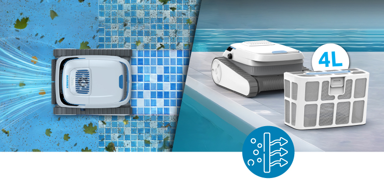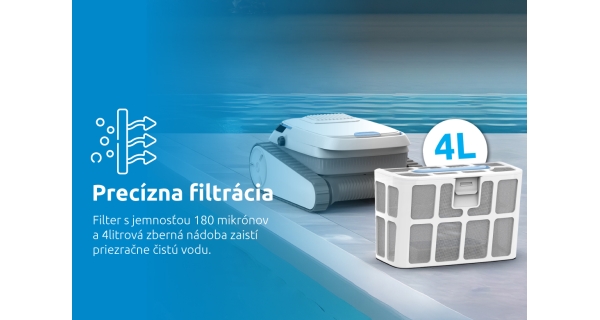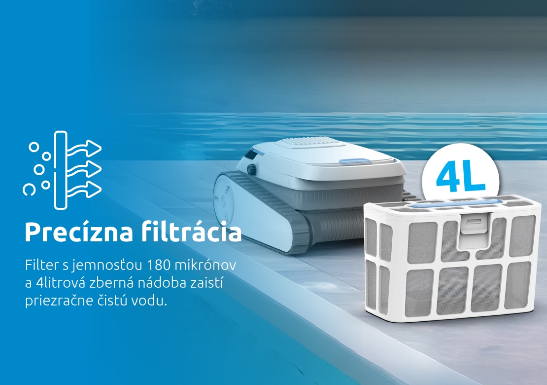 Robotický vysávač je vybavený pokročilým filtračným systémom s jemnosťou 180 mikrónov, ktorý účinne zachytí aj tie najjemnejšie nečistoty. Veľká zberná nádoba s kapacitou 4 litre pojme značné množstvo nečistôt, čo minimalizuje potrebu častého vyprázdňovania. Vďaka tejto kombinácii si môžete byť istí, že váš bazén zostane priezračne čistý a pripravený na kúpanie za všetkých okolností.