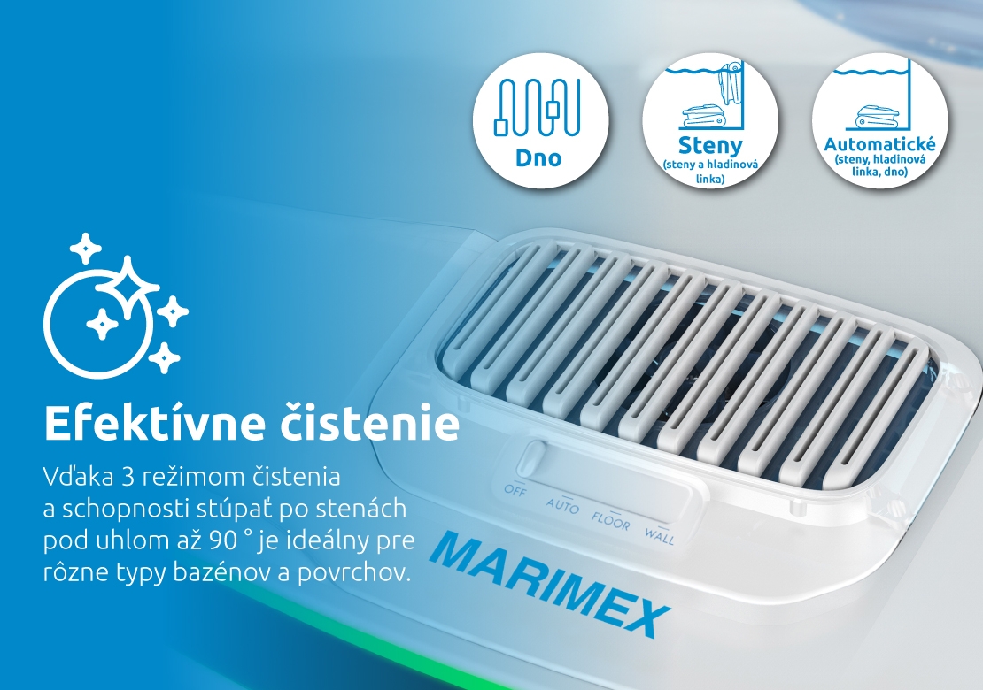 Robotický vysávač Marimex Fraser efektívne čistí dno, steny aj hladinovú linku bazéna. Vďaka šikovnému plánovaniu trás a trom režimom čistenia (automatický, dno, steny) zvládne všetku prácu za vás. Navyše sa prispôsobí rôznym typom bazénov a rôznym povrchom. Jeho schopnosť stúpať po stenách pod uhlom až 90° zaisťuje dôkladné čistenie aj ťažko dostupných miest.