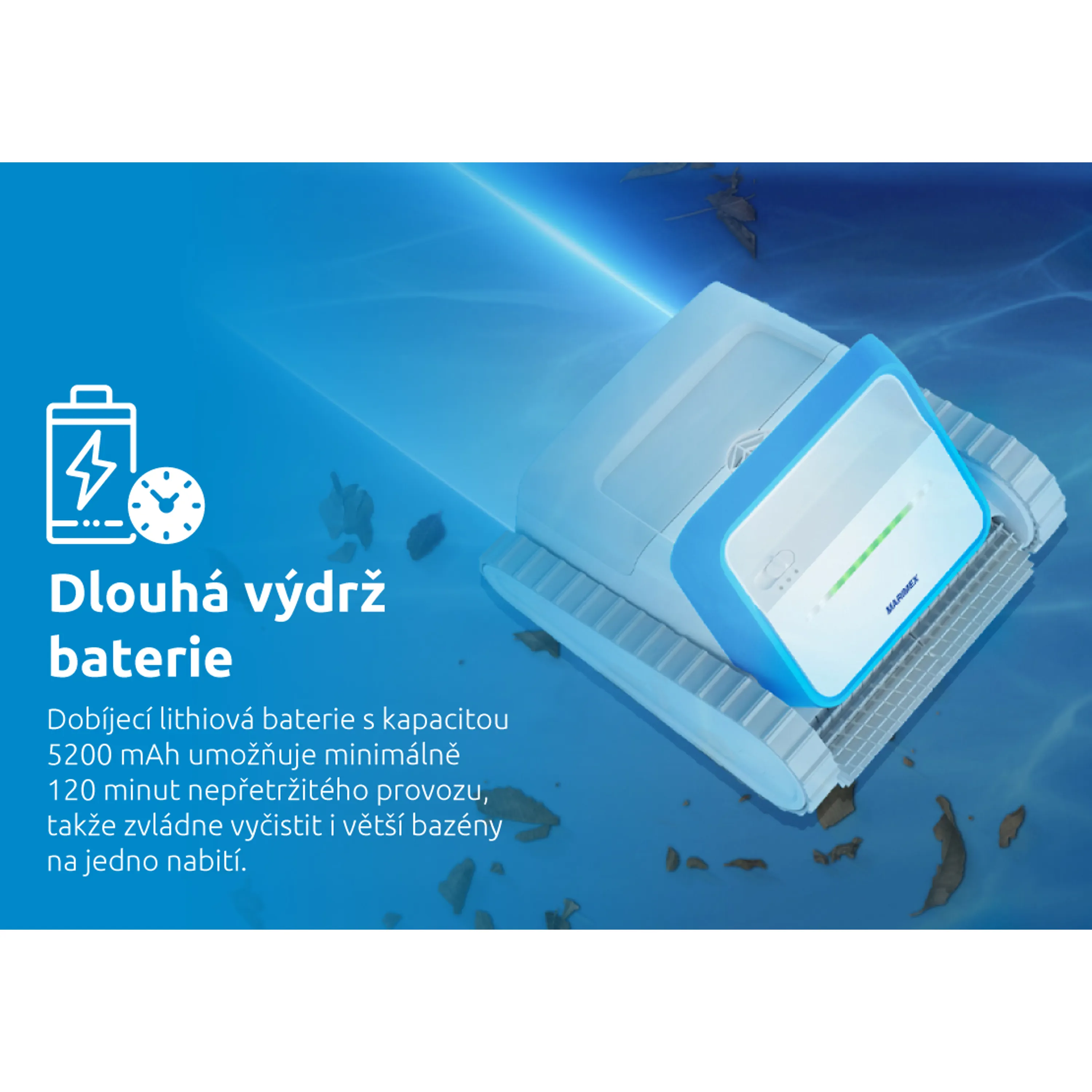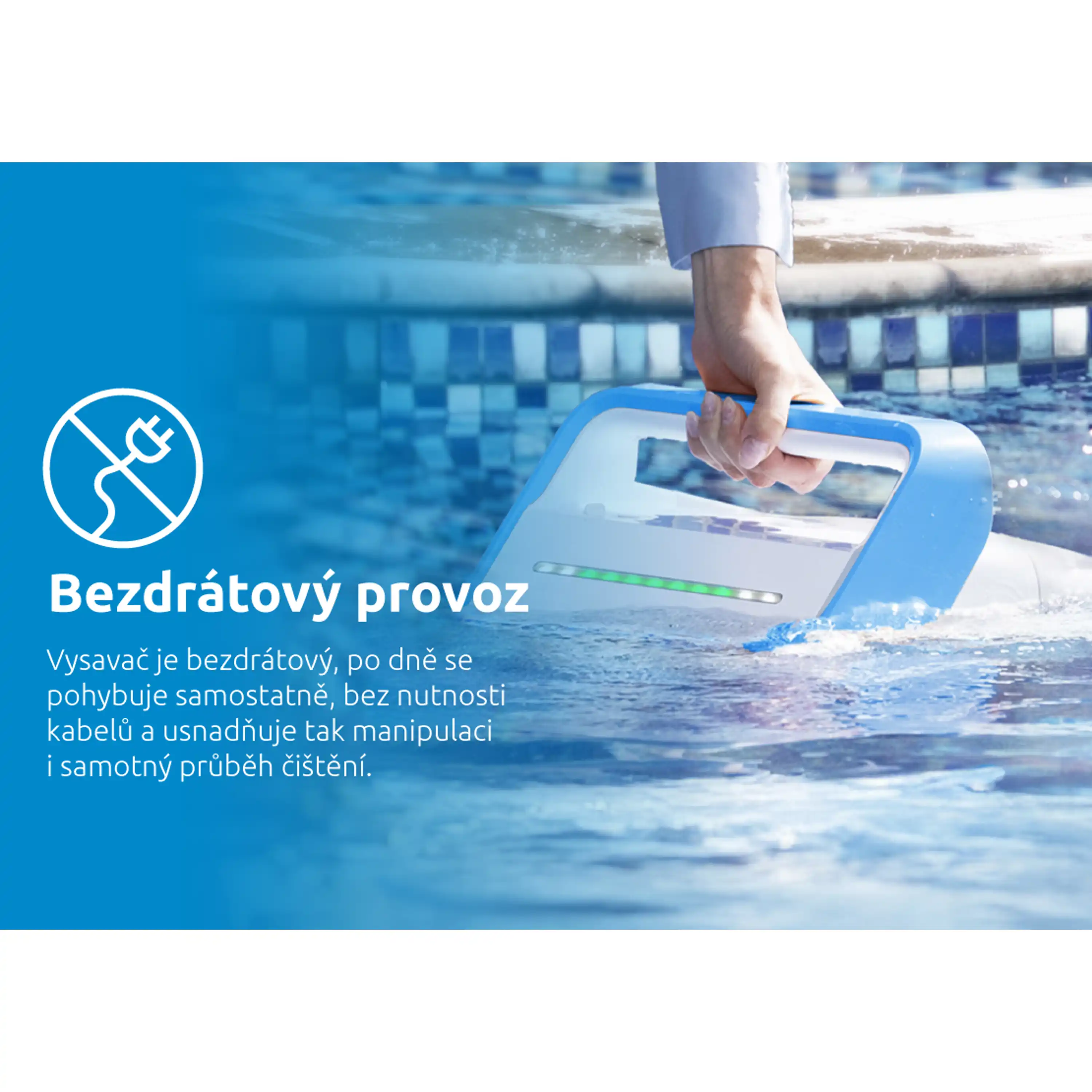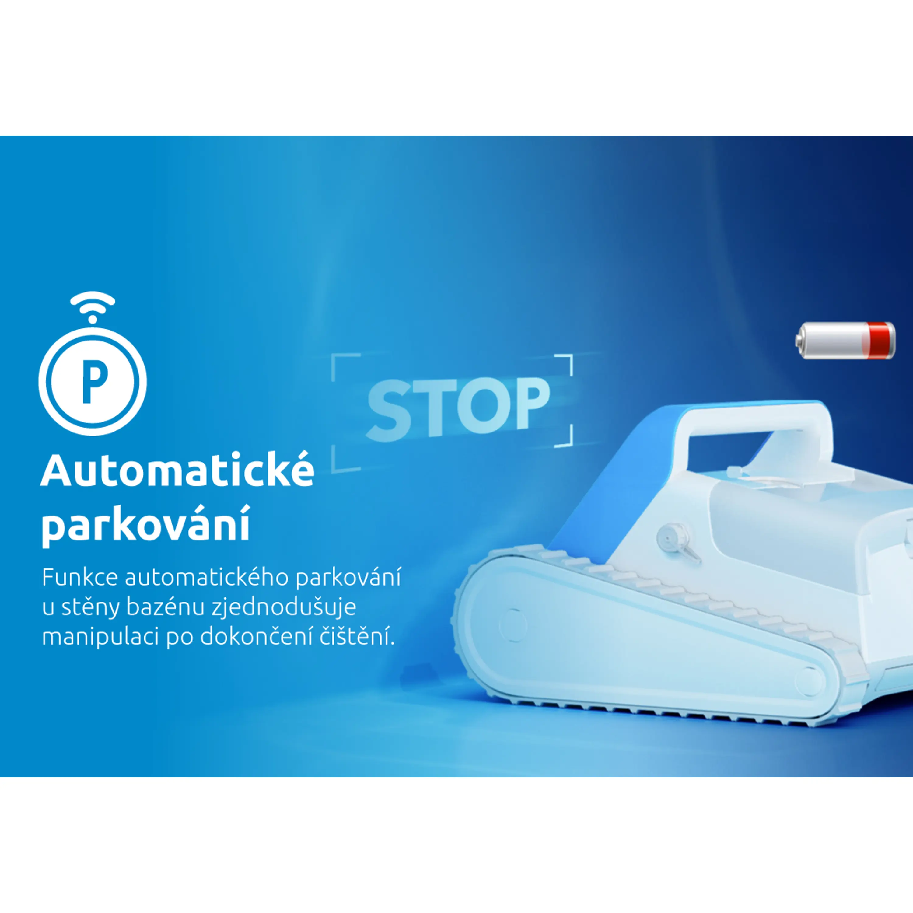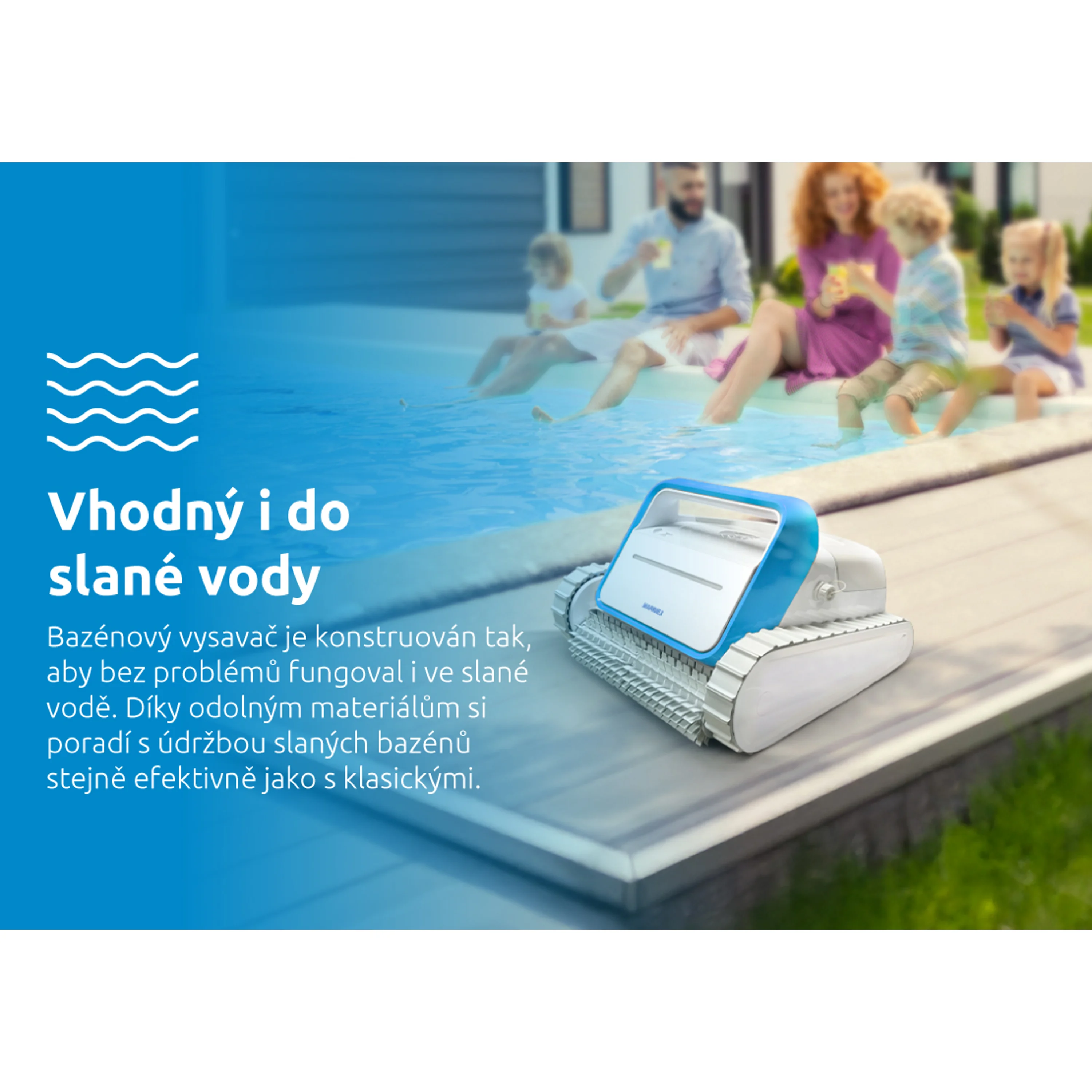 Vysávač je bezdrôtový, po dne sa pohybuje samostatne, bez nutnosti káblov a uľahčuje tak samotný priebeh čistenia. Funkcia automatického parkovania pri stene zjednodušuje manipuláciu a uľahčuje vybratie z bazéna po dokončení čistenia. Bazénový vysávač je konštruovaný tak, aby bez problémov fungoval aj v slanej vode. Vďaka odolným materiálom a špeciálnej úprave si poradí s údržbou slaných bazénov rovnako efektívne ako s klasickými.