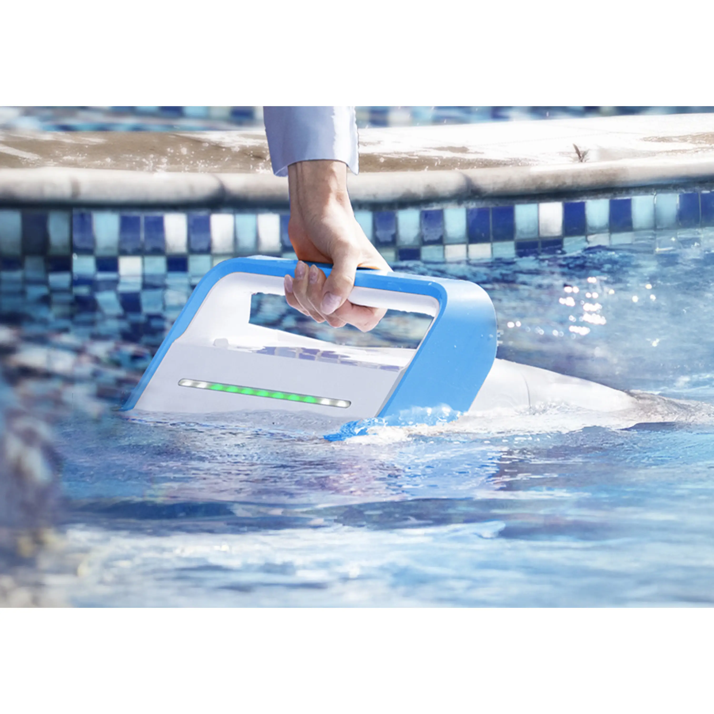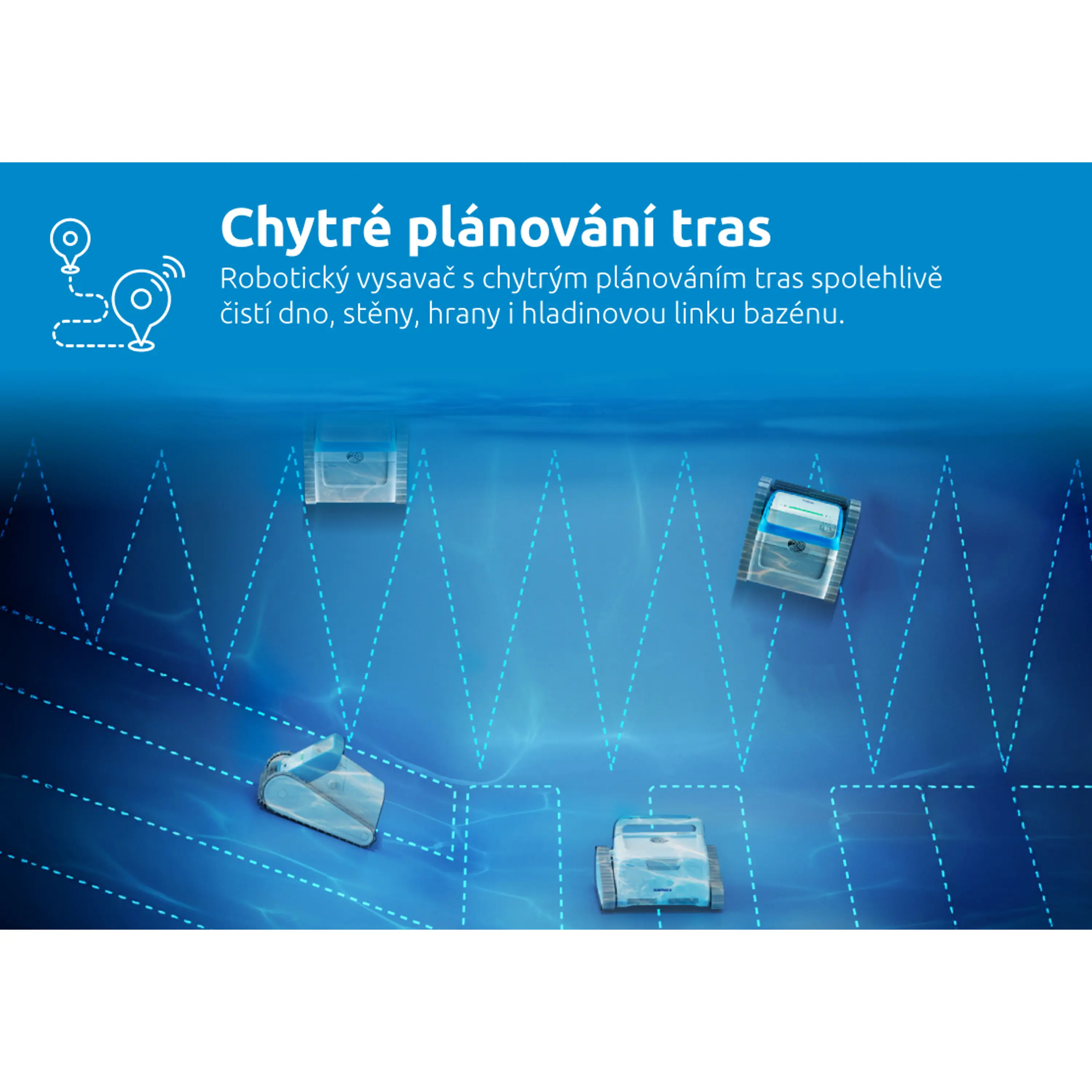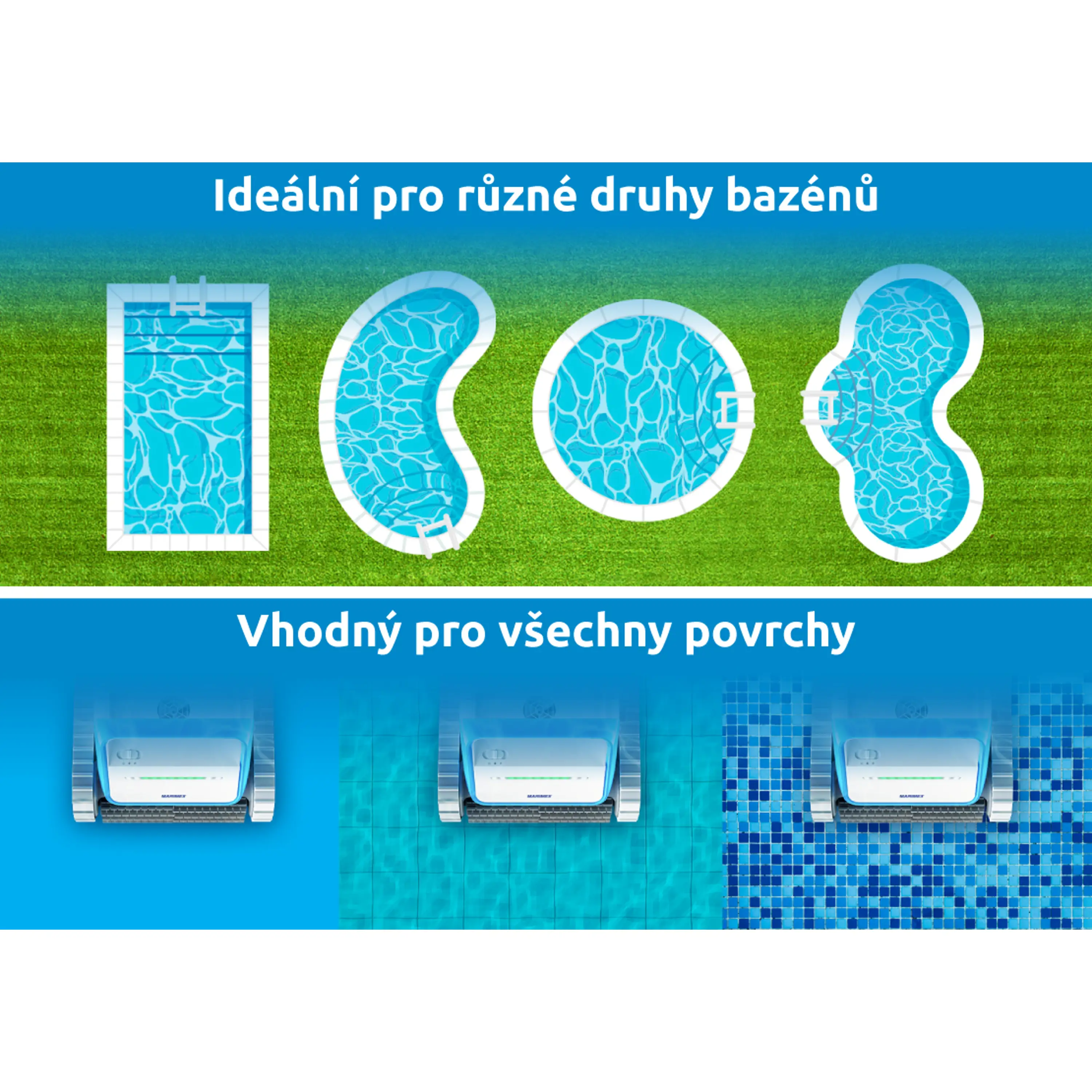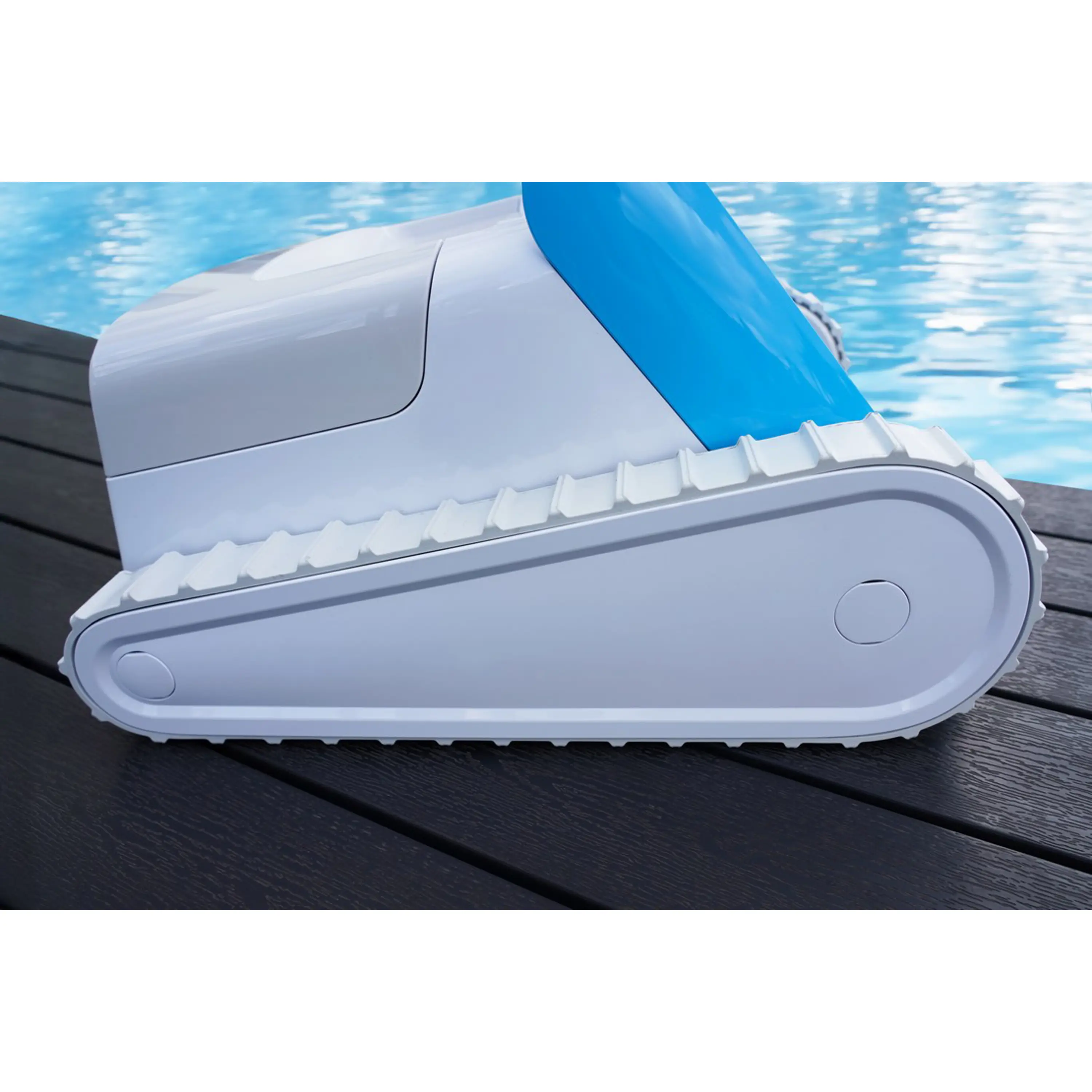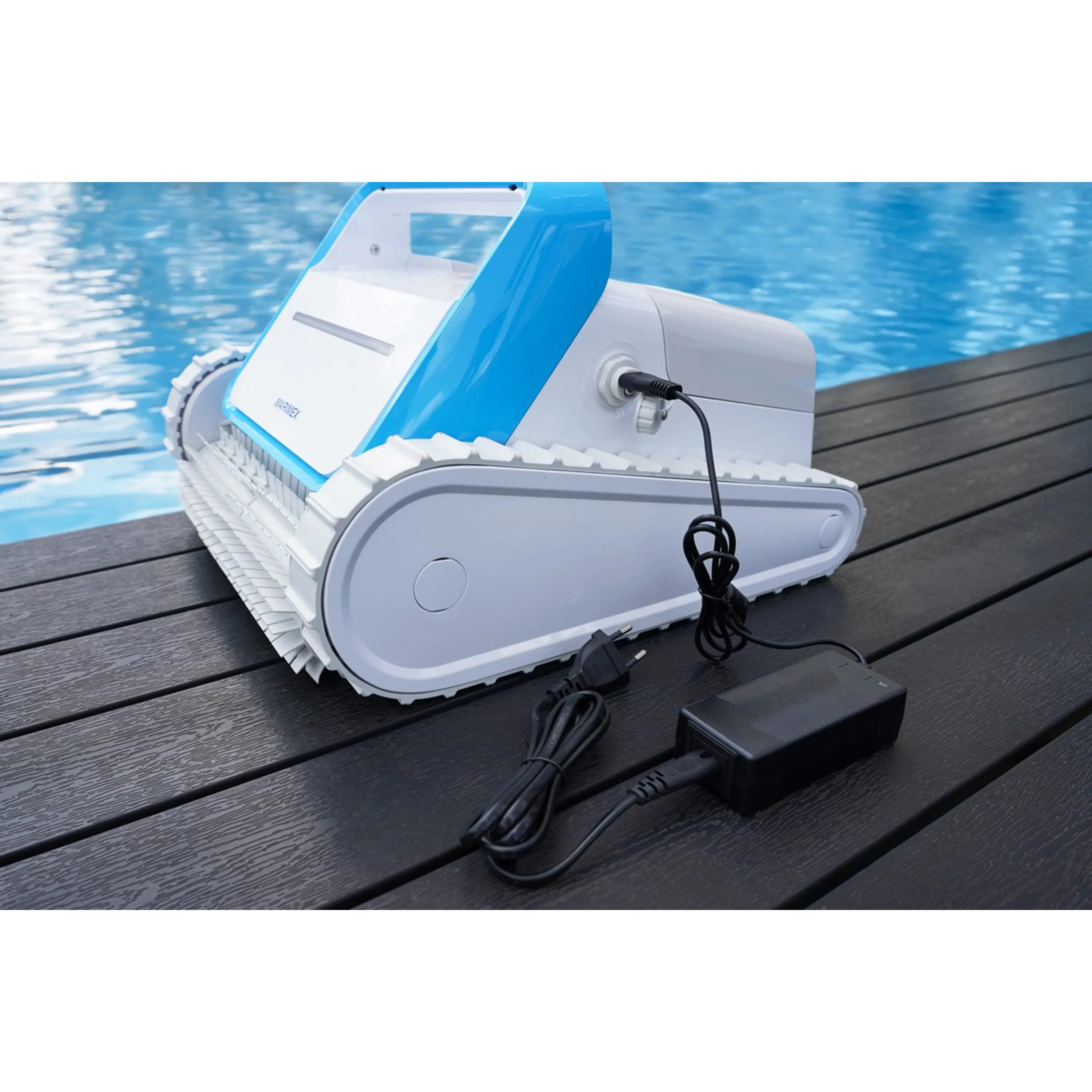 Vysávač je bezdrôtový, po dne sa pohybuje samostatne, bez nutnosti káblov a uľahčuje tak samotný priebeh čistenia. Funkcia automatického parkovania pri stene zjednodušuje manipuláciu a uľahčuje vybratie z bazéna po dokončení čistenia. Bazénový vysávač je konštruovaný tak, aby bez problémov fungoval aj v slanej vode. Vďaka odolným materiálom a špeciálnej úprave si poradí s údržbou slaných bazénov rovnako efektívne ako s klasickými.