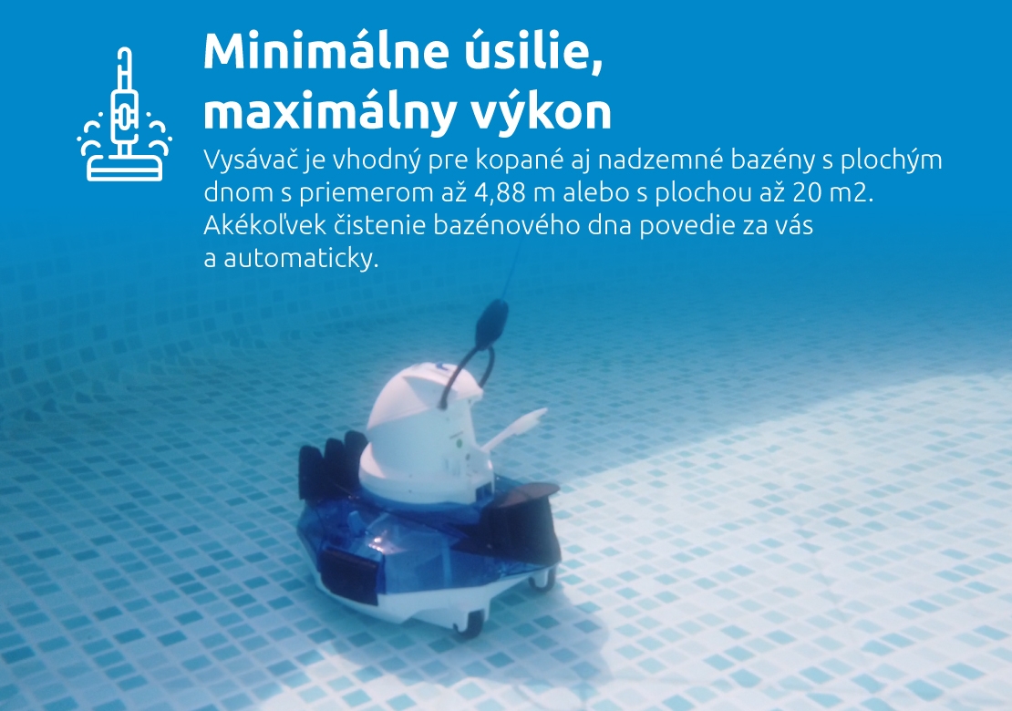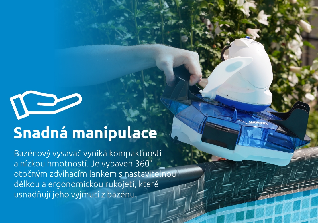 Bazénový vysávač je navrhnutý s dôrazom na jednoduché používanie. Vďaka kompaktným rozmerom a nízkej hmotnosti sa ľahko ovláda a prenáša. Ergonomická rukoväť a 360 ° otočné zdvíhacie lanko s nastaviteľnou dĺžkou uľahčujú jeho vybratie z bazéna. Tieto vlastnosti robia manipuláciu s vysávačom pohodlnou a efektívnou.