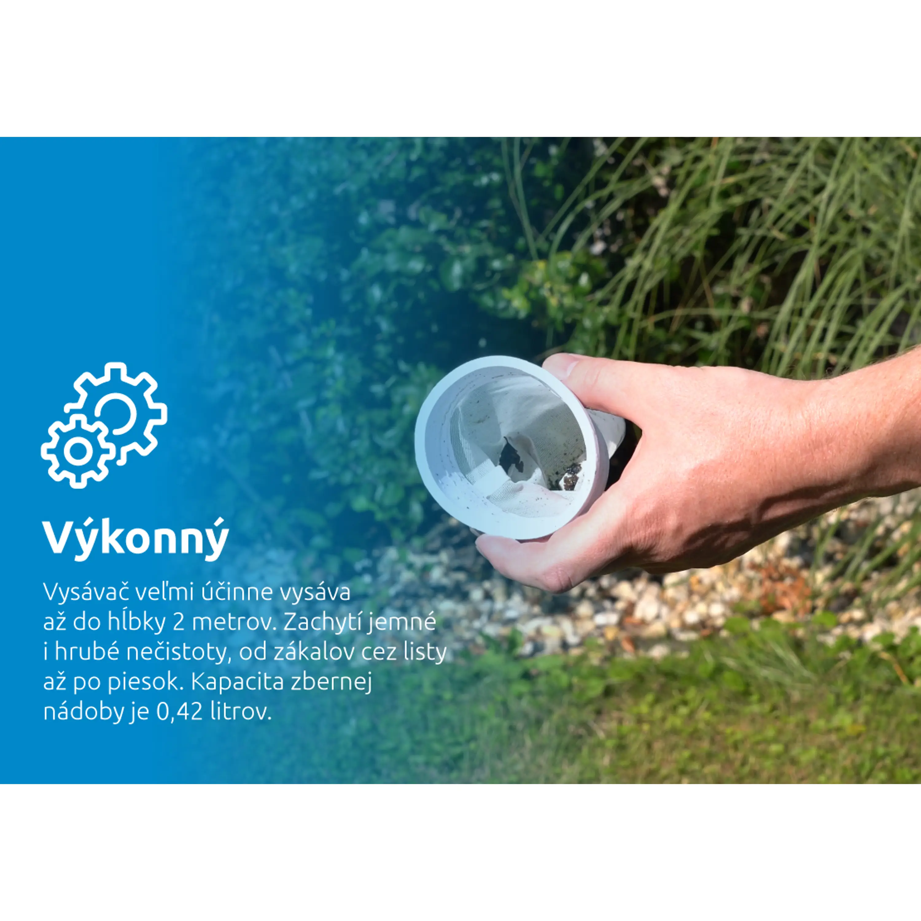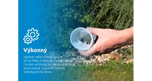 Vysávač veľmi účinne vysáva až do hĺbky 2 metrov. Zachytí jemné aj hrubé nečistoty, od zákalov cez lístie až po piesok. Nečistoty sa zhromažďujú vo filtri, z ktorého sa po vysávaní ľahko vysypú von. Kapacita zbernej nádoby je 0,42 litra. Balenie vysávača obsahuje otočnú saciu hlavu, ktorá je vhodná na väčšie plochy. Zároveň obsahuje plochú kefu, ktorá uľahčuje vysávanie rohov.