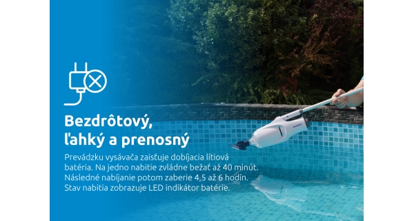 Vysávač Marimex StarVac Columbia prináša vysokú flexibilitu a pohodlie pri čistení bazéna. Prevádzku vysávača zabezpečuje dobíjateľná lítiová batéria, ktorá vyniká dlhou životnosťou a spoľahlivosťou. Na jedno nabitie dokáže tento výkonný vysávač fungovať až 40 minút, čo je dostatok času na dôkladné vyčistenie bazéna. Následné nabíjanie je jednoduché a efektívne, trvá približne 4,5 až 6 hodín, počas ktorých sa batéria plne dobije a vysávač je opäť pripravený na použitie. Stav nabitia zobrazuje praktický LED indikátor, ktorý informuje o zostávajúcej kapacite batérie, takže vás nikdy neprekvapí vybitý prístroj.