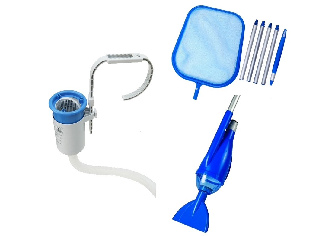 Výhodná sada bazénového vysávača Star Vac , závesného skimmeru pre bazény Tampa , Florida , Intex a hladinovej skladacej sieťky na nečistoty . V tejto sade je všetko potrebné pre to , aby ste udržali vodu v bazéne krištáľovo čistú . Vďaka bazénovému vysávaču vysajete usadené nečistoty na dne bazéna , hladinovú sieťkou pozbierate nečistoty z hladiny bazéna a pomocou skimmera môžete pravidelne filtrovať a zachytávať nečistoty, ktoré spadnú do bazéna a plávajú na hladine .