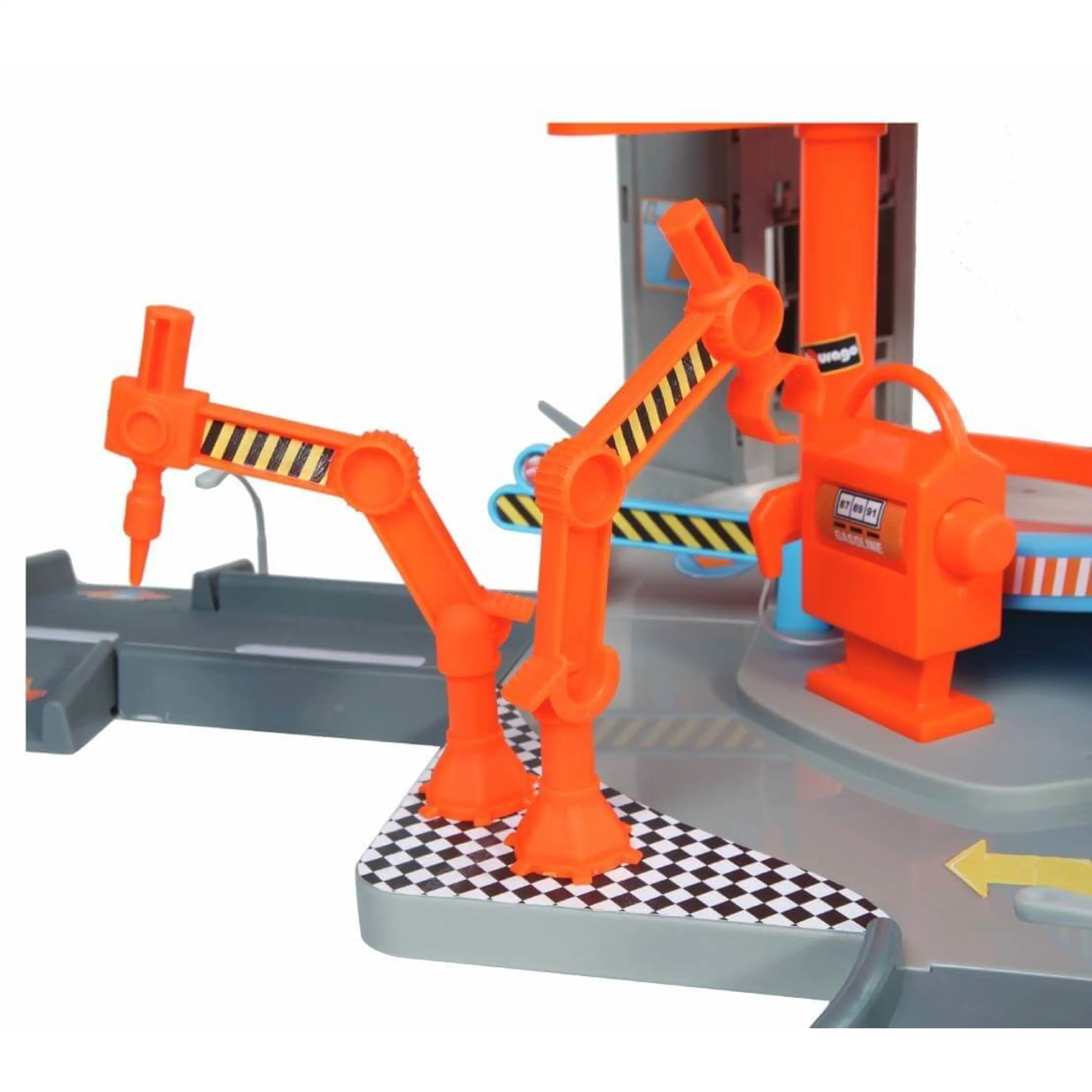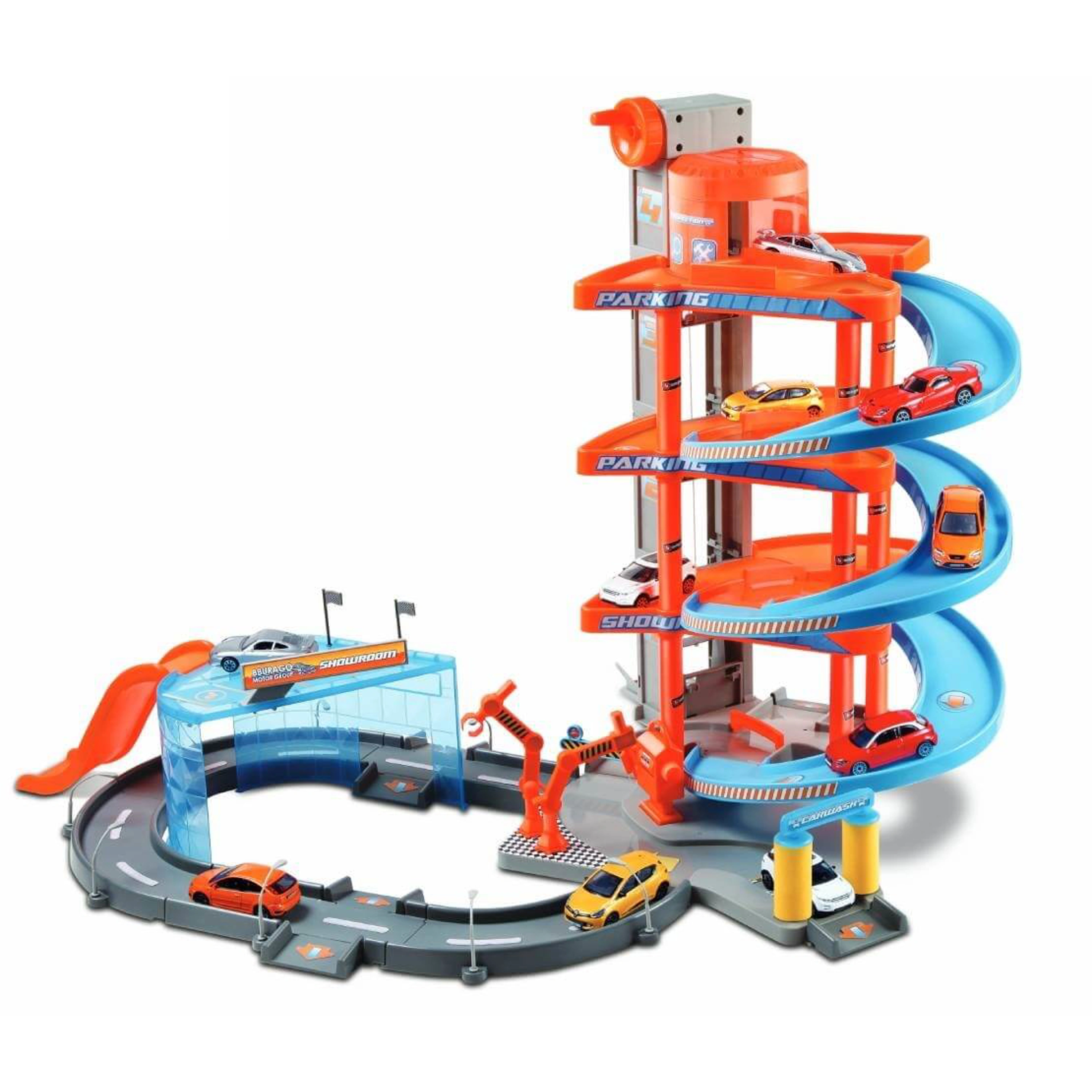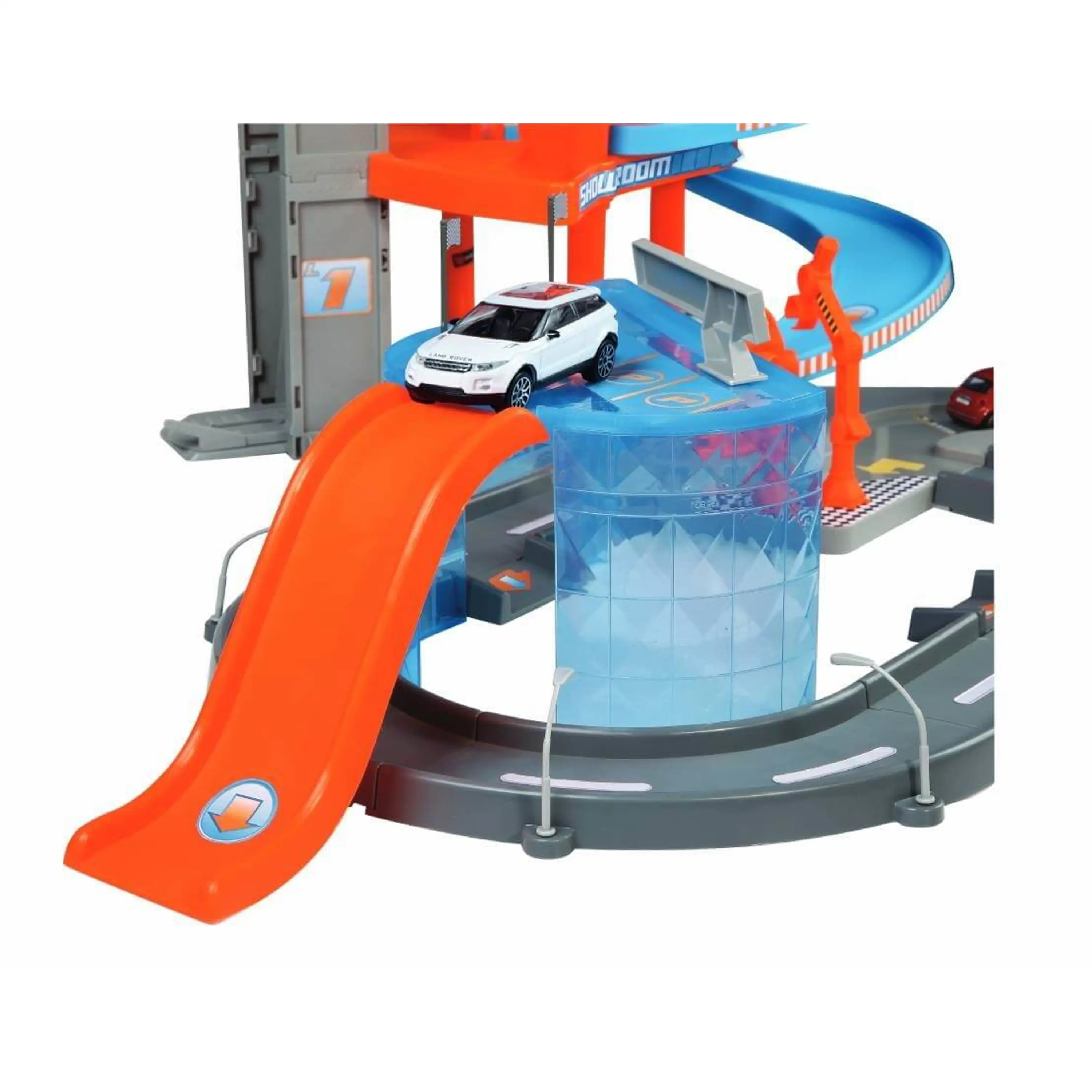 Štvorposchodová garáž s mnohými farebnými doplnkami, autoumývačkou a showroomom je snom každého chlapca! Vďaka obsiahnutým autíčkom v mierke 1:43 si môžu deti so svojimi kamarátmi usporiadať preteky, učiť sa dopravným zákonom alebo si užiť veľa zábavy pri prvých pokusoch o parkovanie.
