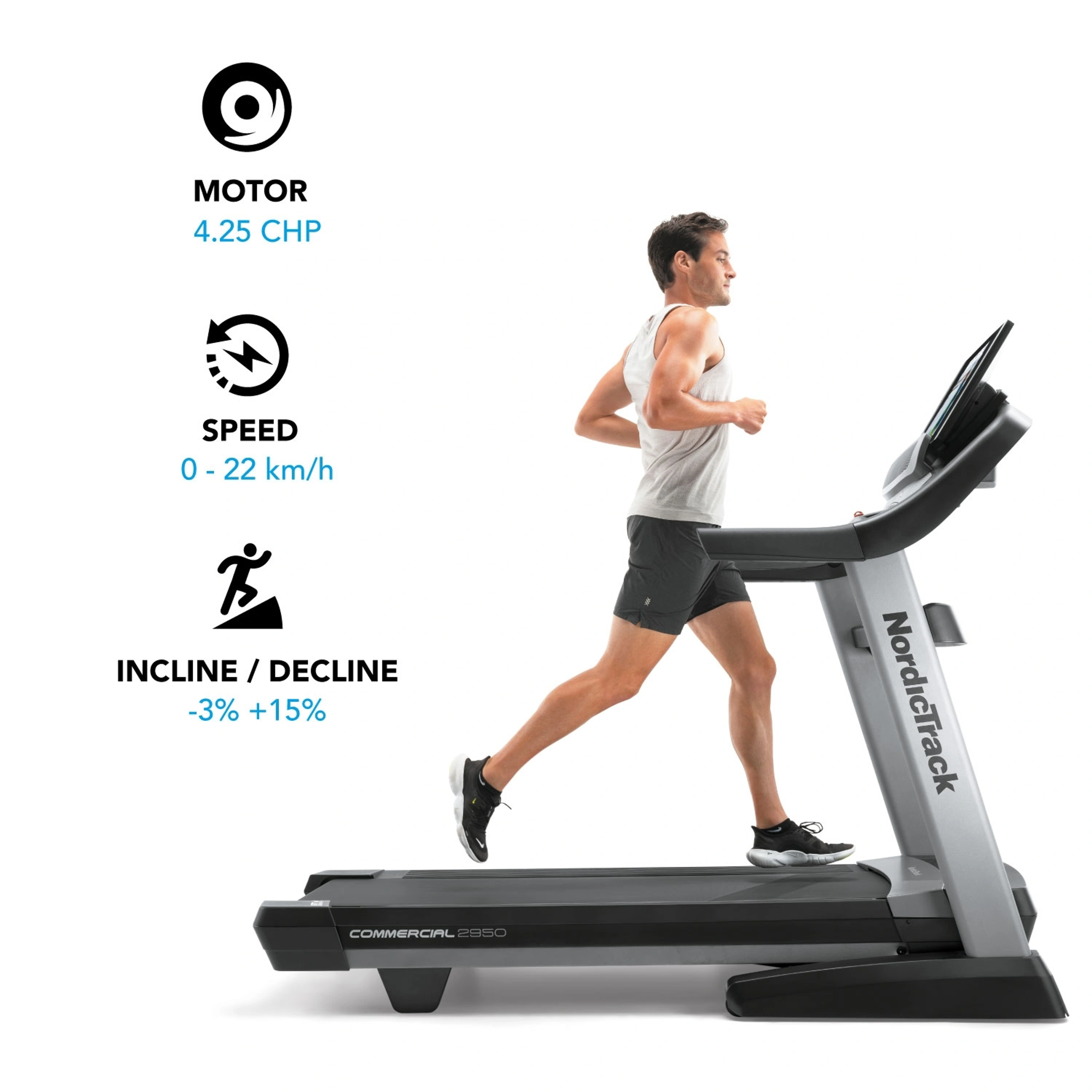 NORDICTRACK Commercial 2950 je bežecký pás od známeho amerického výrobcu domácich trenažérov a patrí k top modelom, ktorými sa táto značka môže chváliť. Pás je vybavený kvalitným a úplne tichým motorom DurX Commercial Plus s trvalým výkonom 3,13 kW (4,25 HP). Motor má veľký kryt s izoláciou na zníženie vibrácií pri behu. Elektronicky nastaviteľná rýchlosť do 22 km/h a sklon bežeckej plochy od - 3 % (z kopca) až do + 15 % (do kopca) uspokojí aj náročných bežcov.