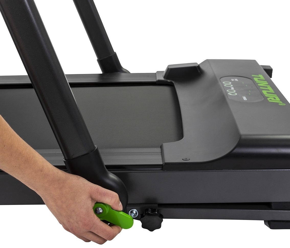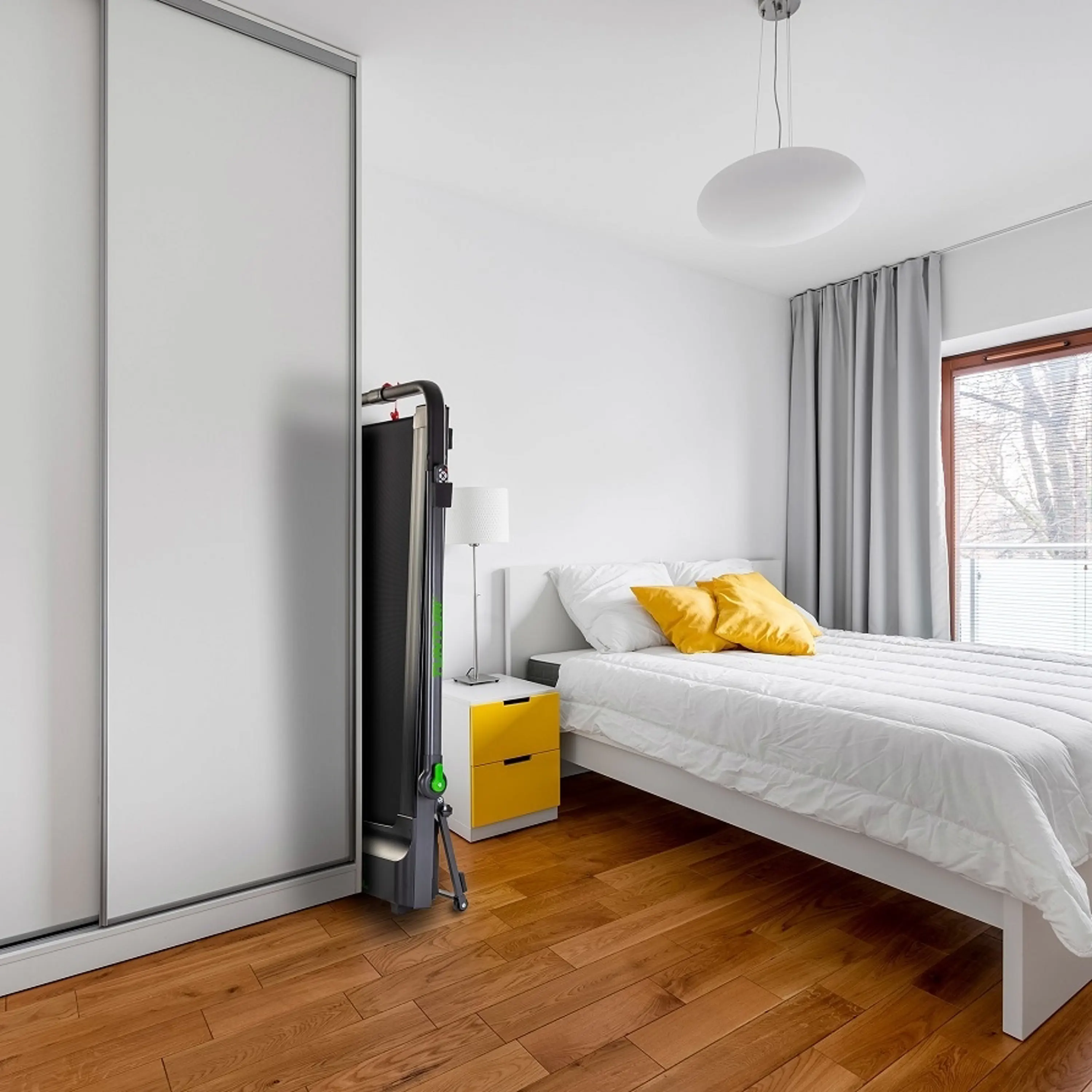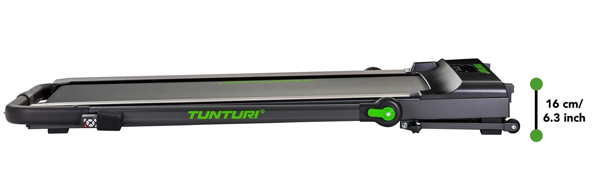 Pre úsporu miesta je možné stroj veľmi jednoducho zložiť do horizontálnej polohy a ľahko upratať napr. pod posteľ alebo za skriňu. Nemusíte tak mať obavy, že by vám stroj zaberal veľa miesta v prípade, keď práve nebeháte. Pre jednoduché premiestňovanie po miestnosti je pás vybavený transportnými kolieskami. V zloženom stave má pás na výšku iba 16 cm.