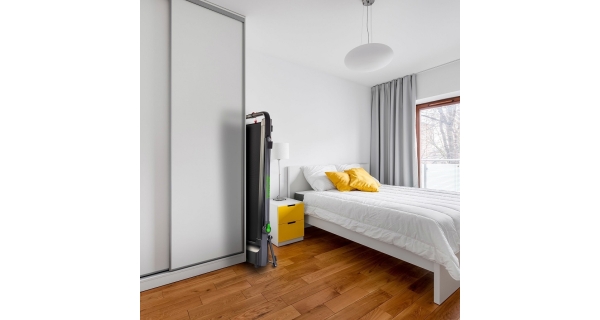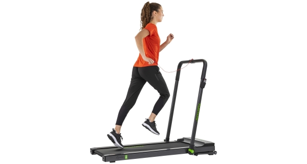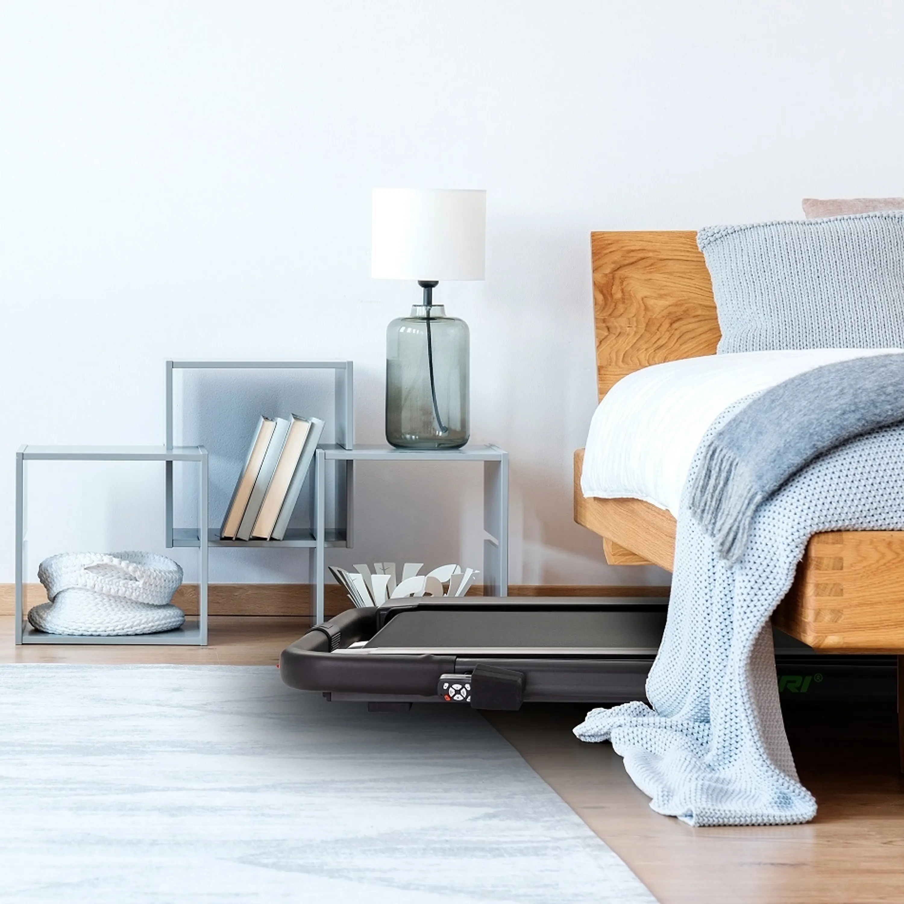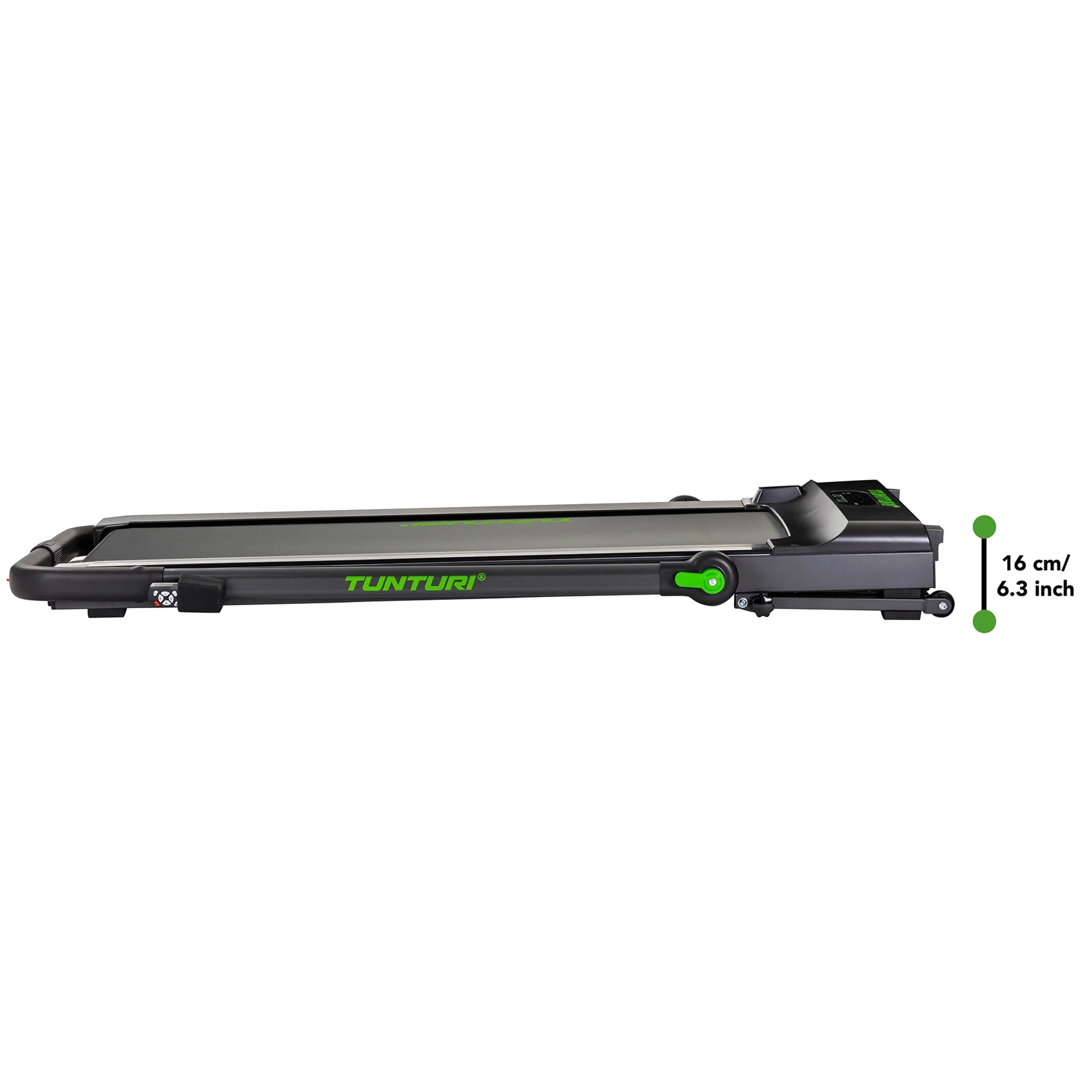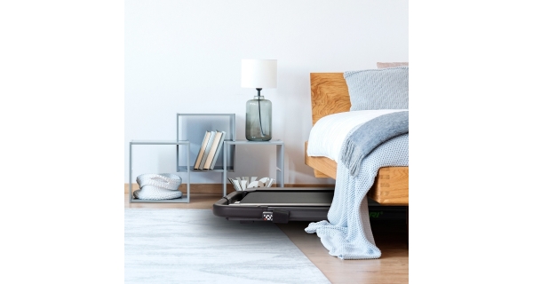 Pre úsporu miesta je možné stroj veľmi jednoducho zložiť do horizontálnej polohy a ľahko upratať napr. pod posteľ alebo za skriňu. Nemusíte tak mať obavy, že by vám stroj zaberal veľa miesta v prípade, keď práve nebeháte. Pre jednoduché premiestňovanie po miestnosti je pás vybavený transportnými kolieskami. V zloženom stave má pás na výšku iba 16 cm.