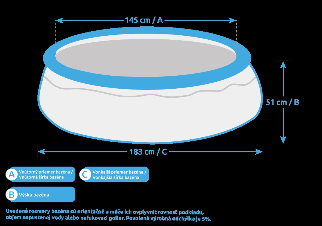 Uvedené rozmery bazéna sú len orientačné a ovplyvniť ich môže rovnosť podkladu, objem napustenej vody alebo nafúknutie goliera. Povolená výrobná odchýlka je 5%.