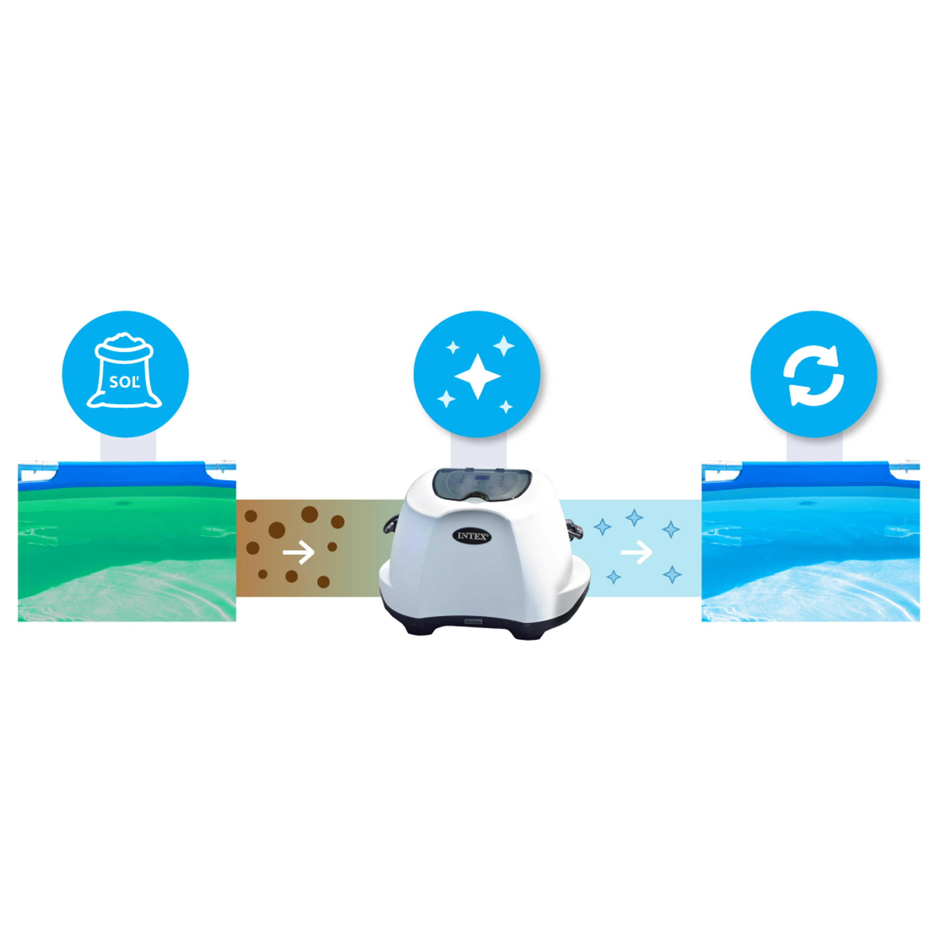 Bežná soľ (chlorid sodný) sa skladá z dvoch prvkov - sodíka a chlóru. Počas inštalácie chlorinátora je v bazénovej vode rozpustená presne odmeraná dávka soli. Táto ľahko slaná voda prechádza cez elektrolytickú jednotku chlorinátora, ktorá z prechádzajúcej vody generuje chlór a ihneď ho uvoľňuje do vody.