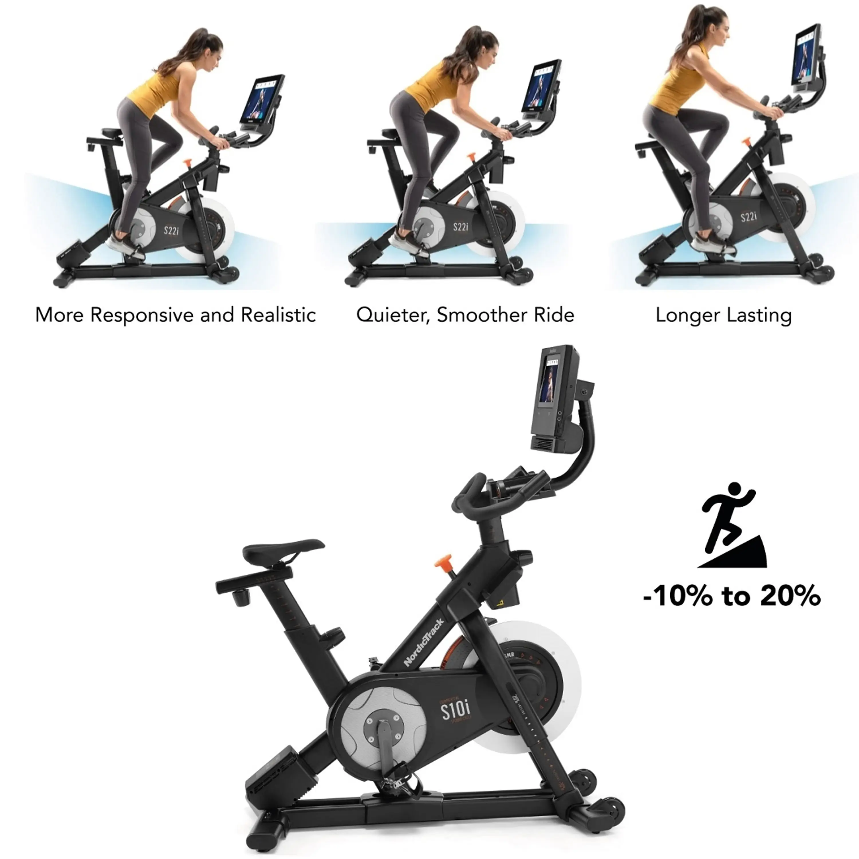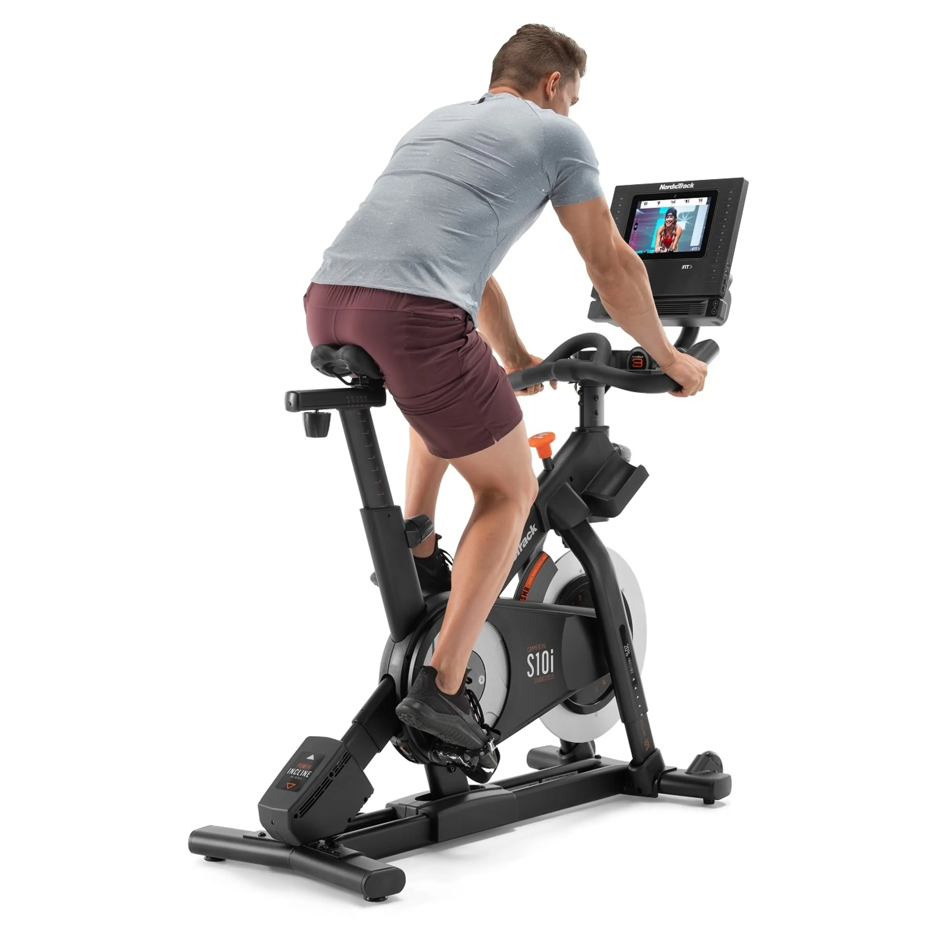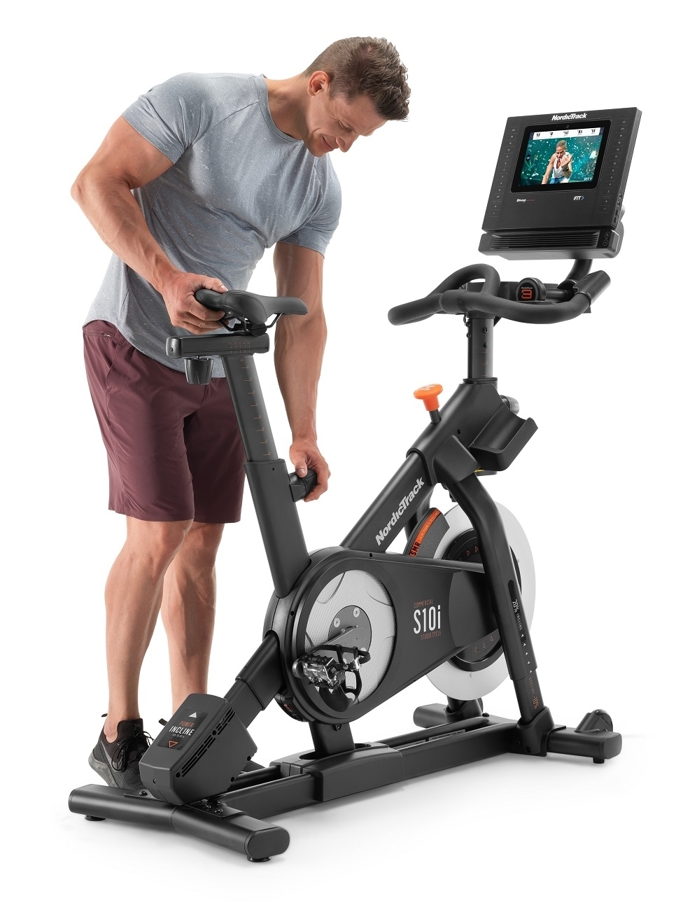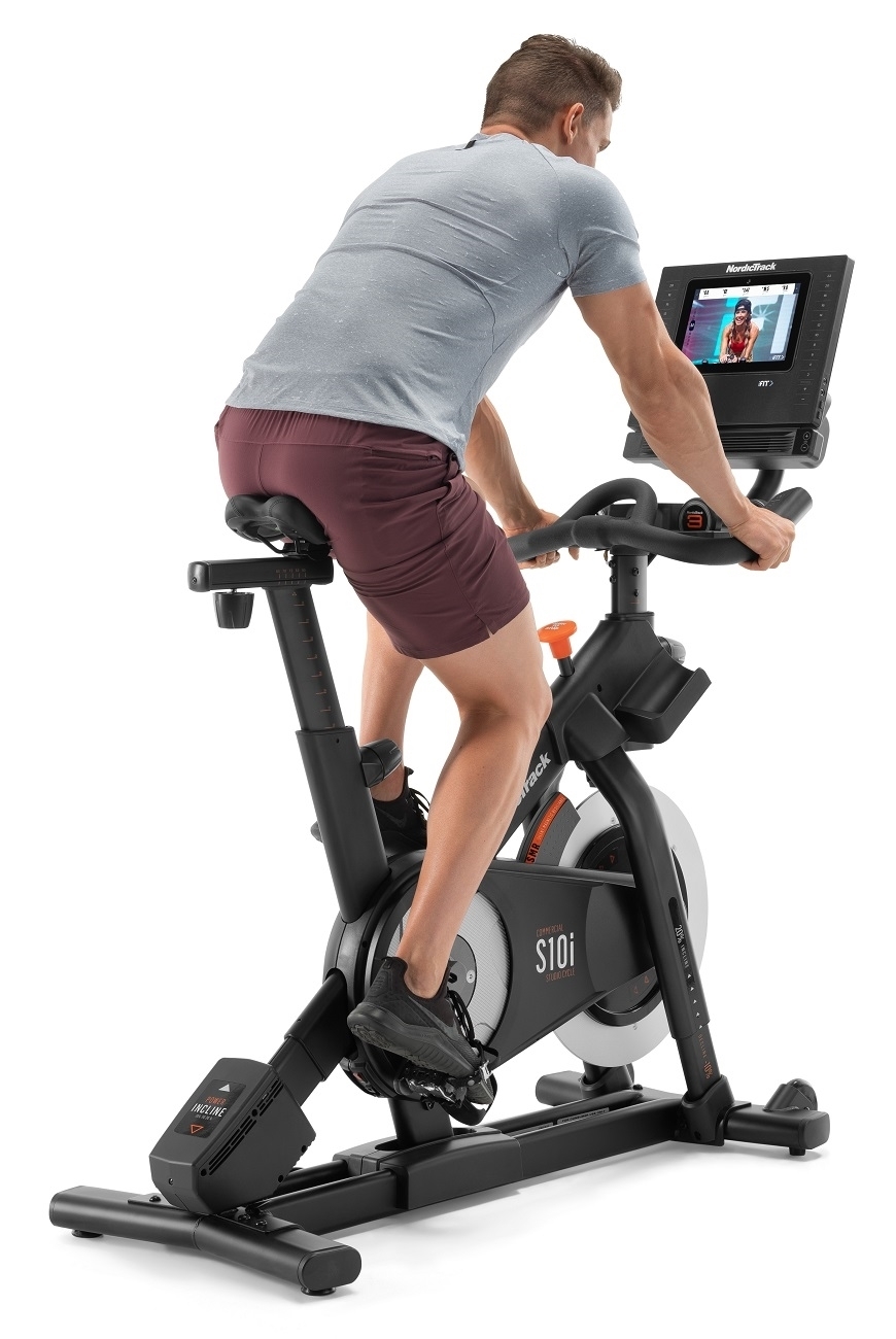 NordicTrack Studio 10i cyklistický trenažér je špičkový, moderný stroj pre reálny cyklozážitok z pohodlia vášho domova. Tento jedinečný trenažér, vďaka jeho parametrom, je možné využiť aj v menších komerčných priestoroch ako sú klubová fitness, hotely, welness. Dokonalá ergonómia, remeňový pohon, polohovateľné sedlo i riadidlá, elektronicky nastaviteľný predný aj zadný sklon a elektronické odvládanie odporu v 22 úrovniach vám poskytnú verný pocit jazdy na cestnom bicykli. Cyklotrenažér zotrvačníkom s hmotnosťou 13 kg, ten zaručuje stroju plynulý a tichý chod.