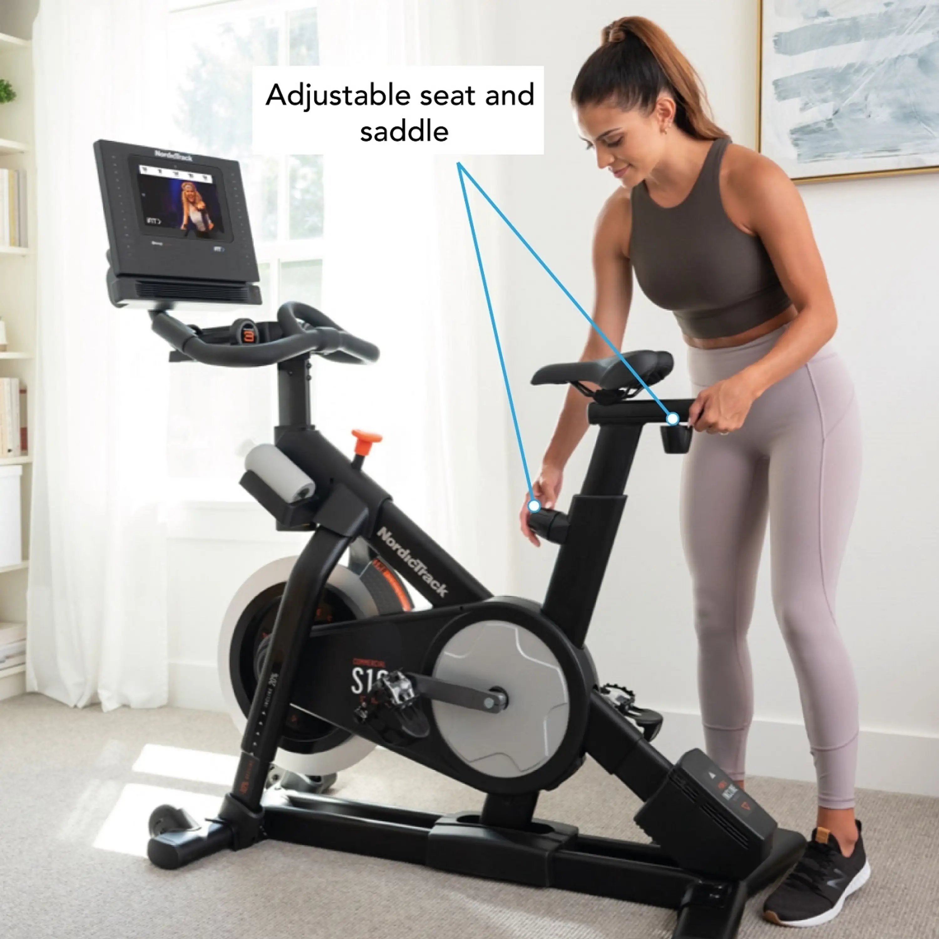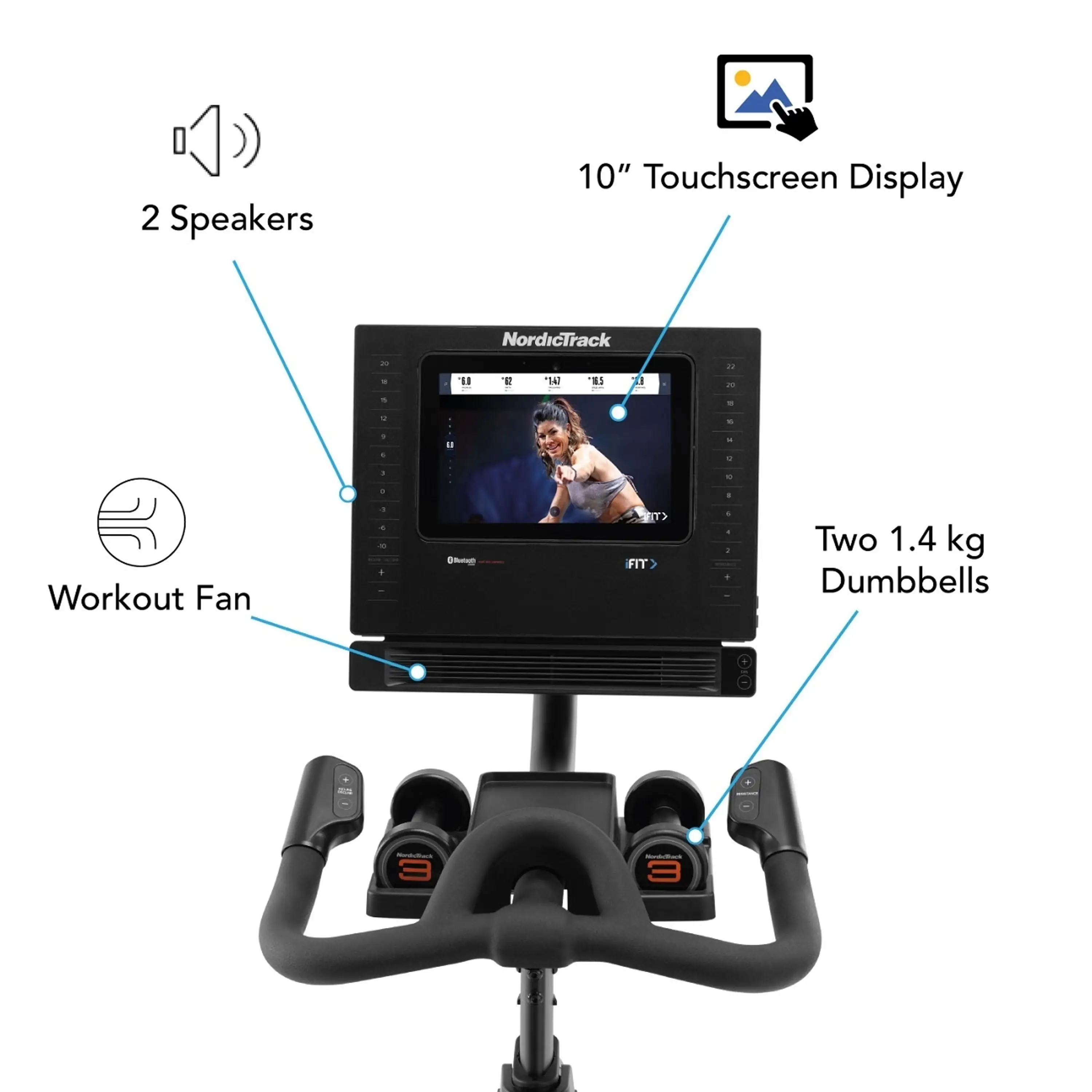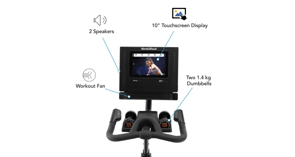 Gélové sedlo je ergonomicky tvarované a je jednoducho nastaviteľné ako v vertikálnej, tak aj v horizontálnej polohe, vrátane jeho sklonu. strong>. Protišmykové riadidlá sú výškovo aj horizontálne nastaviteľné a umožňujú viacpolohový úchop. Pitný režim dodržíte aj počas jazdy, držiaky na fľašu sú umiestnené pod riadidlami. Ďalším bonusom trenažéra NordicTrack Studio 10i sú činky jednoručky, každá s hmotnosťou 1,4 kg. Ani horná polovica tela tak nezostane bez tréningu.