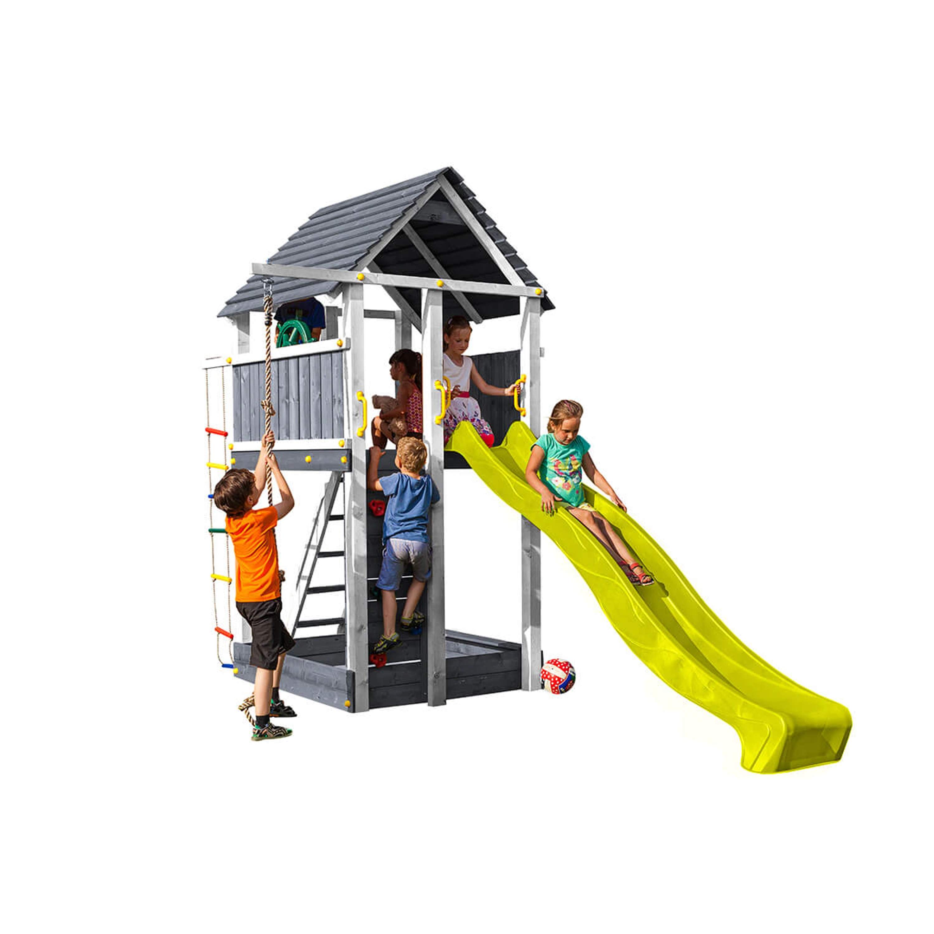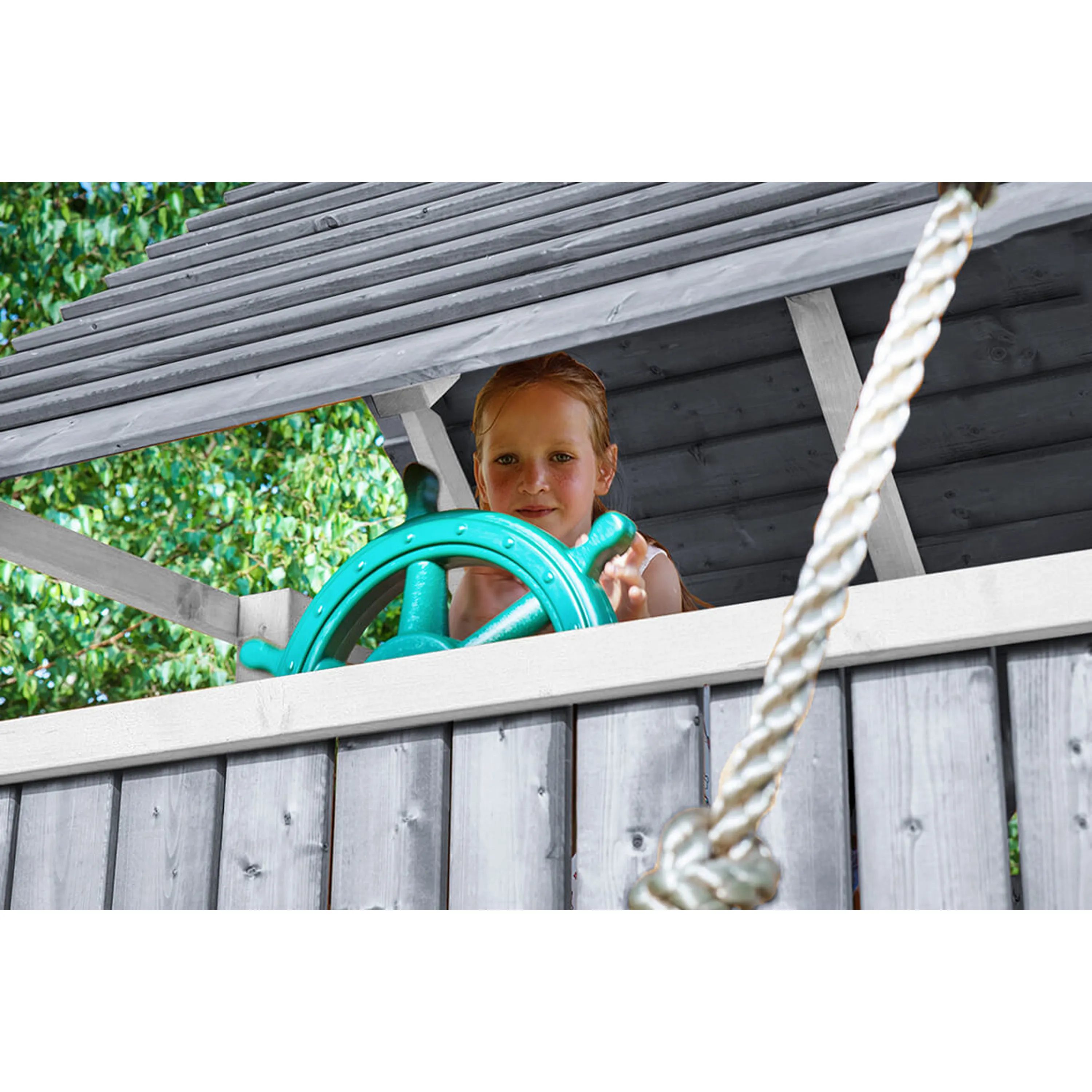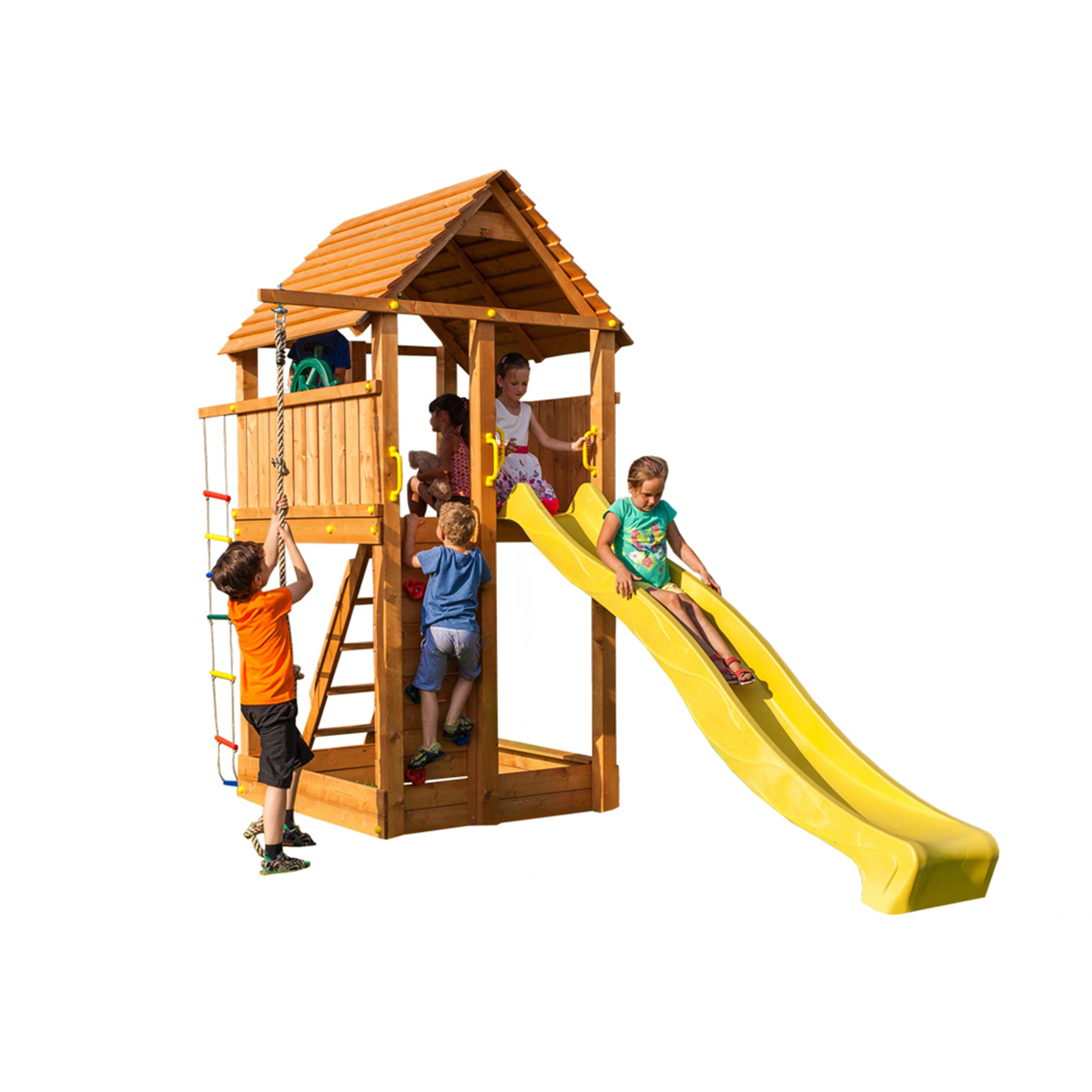 S detským ihriskom MARIMEX PLAY 004 Vaše deti zažijú veľa zábavy a budú rozvíjať svoj pohybový aparát. Ihrisko sa skladá z veže a 2,9 metra dlhej šmykľavky. Deti sa môžu dostať na vežu buď po schodíkoch s madlami, alebo vyliezť ako horolezci po horolezeckej stene. Srandu si deti tiež užijú pri šplhaní na lane alebo pri lezení po povrazovom rebríku, ktoré sú k veži pripojené. Na veži je veľa miesta na hranie a pre zábavu je tu umiestnené pirátske kormidlo. Deti sú na veži chránené zábradlím a proti slnku a dažďu drevenou strechou. Pre bezpečnosť Vašich detí sú pri šmykľavke, horolezeckej stene a rebríku madlá pre pridržanie pri vstupe a výstupe z veže. Pod vežou je umiestnený priestor s dvoma sedákmi, ktorý sa dá využívať ako pieskovisko. Ihrisko je pripevnené do zeme pomocou kotiev, ktoré bránia prevráteniu a pádu veže. Detské ihrisko MARIMEX PLAY 04 spĺňa normy EN 71 Bezpečnosti hračiek. Drevený materiál použitý na detskom ihrisku je opracovaný tak, aby znižoval riziko zranenia detí. Zároveň je impregnovaný pre dlhú životnosť a vysokú odolnosť celého ihriska. Hmotnosť 1 dieťaťa je počítaná do max. 50 kg.