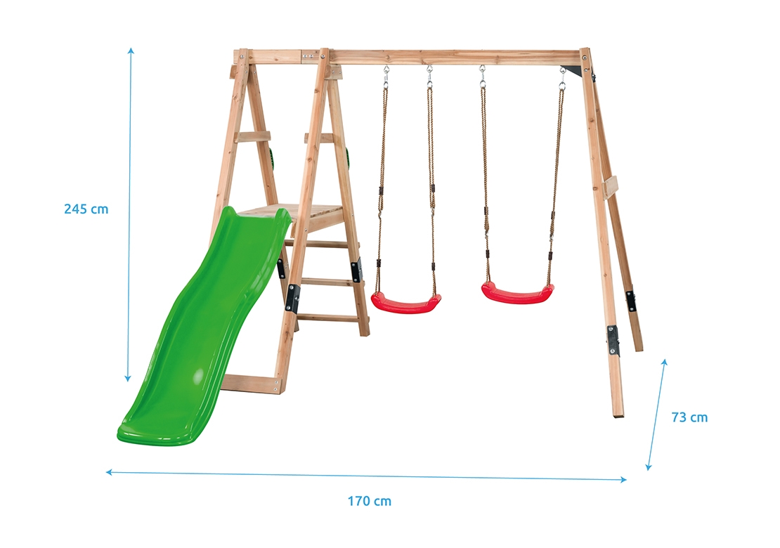 Detské ihrisko MARIMEX PLAY 023 disponuje podestou s rebríkom, 2 hojdačkami a šmykľavkou.