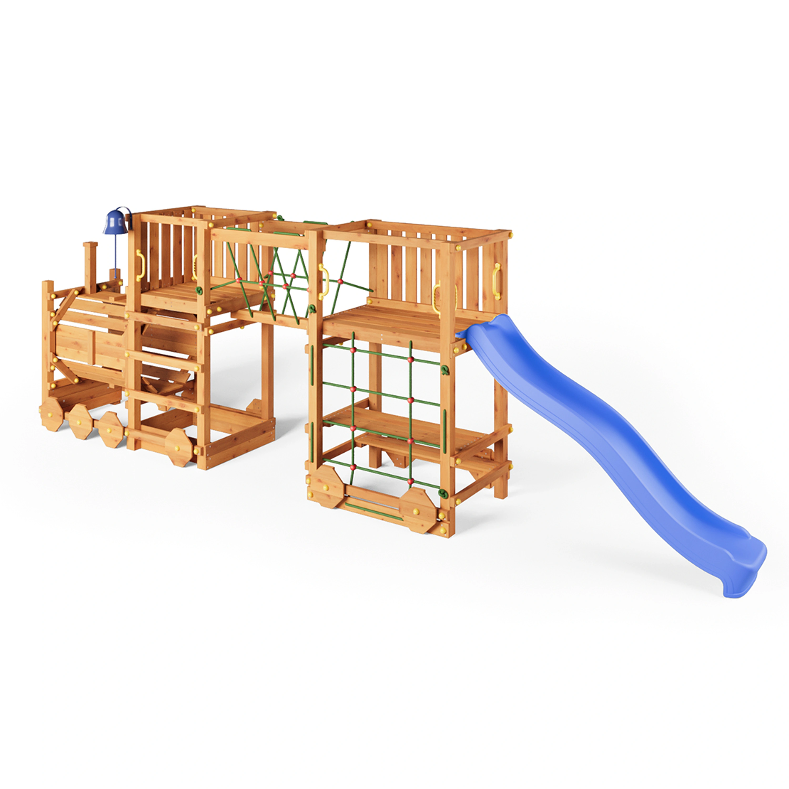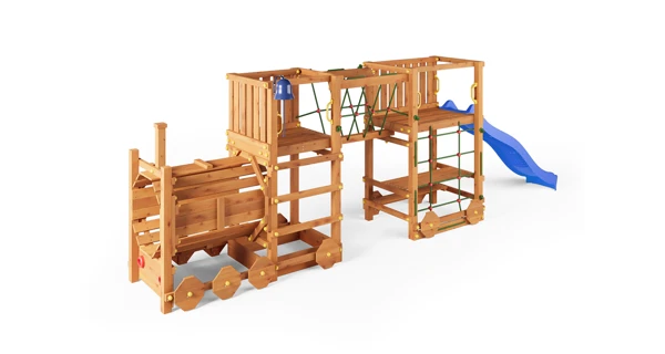 Detské ihrisko Marimex Play 025 v tvare lokomotívy prináša jedinečné spojenie zábavy, pohybu a fantázie priamo na vašu záhradu. Tento originálny herný set ponúka priestor až pre 12 detí, ktoré sa môžu vydať na dobrodružnú „jazdu“ plnú lezenia, šmýkania i objavovania. Dominantou je modrá šmykľavka s dĺžkou 2,2 m s možnosťou pripojenia vody pre ešte väčšie letné osvieženie. Vďaka bohatej výbave, ako je horolezecké lano, lezecká sieťová stena, mostík zo siete alebo tematický tunel lokomotívy, si deti užijú hodiny aktívnej zábavy. Nechýbajú ani hravé detaily, ako je Play zvonec alebo piknikový stôl pod palubou, ktoré podporujú kreatívnu hru a spoločné chvíle s kamarátmi.