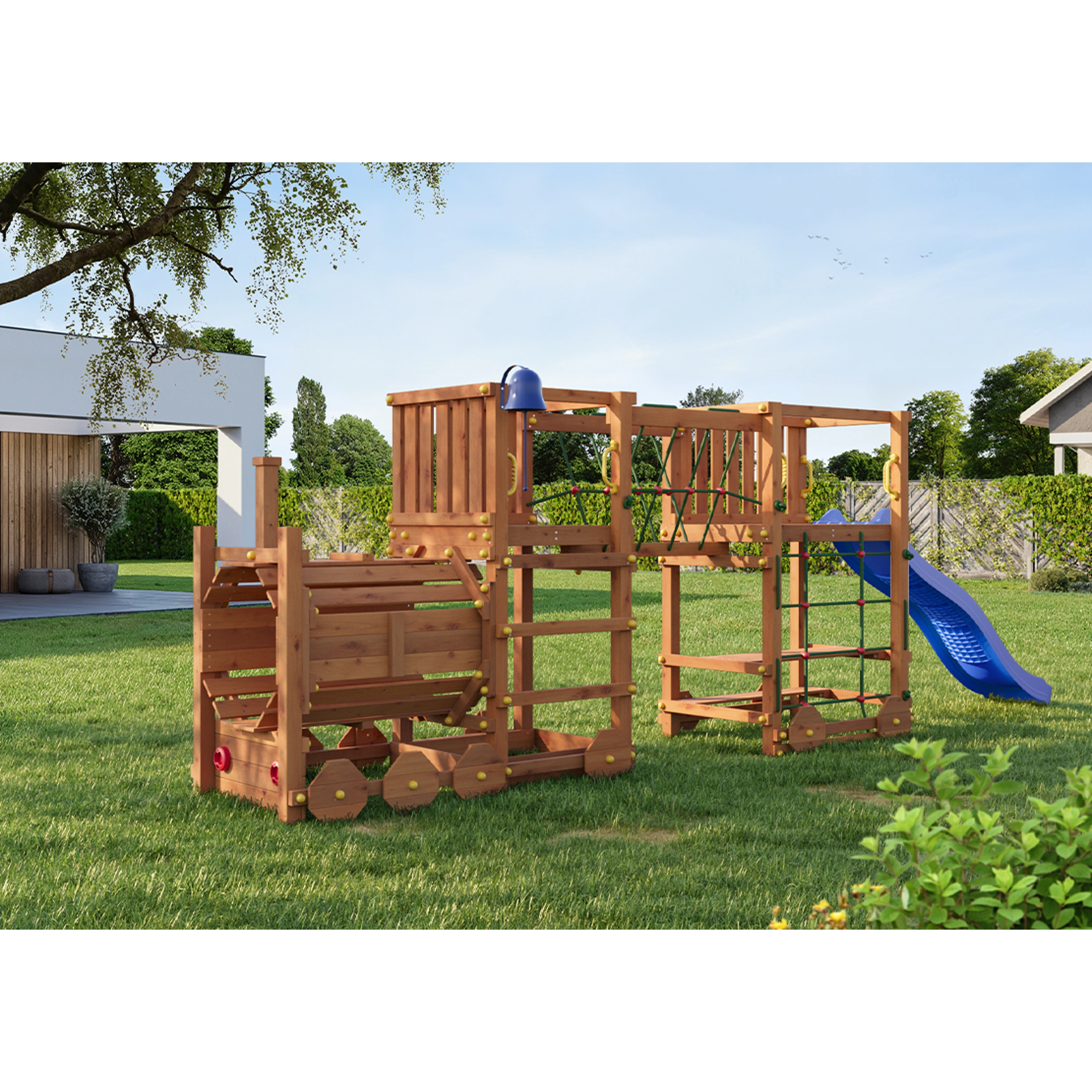 Všetky komponenty sú vyrobené z robustného plastu, odolného kovu a borovicového dreva, ktoré je povrchovo ošetrené proti nepriaznivým vplyvom počasia.