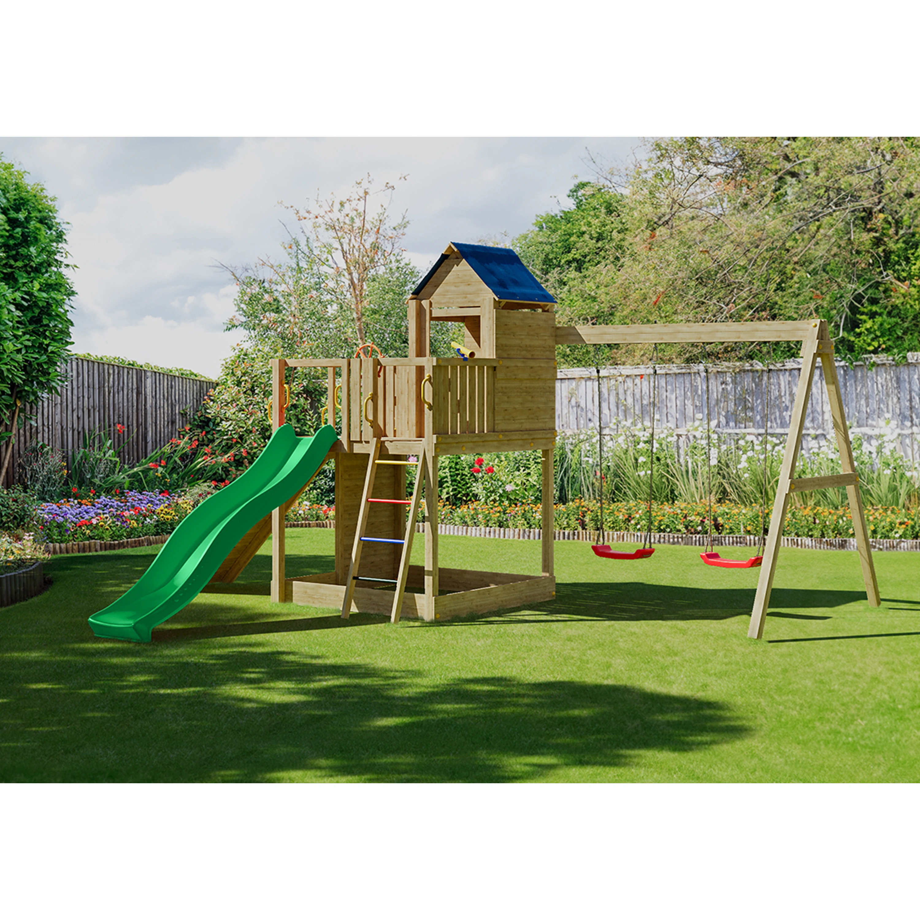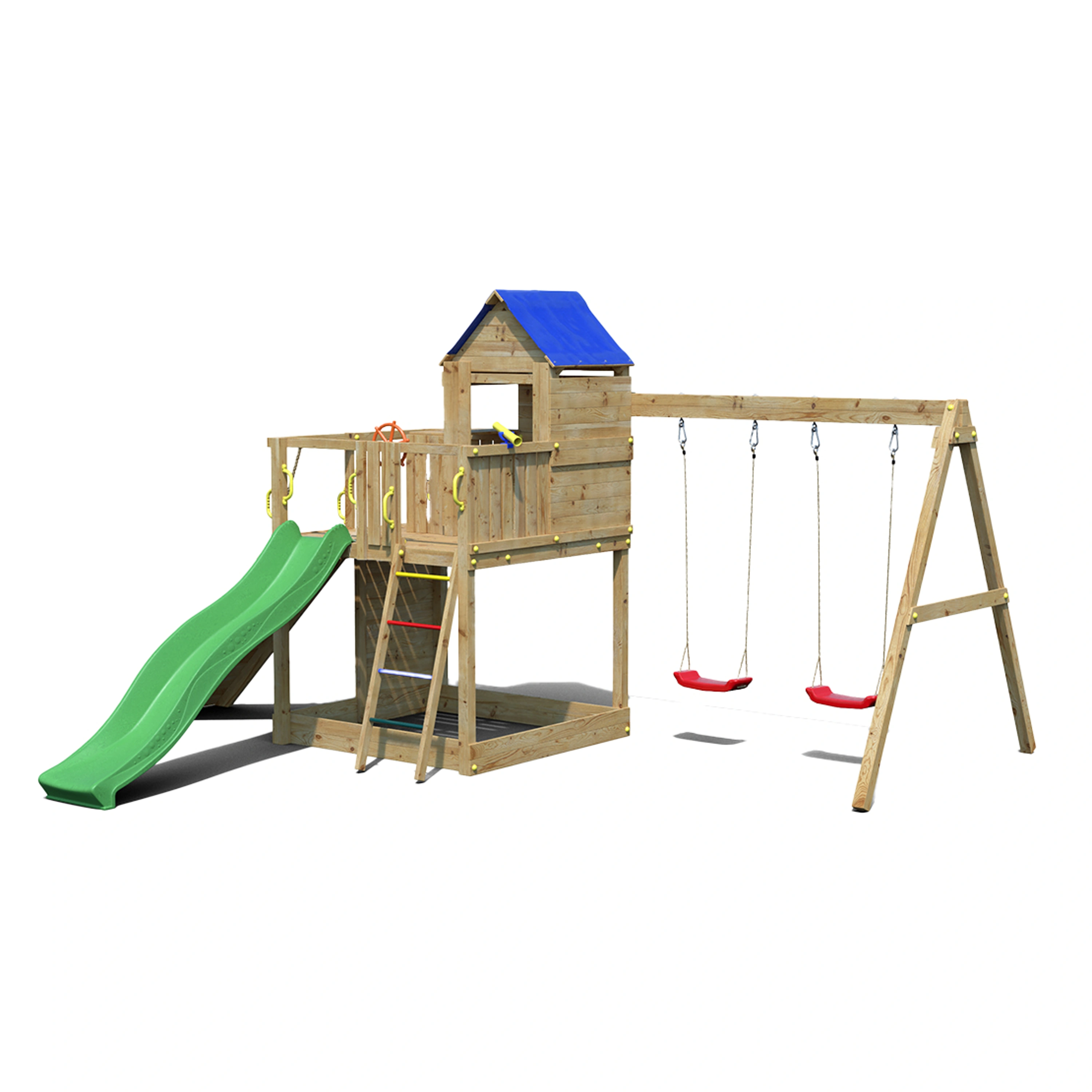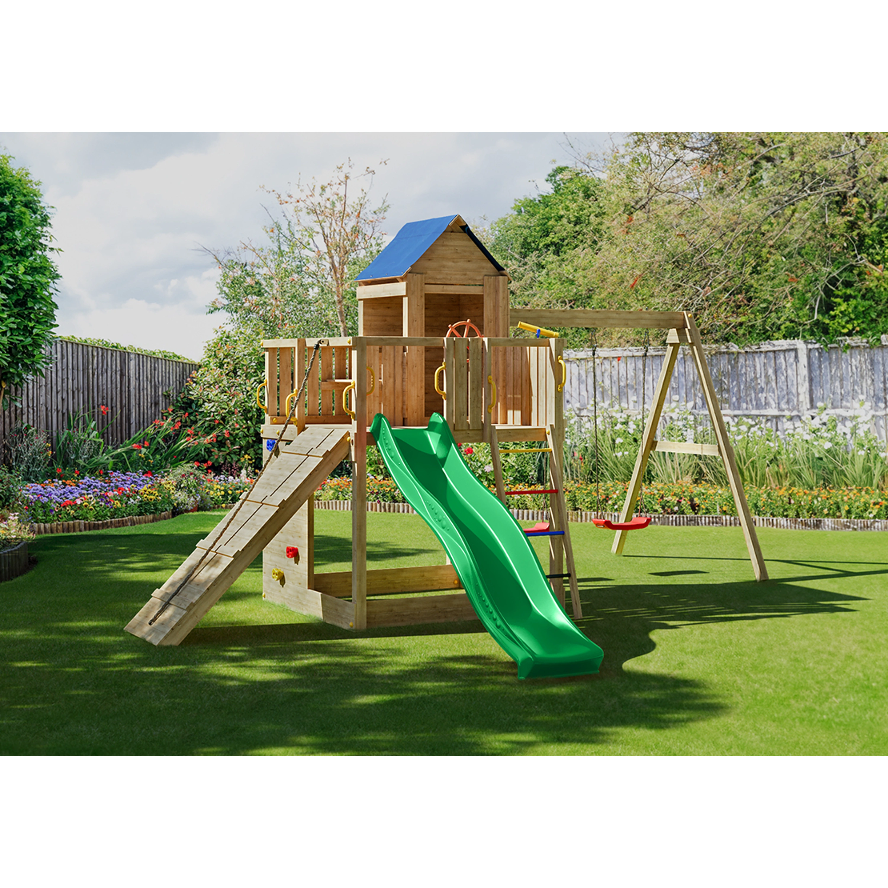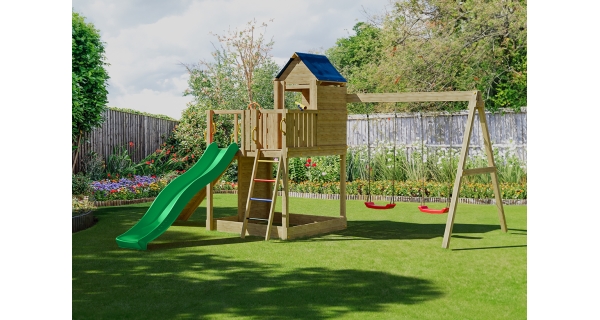 Všetky komponenty sú vyrobené z robustného plastu, odolného kovu a borovicového dreva, ktoré je povrchovo ošetrené proti nepriaznivým vplyvom počasia.