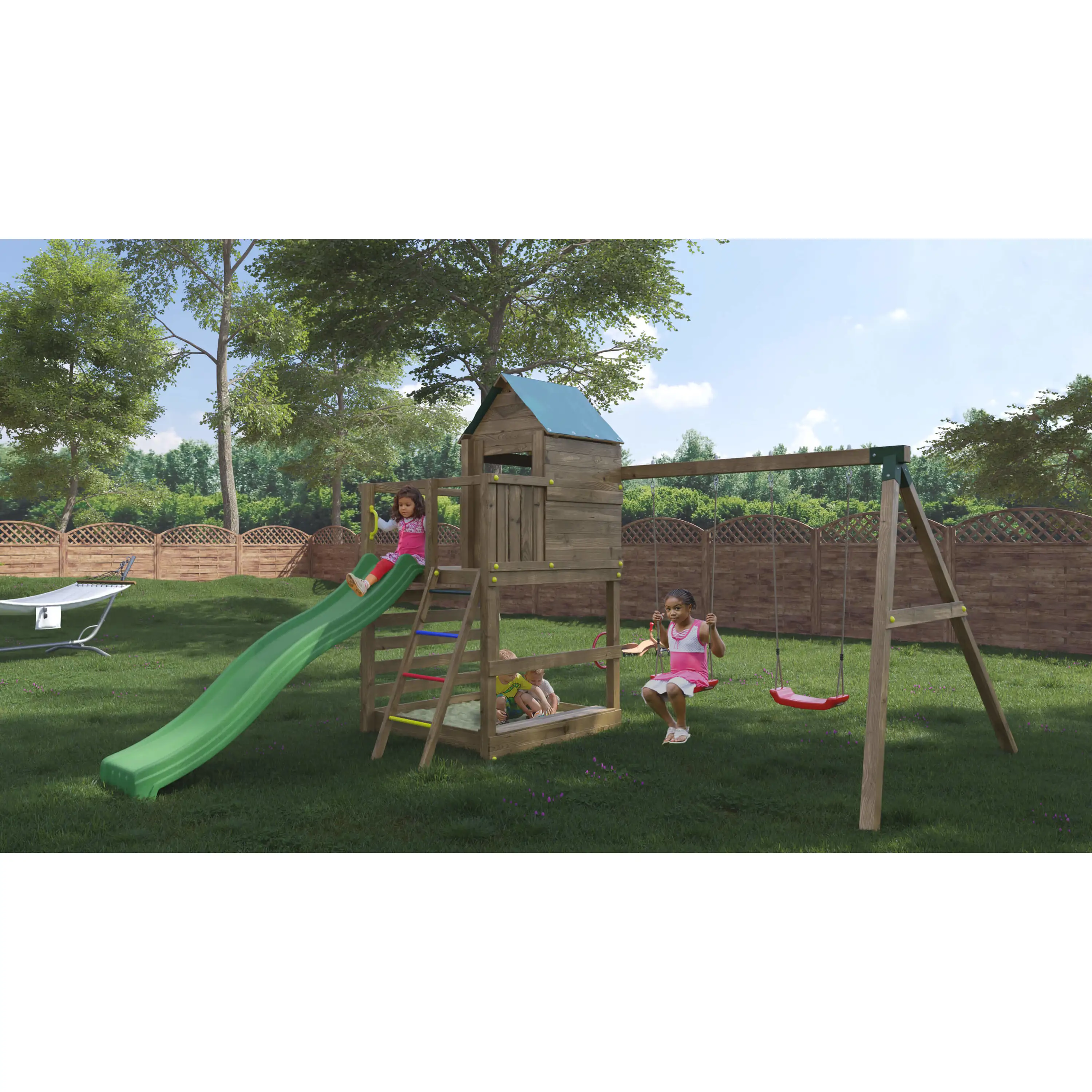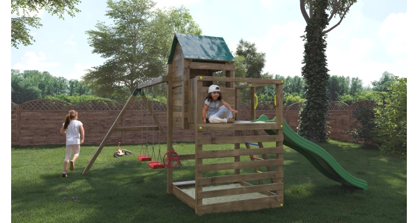 Detské ihrisko MARIMEX PLAY Basic 007 má vo výbave domček so strieškou, šmykľavku, dve hojdačky aj pieskovisko so sedadlami.