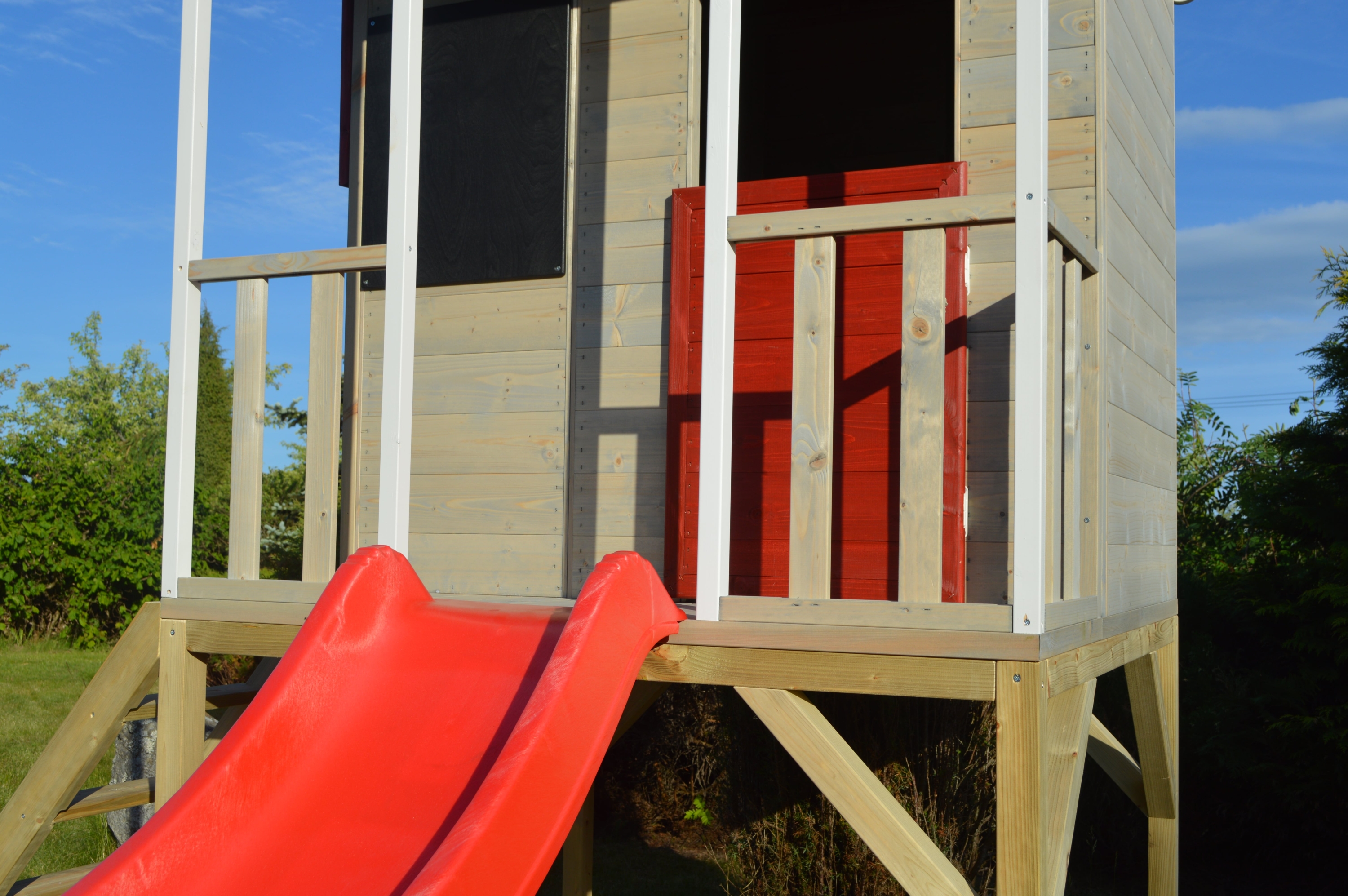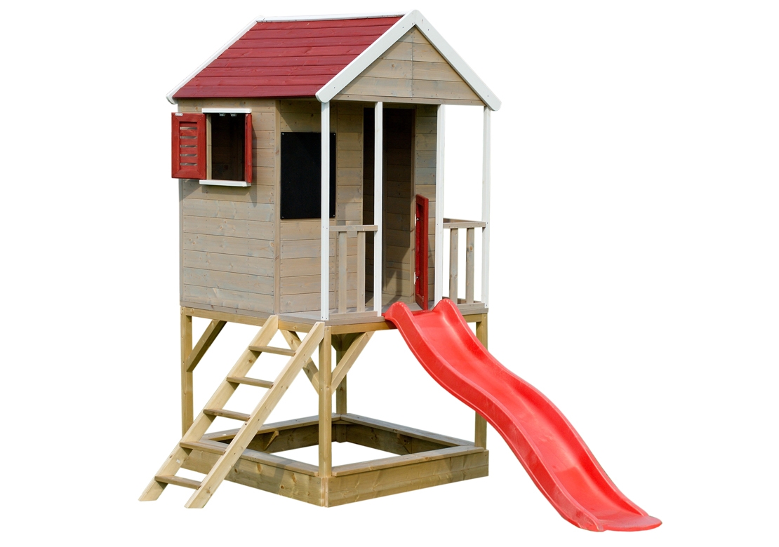 Detský drevený domček "veranda" so šmykľavkou a hojdačkou. Dom je na vyvýšenej plošine, má podlahu a krytú verandu. Radosť im urobí nielen tabuľa, ktorá je vhodná na písanie a maľovanie, ale aj šmykľavka, hojdačka s nastaviteľným sedadlom a pieskovisko so 4 sedadlami.