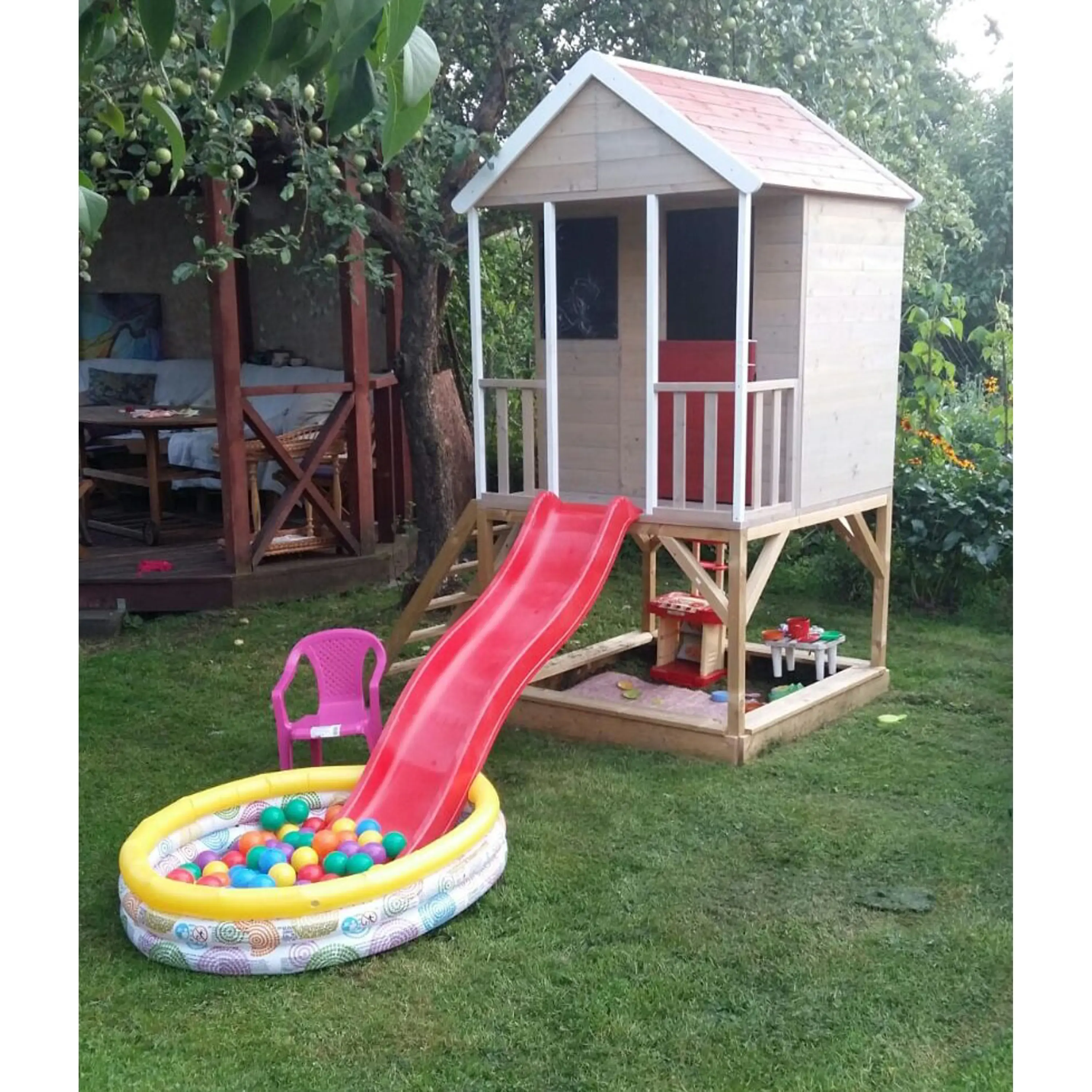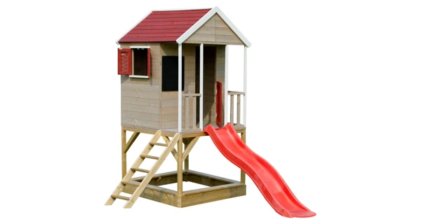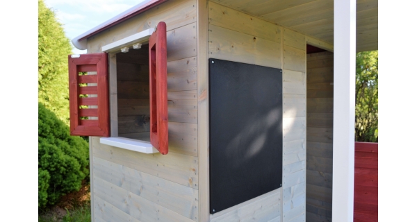 Detský drevený domček "veranda" so šmykľavkou. Dom je na vyvýšenej plošine, má podlahu a krytú verandu. Radosť im urobí nielen tabuľa, ktorá je vhodná na písanie a maľovanie, ale aj šmykľavka a pieskovisko so 4 sedadlami.