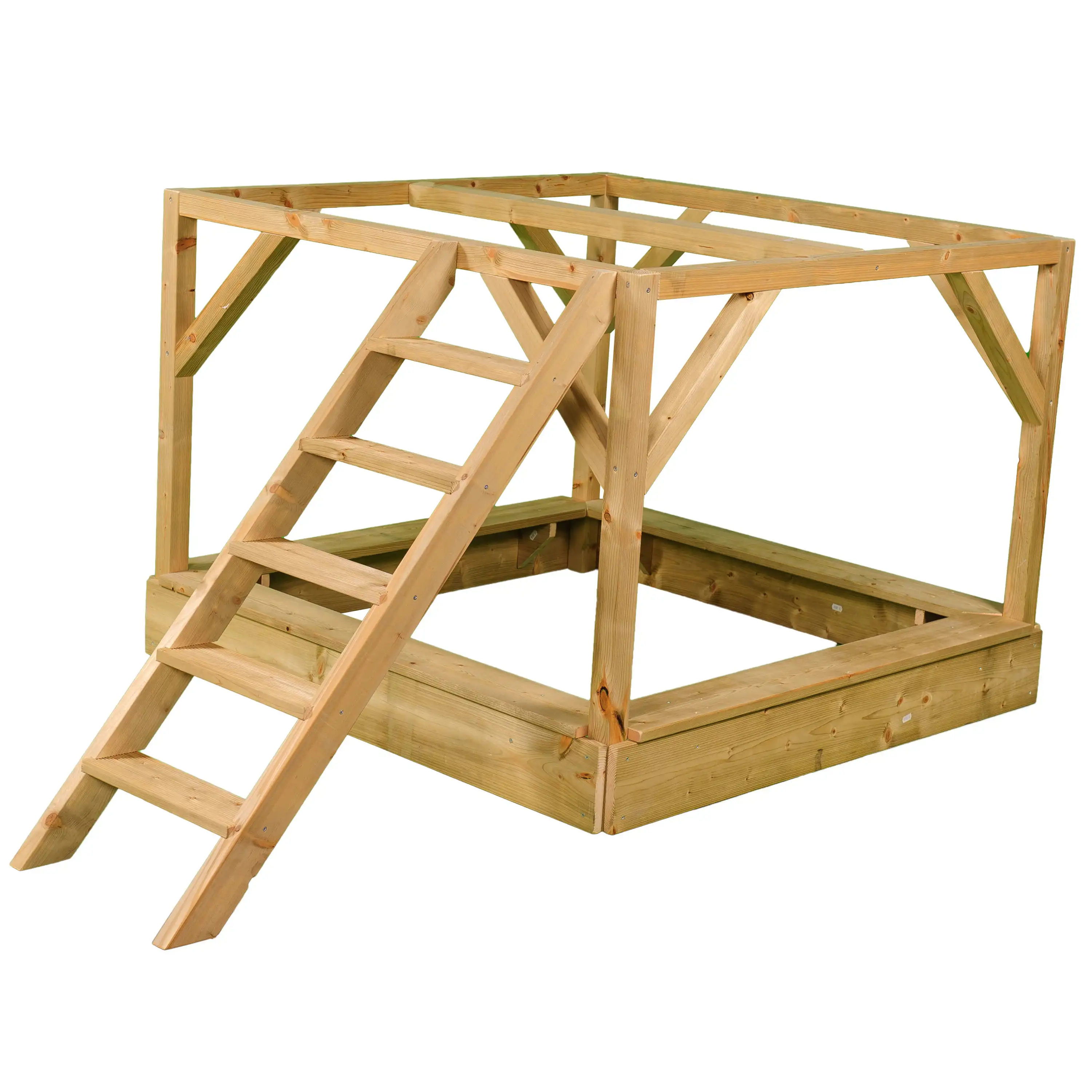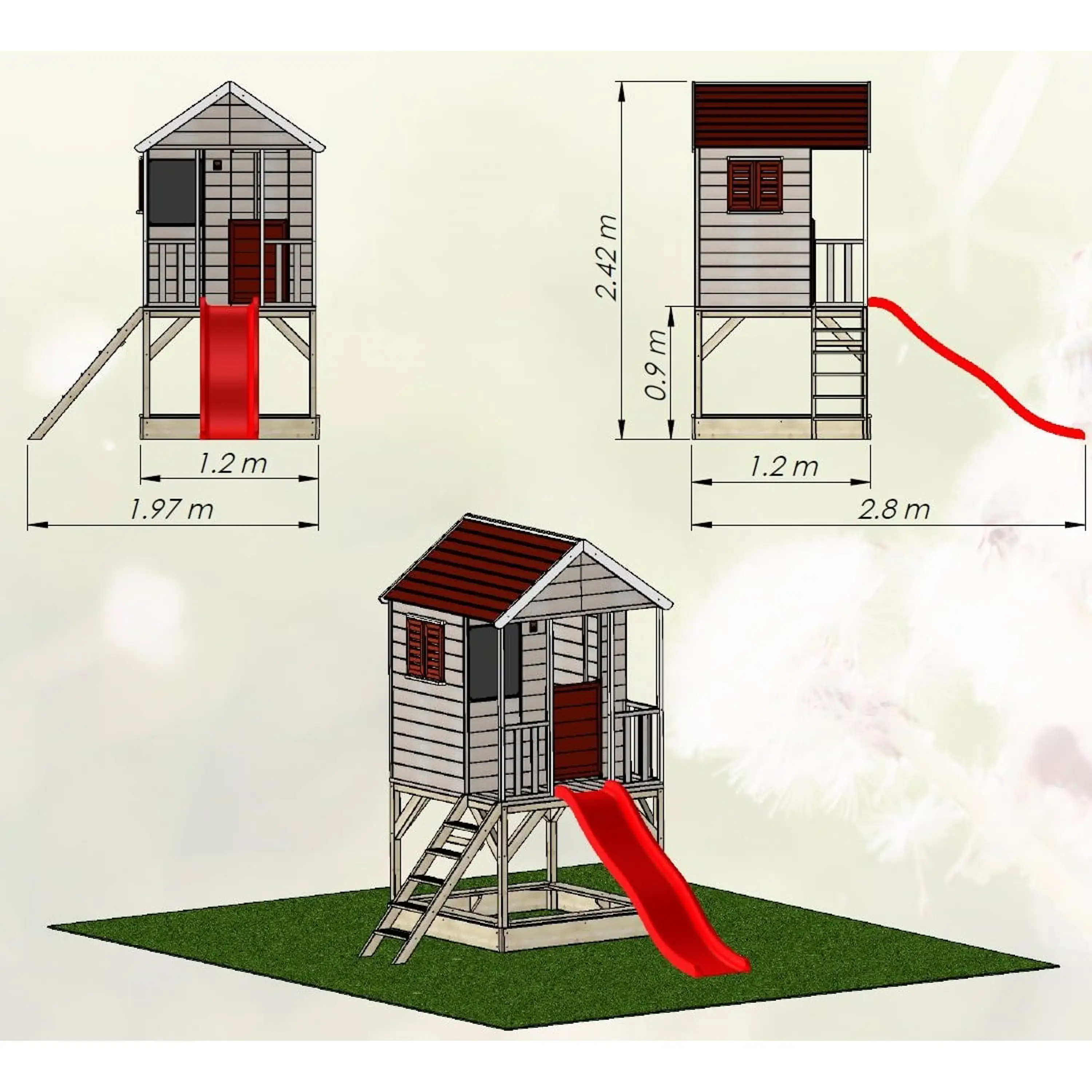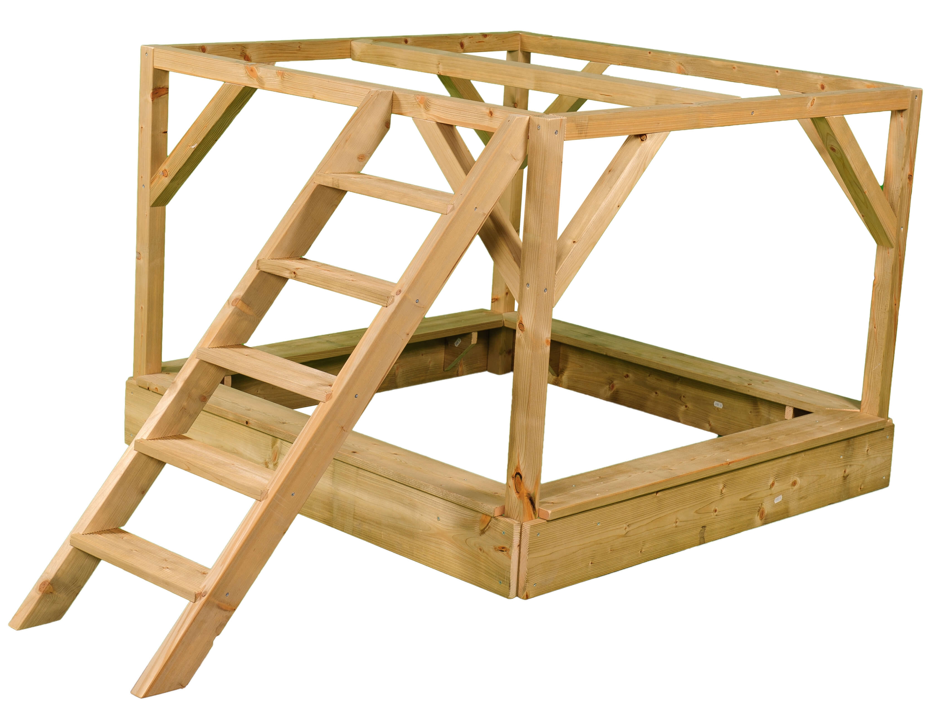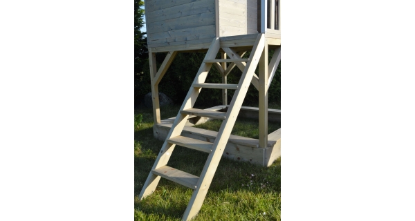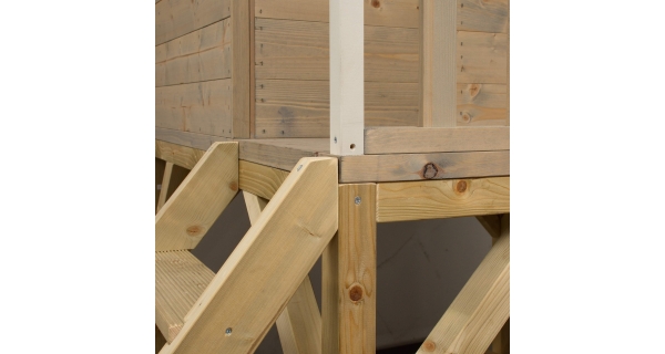 Domček na hranie sa dodáva v rozloženom stave z prefabrikovaných dielov vrátane spojovacieho materiálu. Celé steny a podlaha, ktoré je potrebné len priskrutkovať. Iba strecha je zostavená z jednotlivých dosiek, ktoré do seba zapadajú. Plošina sa dodáva aj v rozloženom stave (jednotlivé nosníky). Drevo je povrchovo upravené ochranným náterom.
