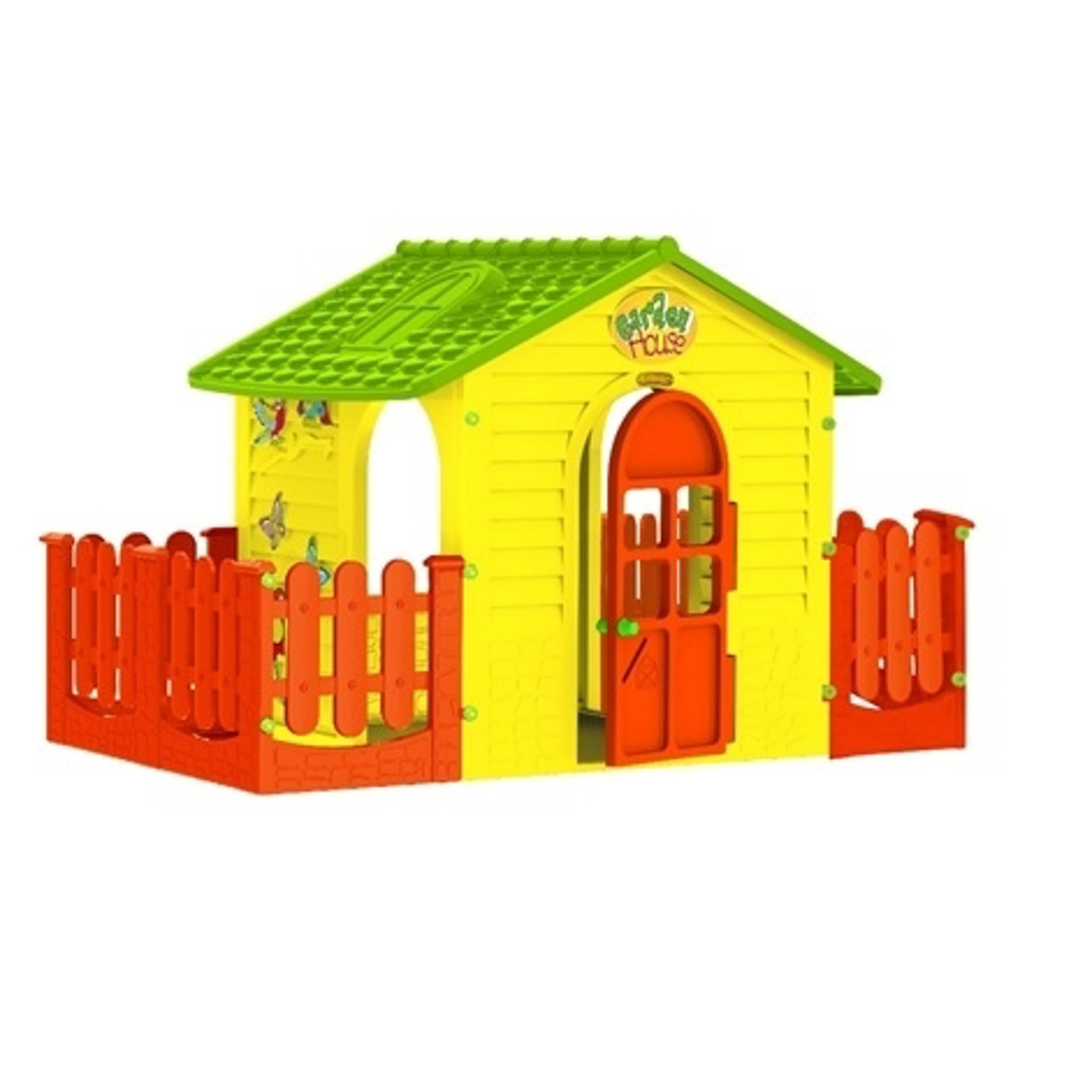 Hrací domček je ideálny na záhradu, kde zaručia deťom skutočnú zábavu. Ako správny domček má červené vstupné dvere, ktoré možno otvoriť za guľatou kľučku alebo prípadne za jedno zo štyroch okienok. Vchod do domčeka je možný aj zo zadnej časti, ktorá je úplne odkrytá. Veľké okná po stranách domčeka umožňujú priechod na záhradku, ktorá je z oboch strán oplotená. Vonkajšie hrátky môžu pokračovať aj za mierneho dažďa, pretože domček je opatrený zelenou strechou. Hrací domček je ponúkaný vo farebnej kombinácii žltej, červenej a zelenej.