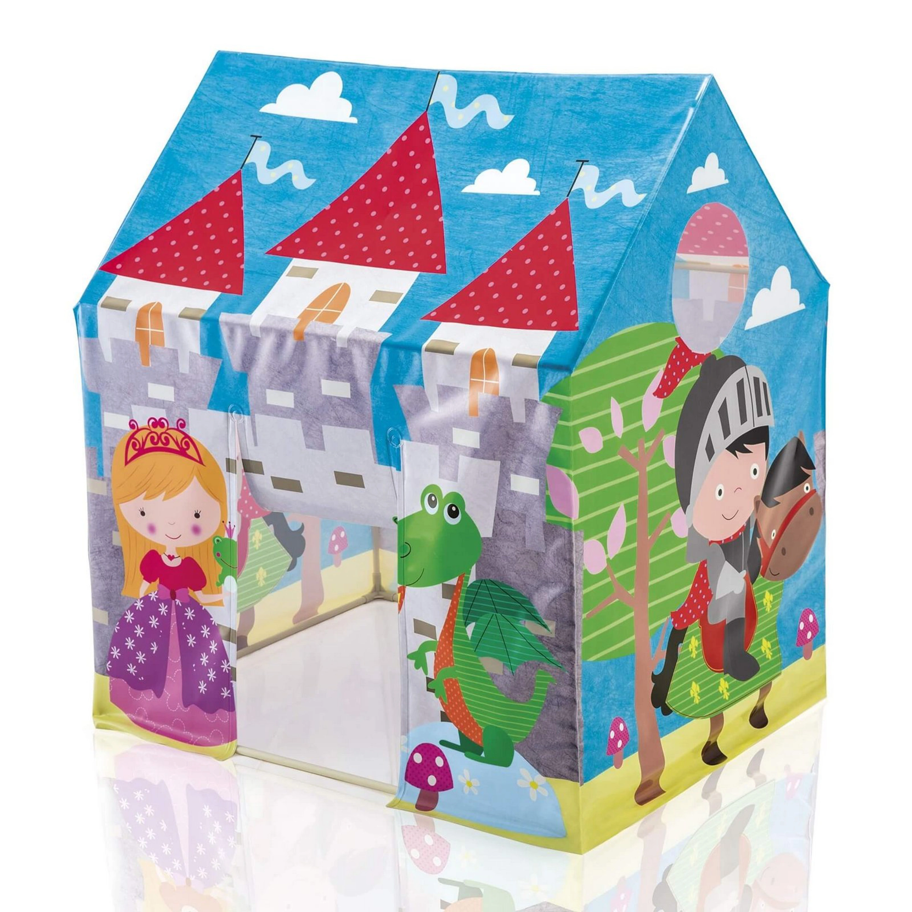 Pestrofarebný hrací domček sľubuje skvelú zábavu v detskej izbe, v detskom kútiku alebo napríklad na záhrade. Domček má vonkajšie strany s motívom lesa, hradu, princeznej, rytiera a draka.