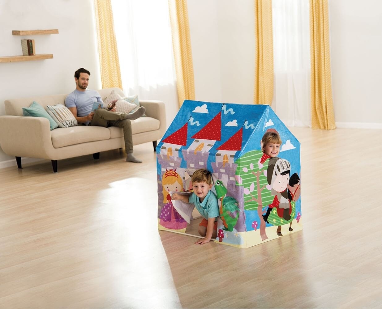 Deti sa tak môžu doslova preniesť do rozprávkového sveta. Má uzatvorenú striešku, vchod v tvare obdlžníka a okrúhle okienko. Do domčeka sa môžu skryť až 2 deti. Stan nemá vnútornú podlahu, pre lepšie pohodlie je vhodné vložiť do vnútra deku.
