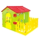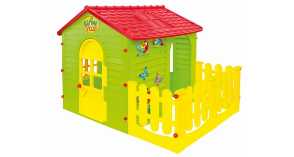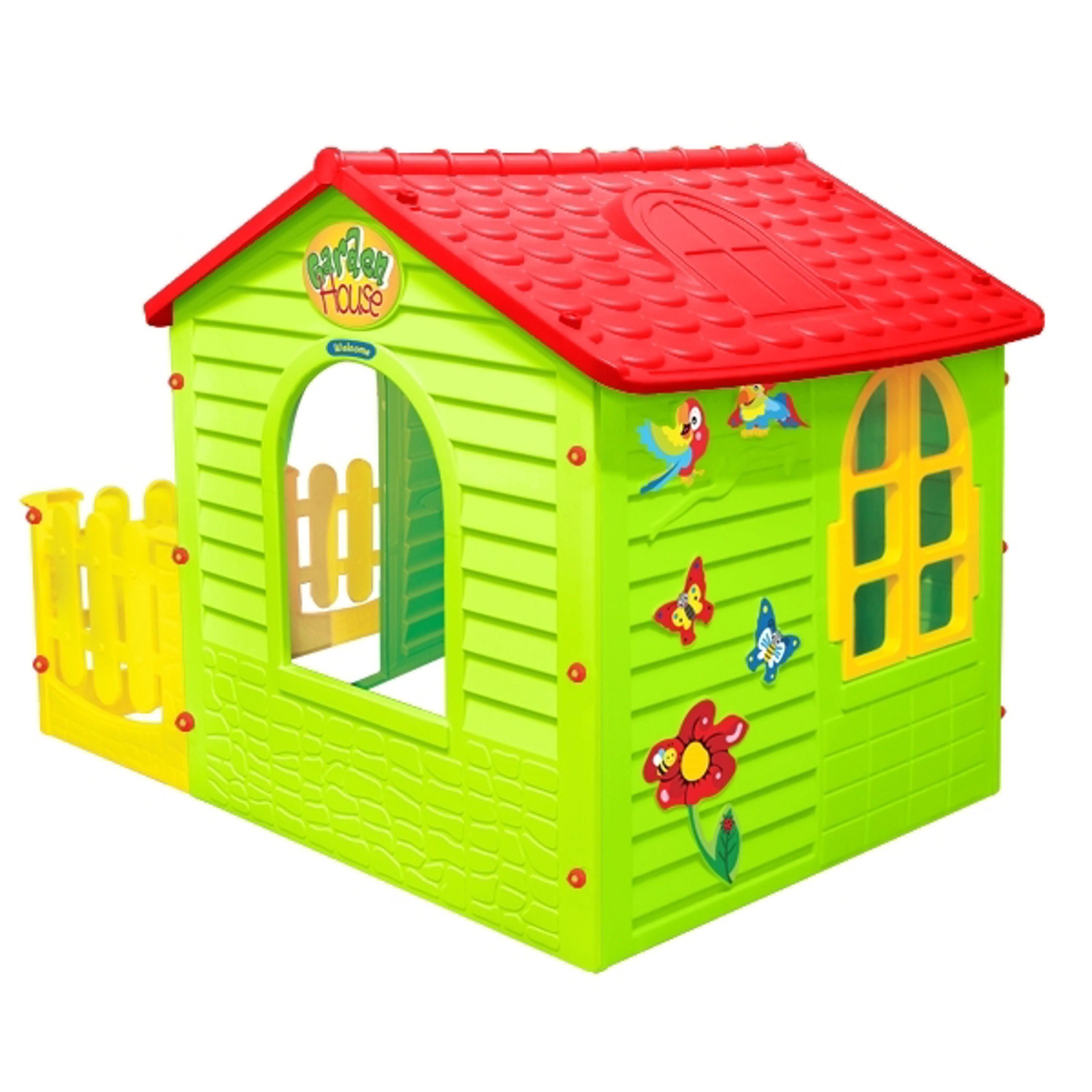 Plastový záhradný domček v zelenom prevedení s jasne červenou strechou. Domček má vstupné dvere a okná s okenicami aj bez nich. Priestranný interiér ponúka hru pre viac detí naraz. Pri domčeku je malá záhradka ohraničená plotom. Na záhradku možno vojsť z domčeka. Zahradný domček vo farebnom prevedení je vhodný na každú záhradu.